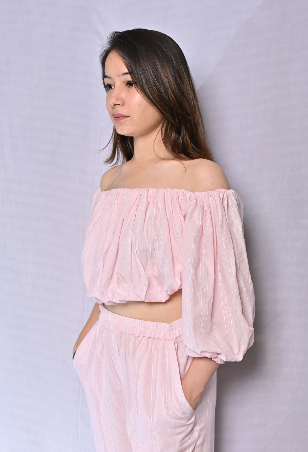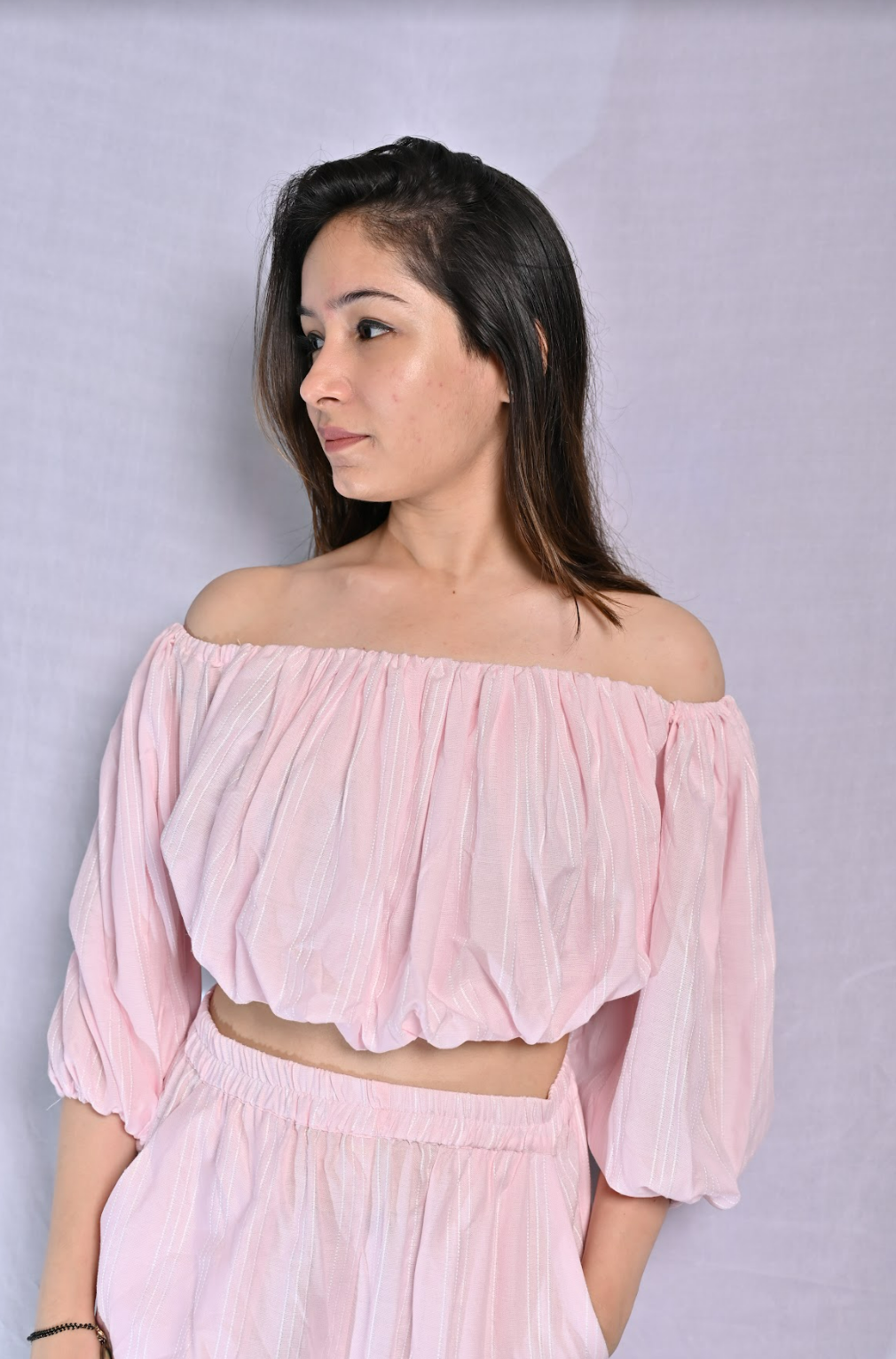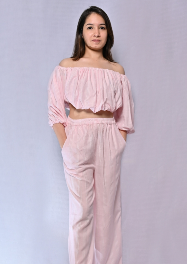 The Baby Pink Off Shoulder Co-ord Set, is off-shoulder and it has 3/4th sleeves. Sleeves are balloon shaped.