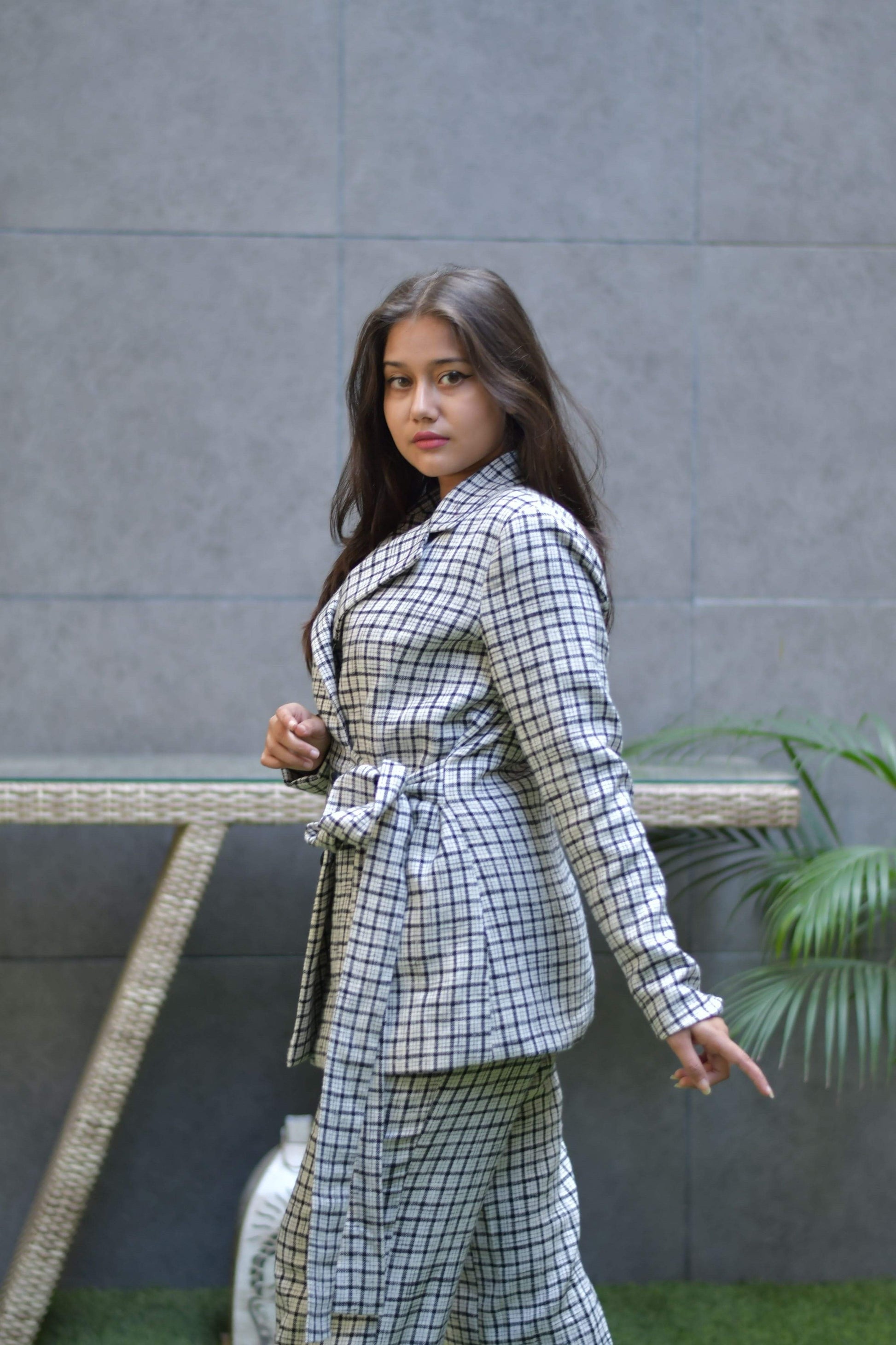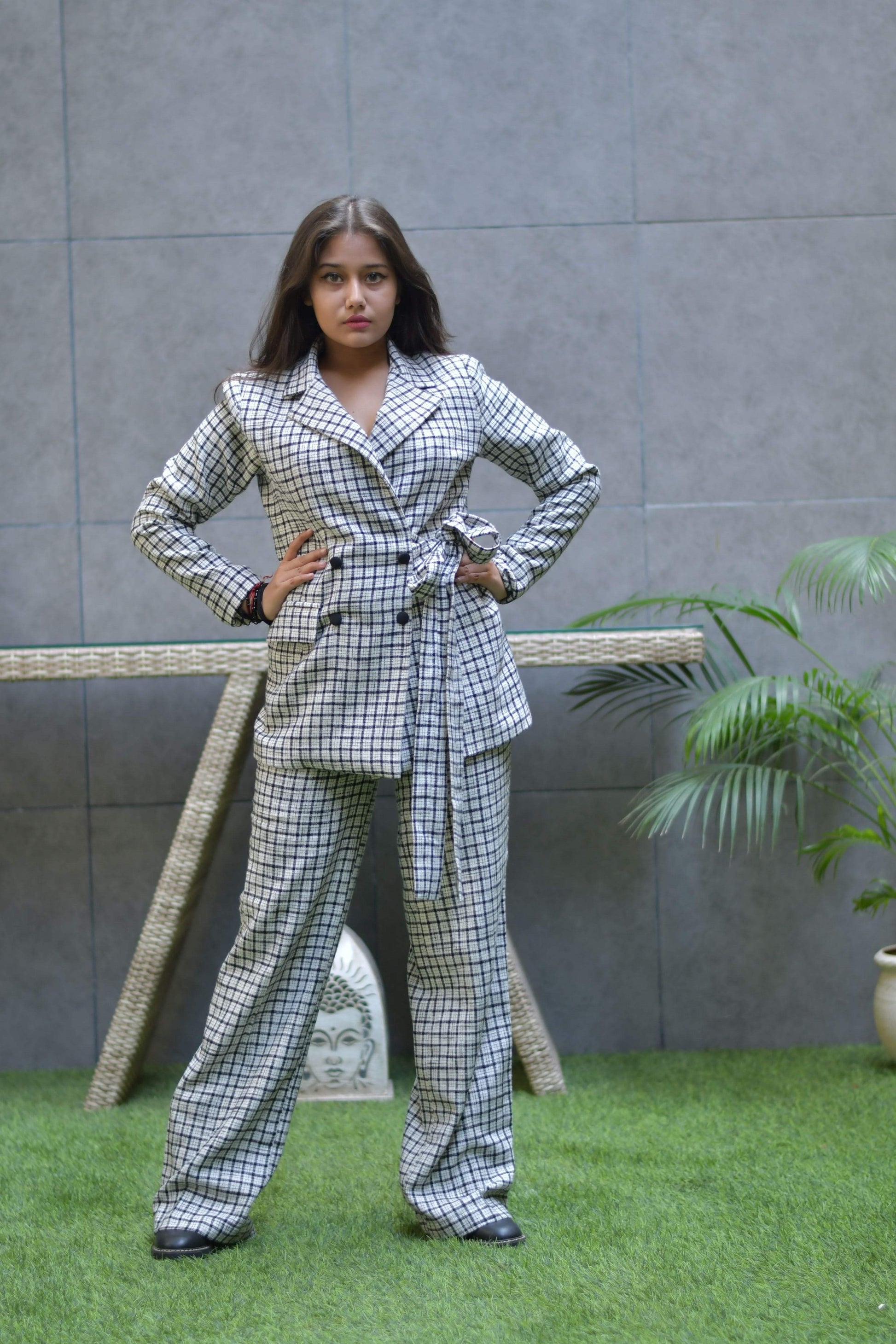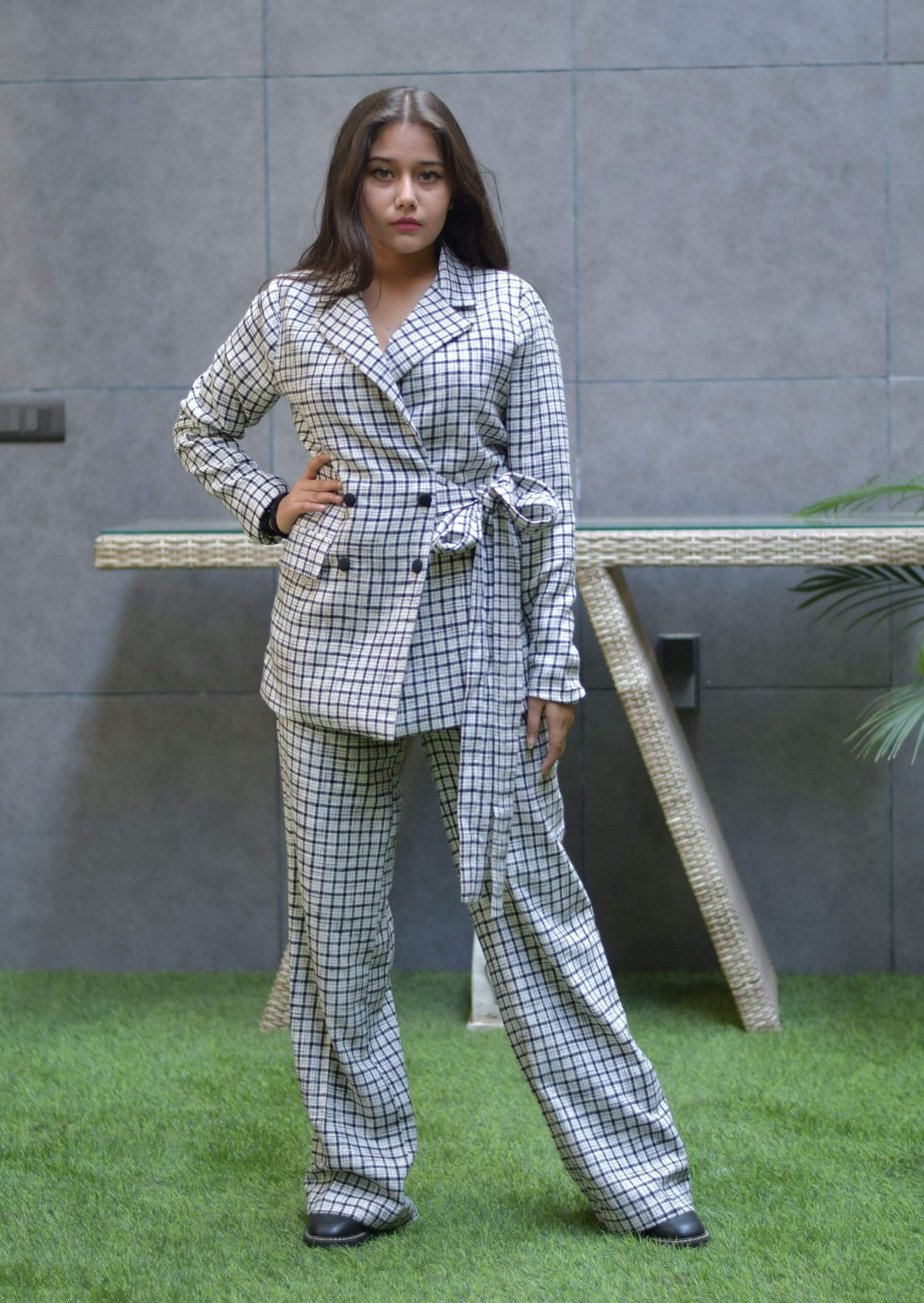 Black and white tweed set featuring blazer with pants , side tie able belt with buttons.