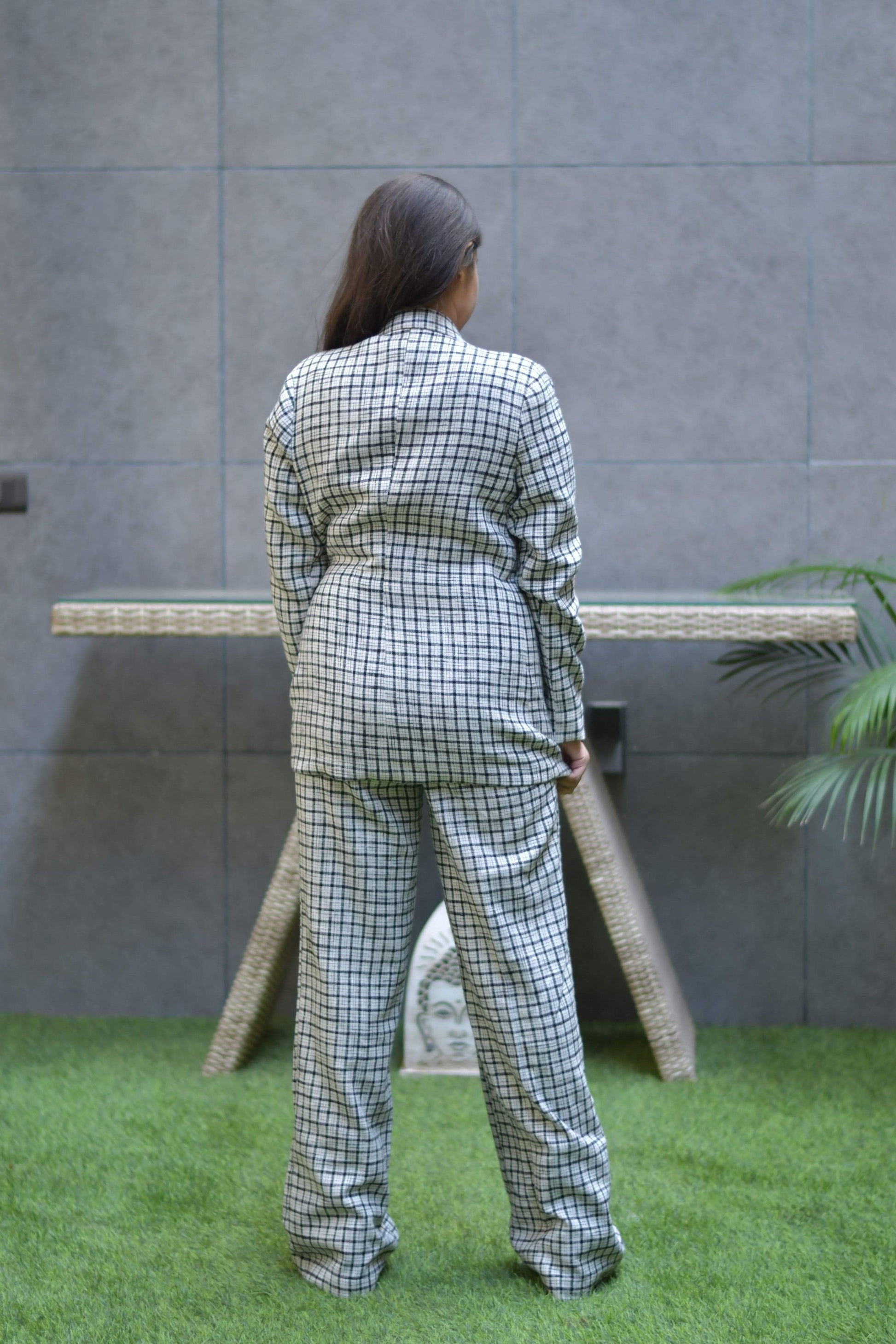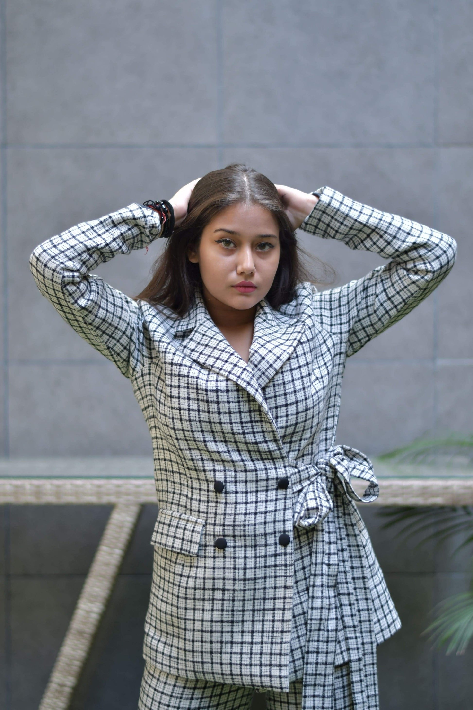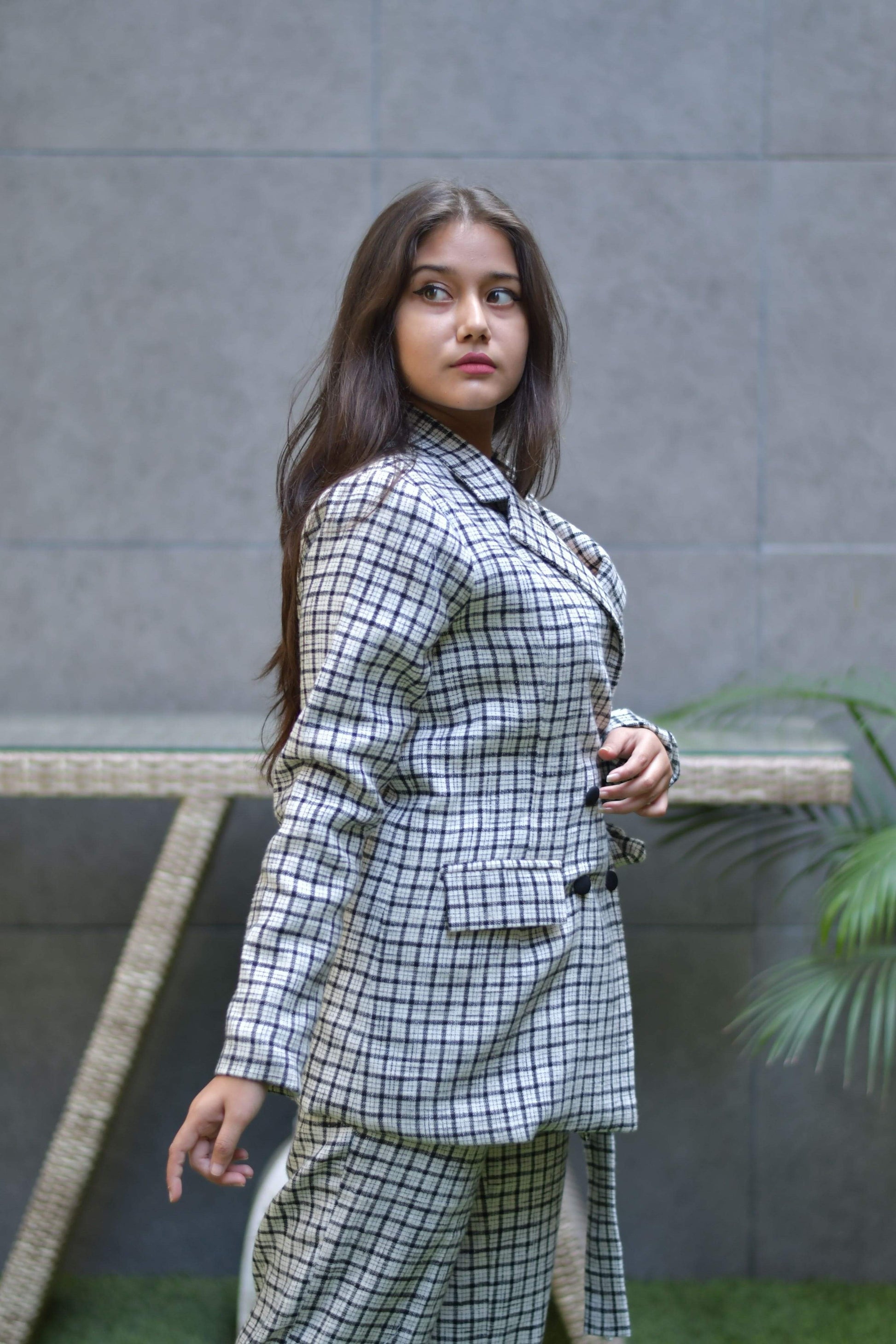 Black and white tweed set featuring blazer with pants , side tie able belt with buttons.
