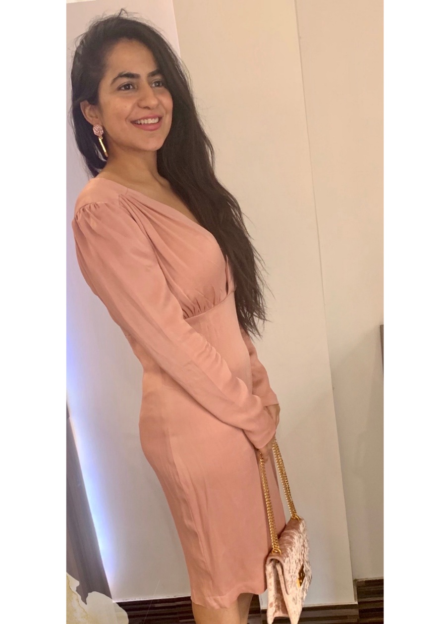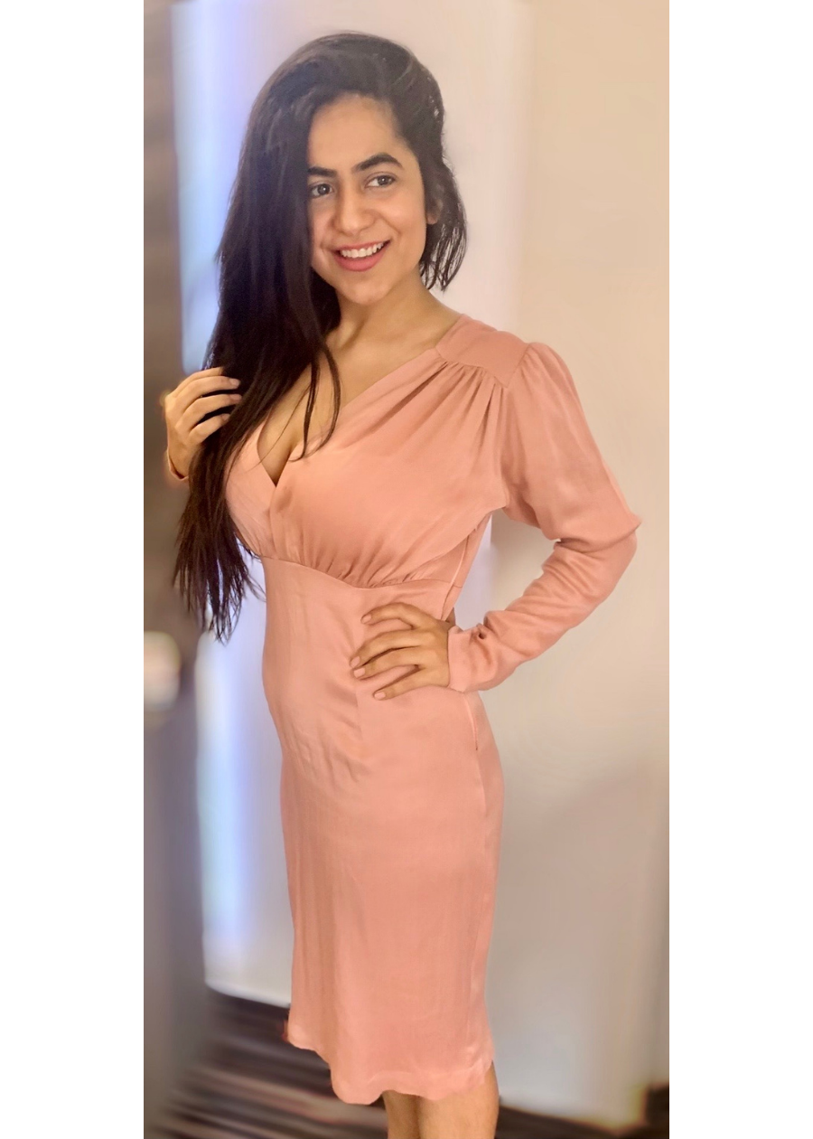 Dusky pink bubble satin statement dress highlighting pleated yoke and full sleeves.