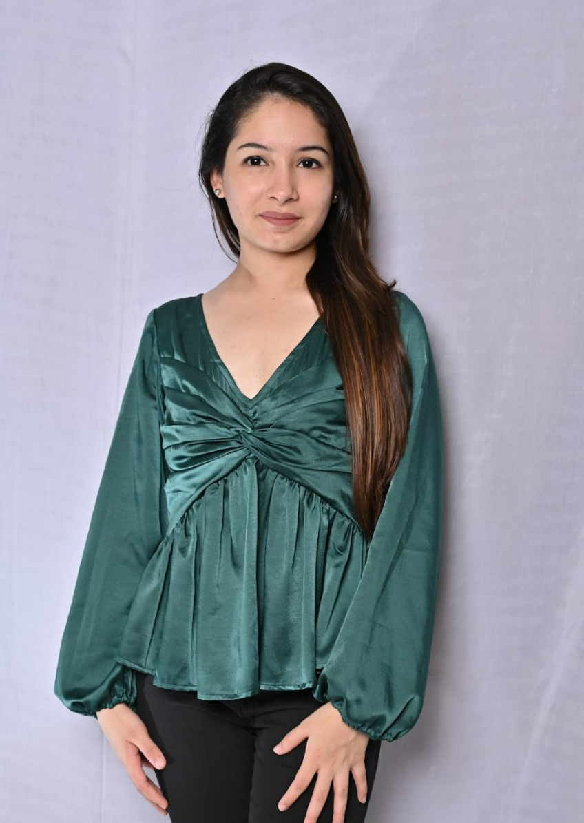 A Bottle Green satin fabric, comes in peplum shape, V-neck and balloon sleeves.