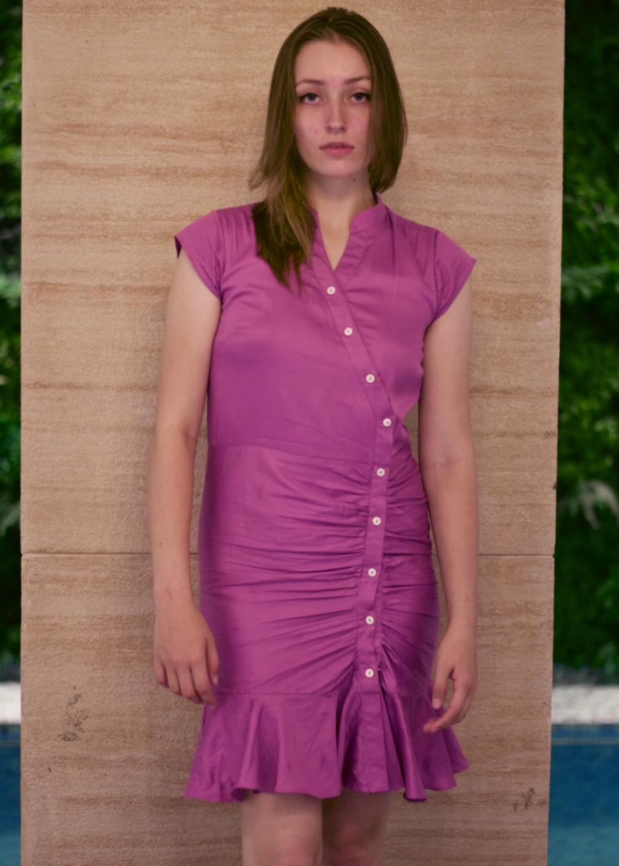 Magenta front buttoned dress with drapes around the hip with frill on the hem.