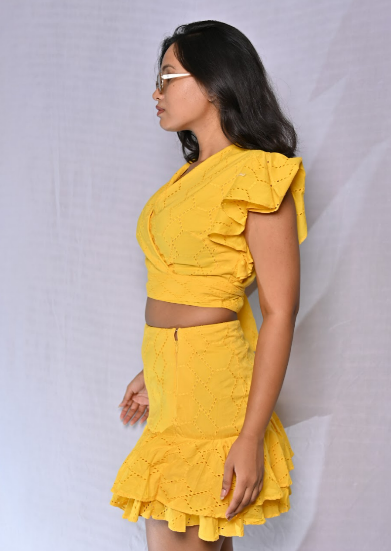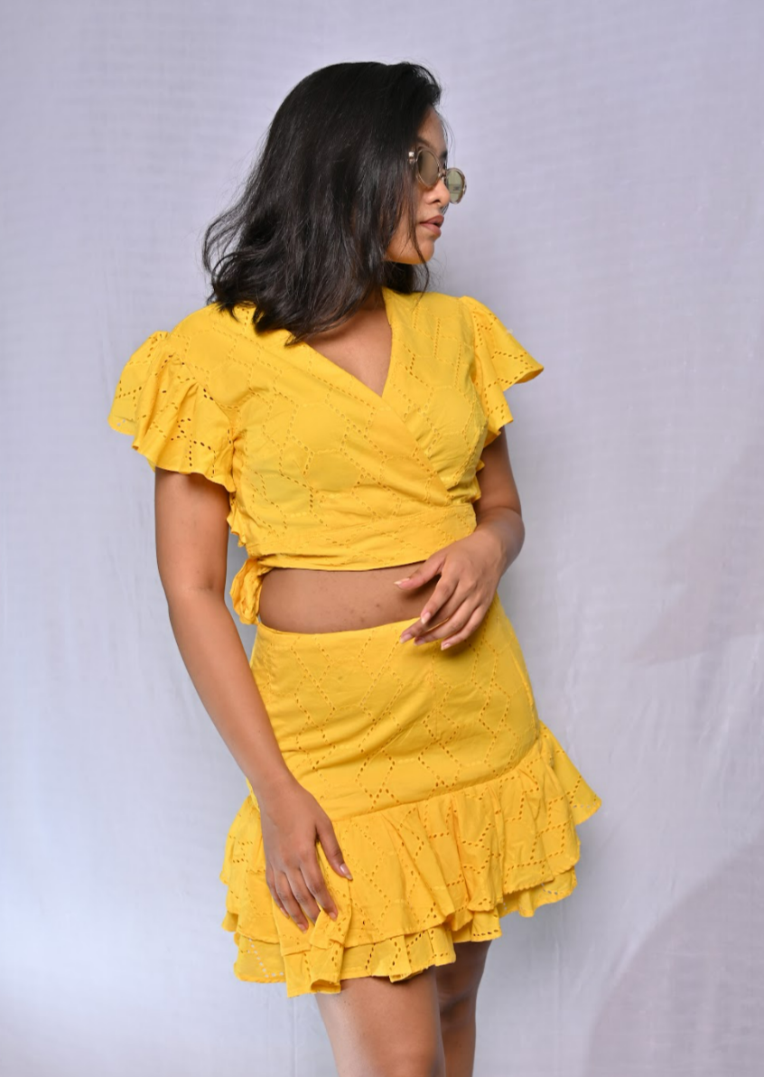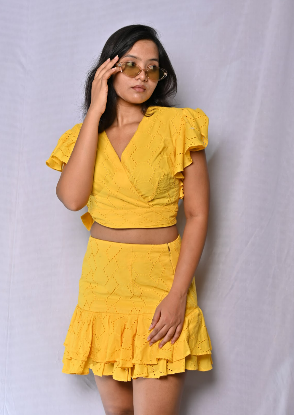 Yeloow co-ord Set, Chiken fabric. Yellow v-neck wrap top, waist tie up and short ruffle style skirt