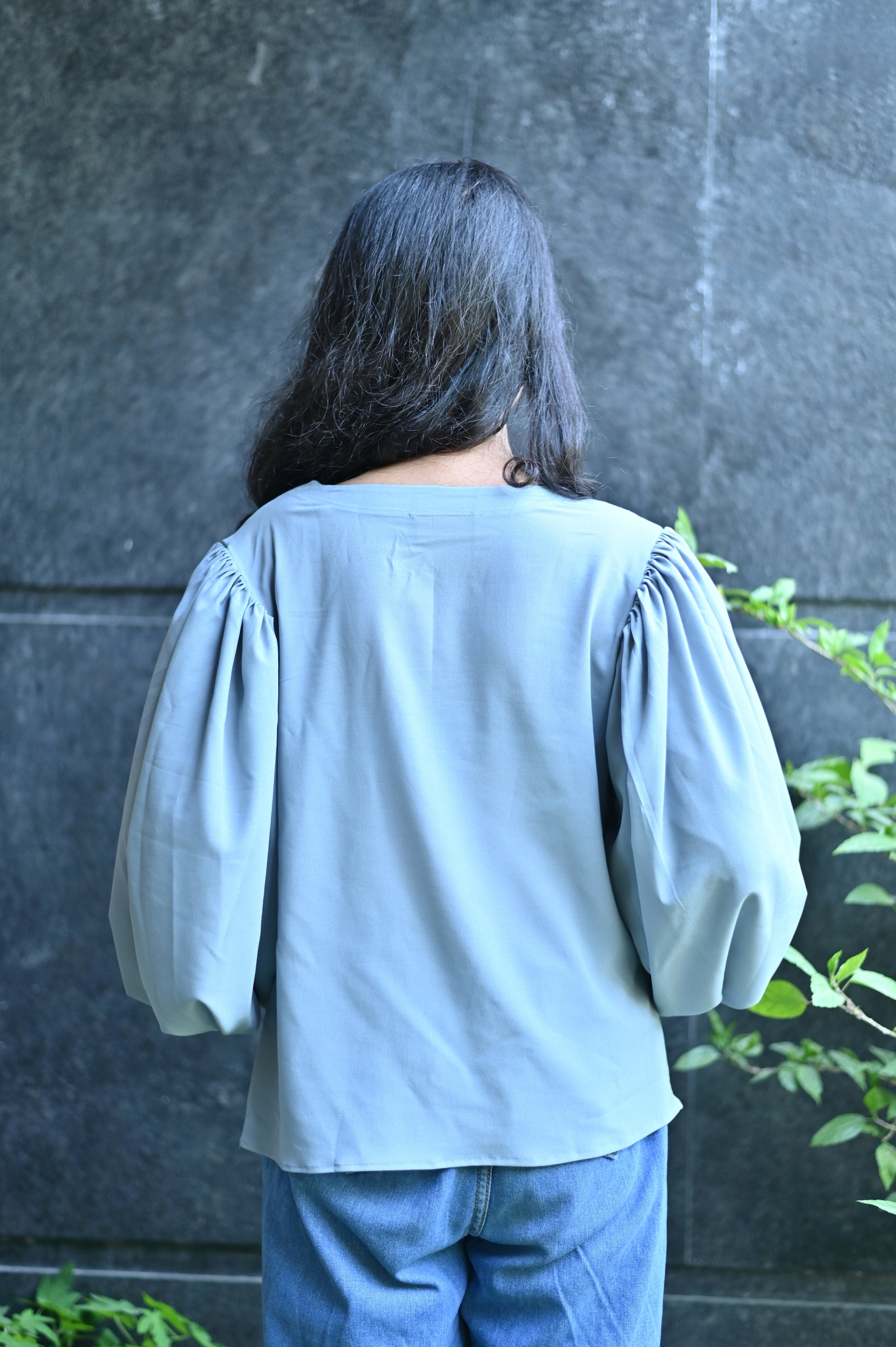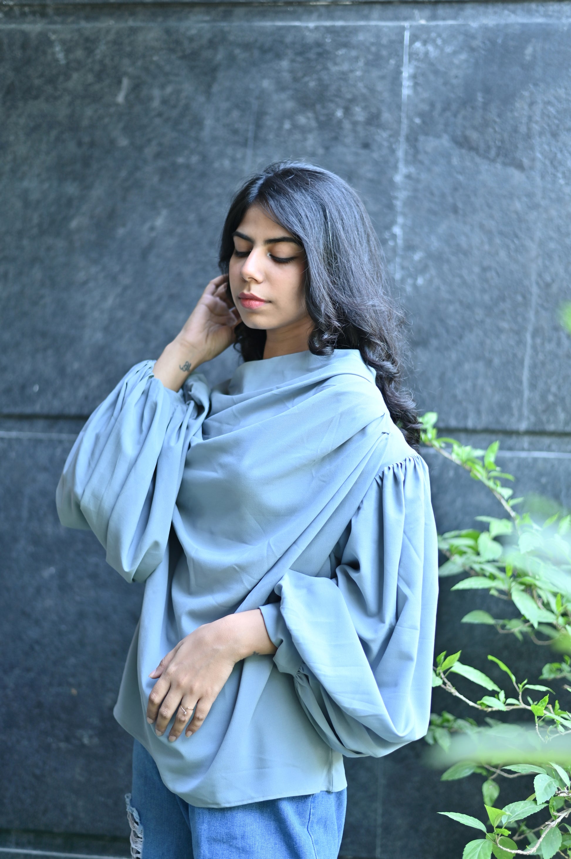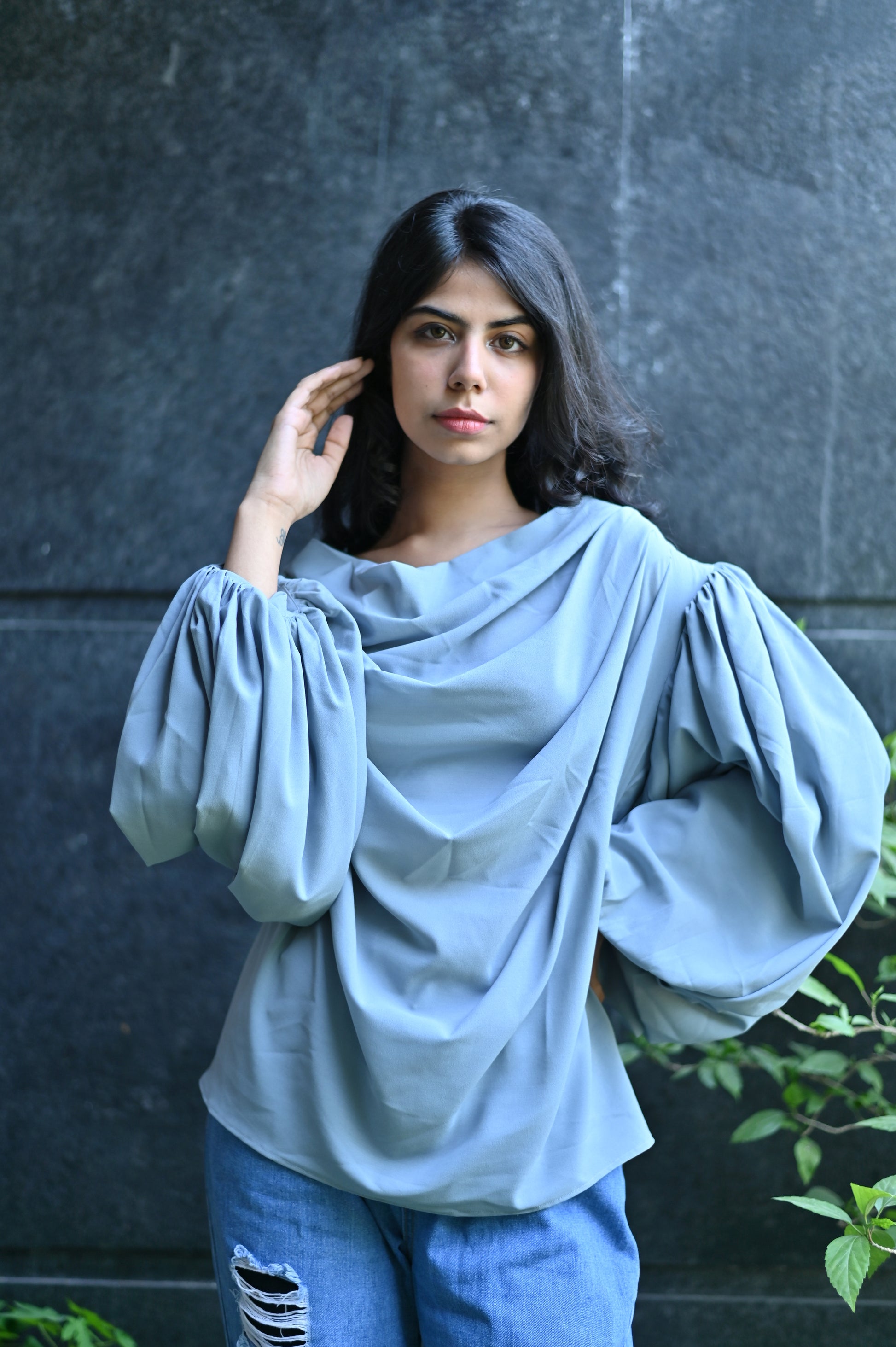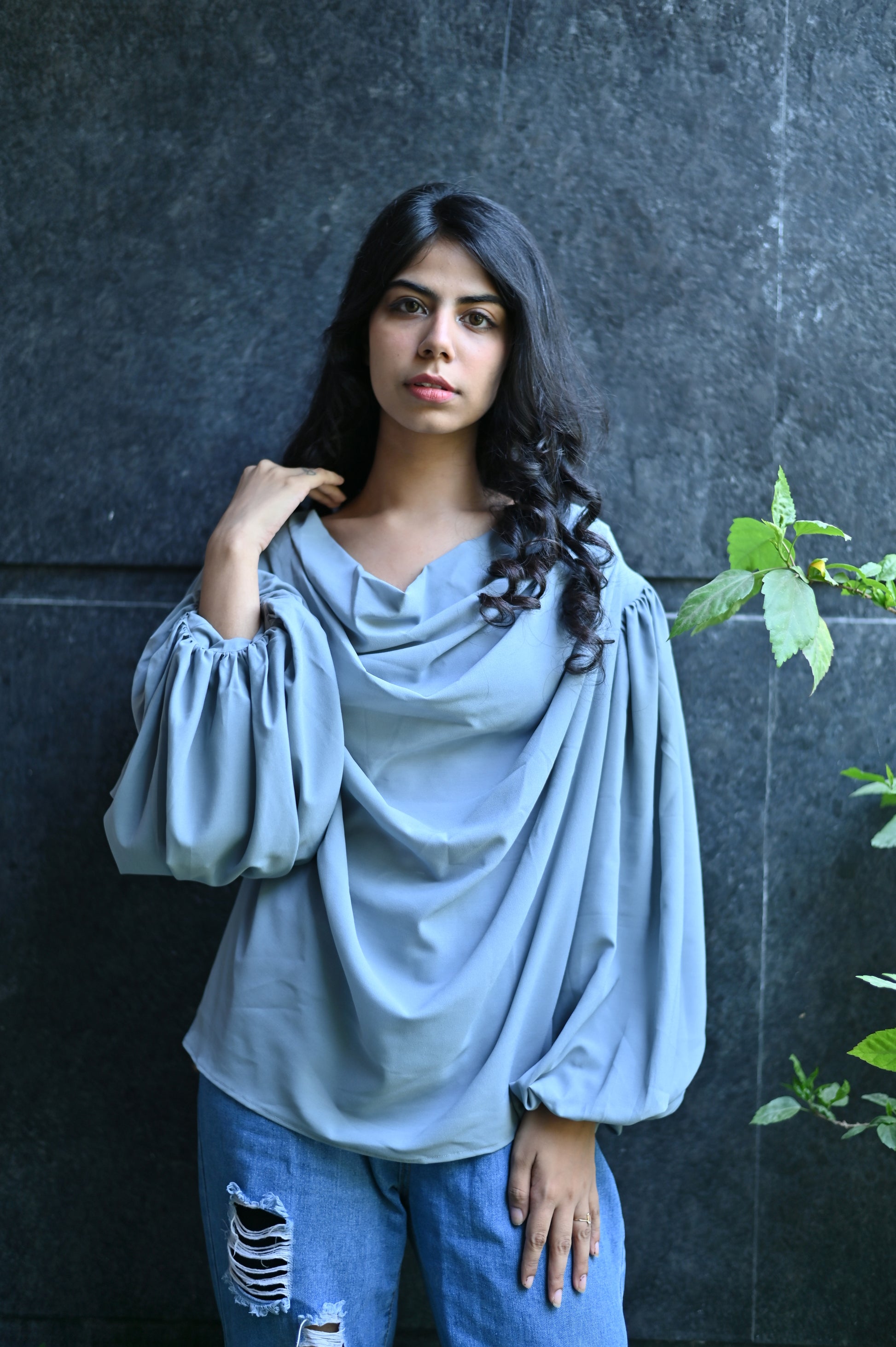 Grey Cowl Top in Double georgette fabric is a loose fit, has cowl on the body and loose sleeves .