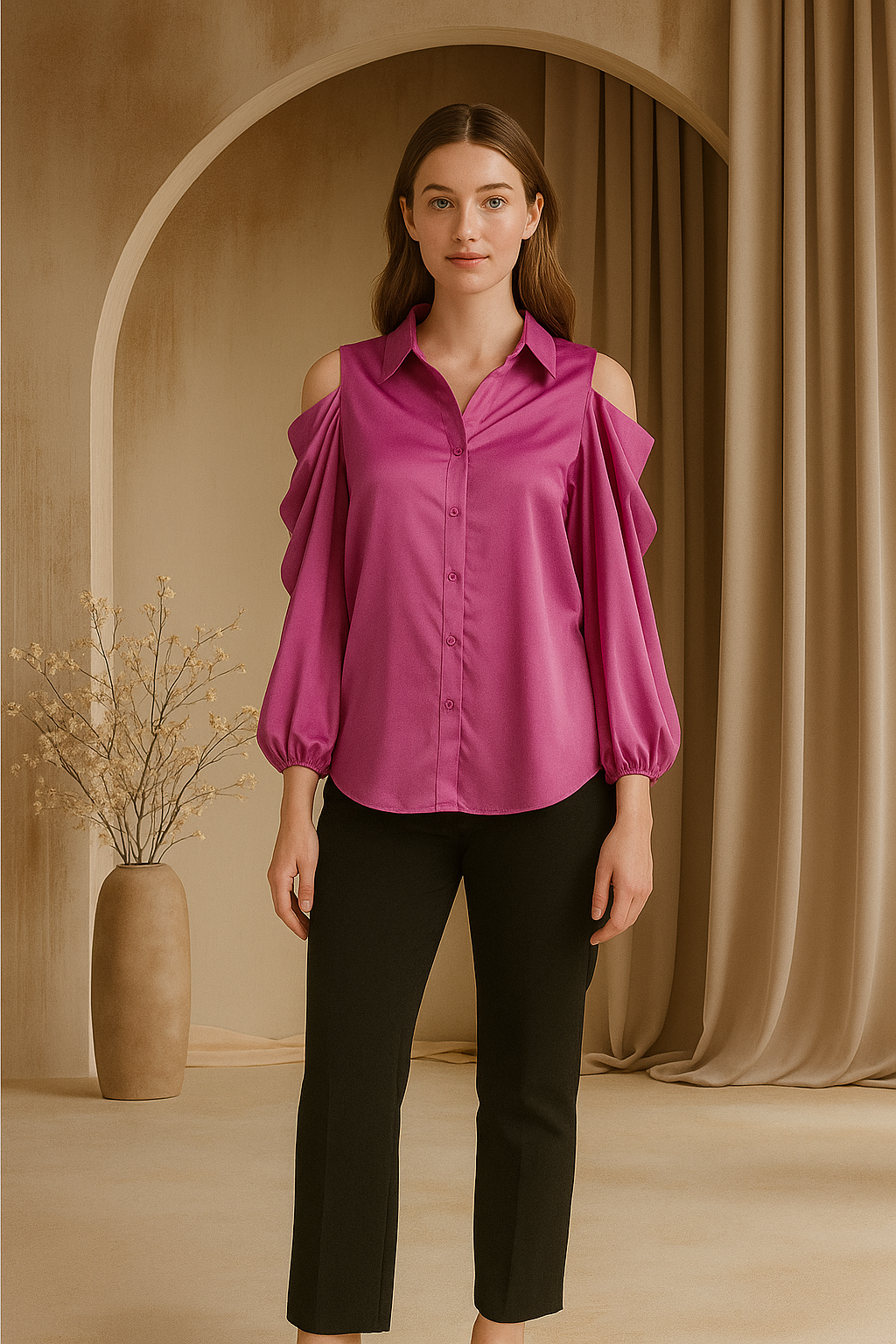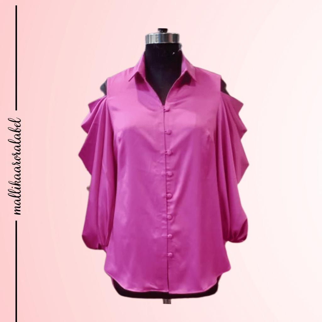 All pink top with shirt collar and front buttons featuring cowls all over the sleeves .