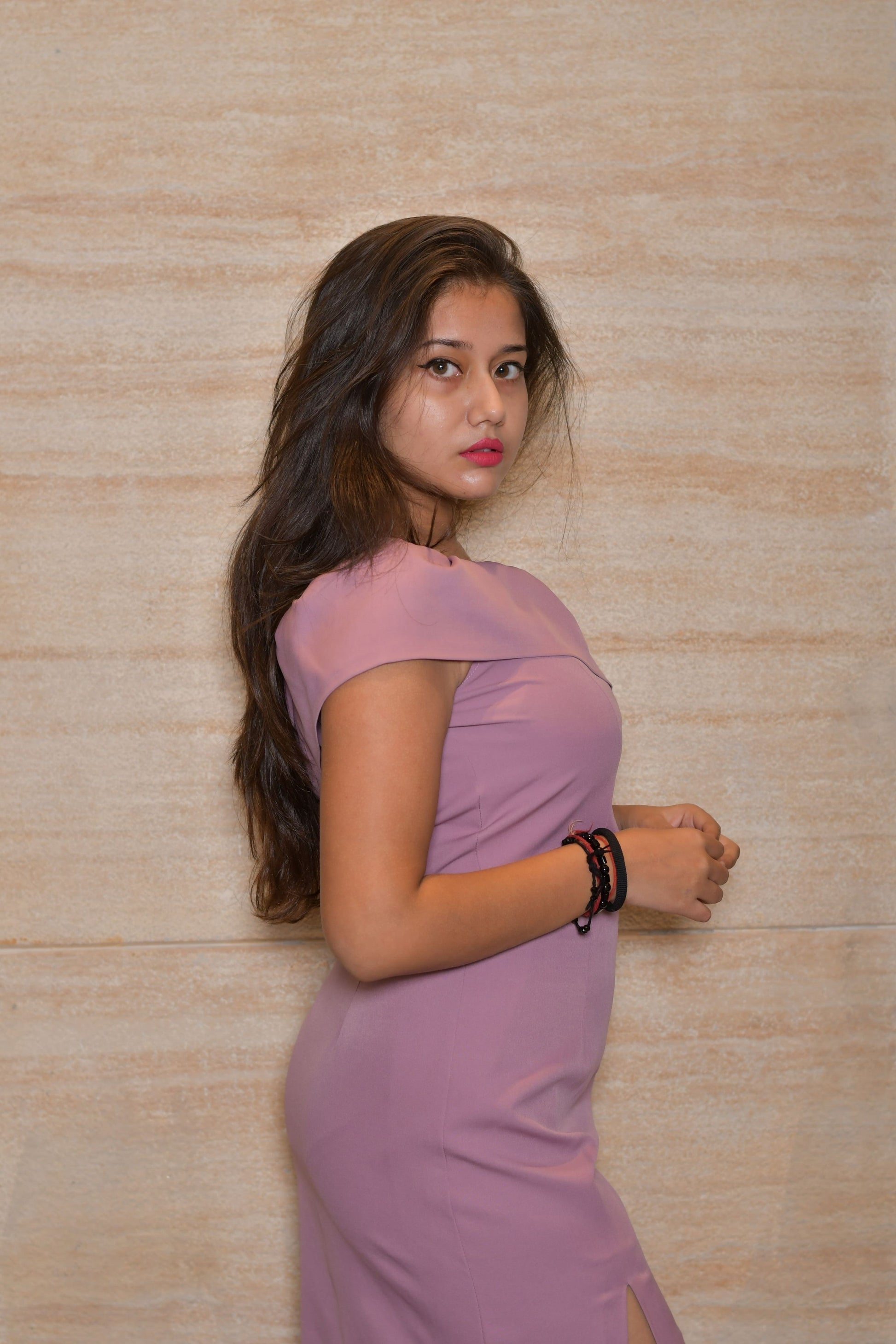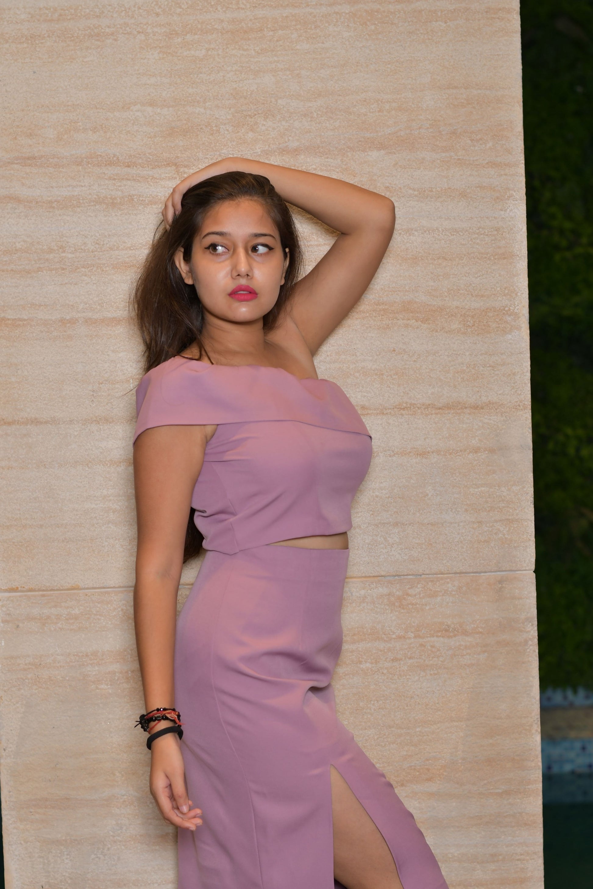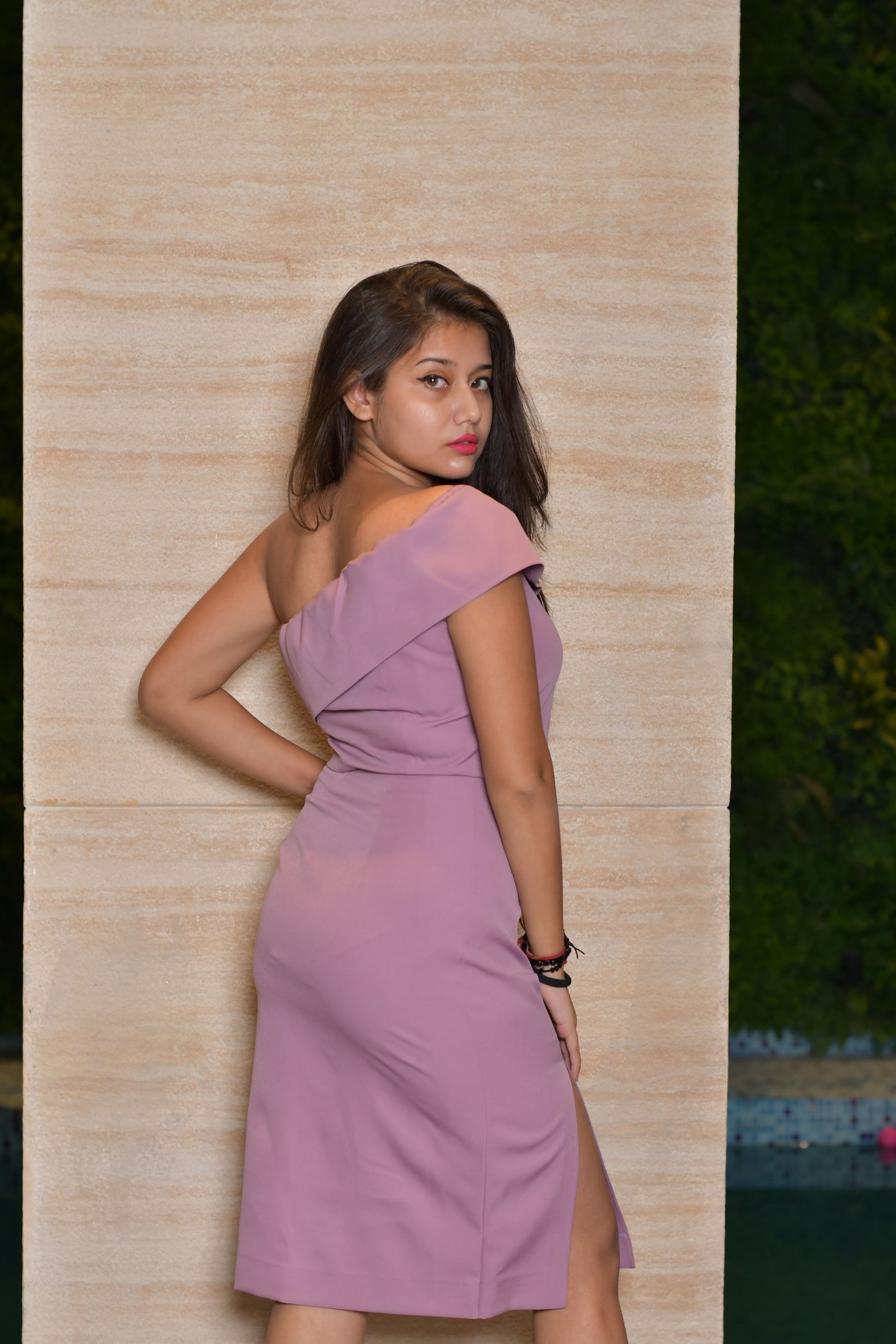 Crop top one shoulder with a high waist pencil skirt with a slit .
