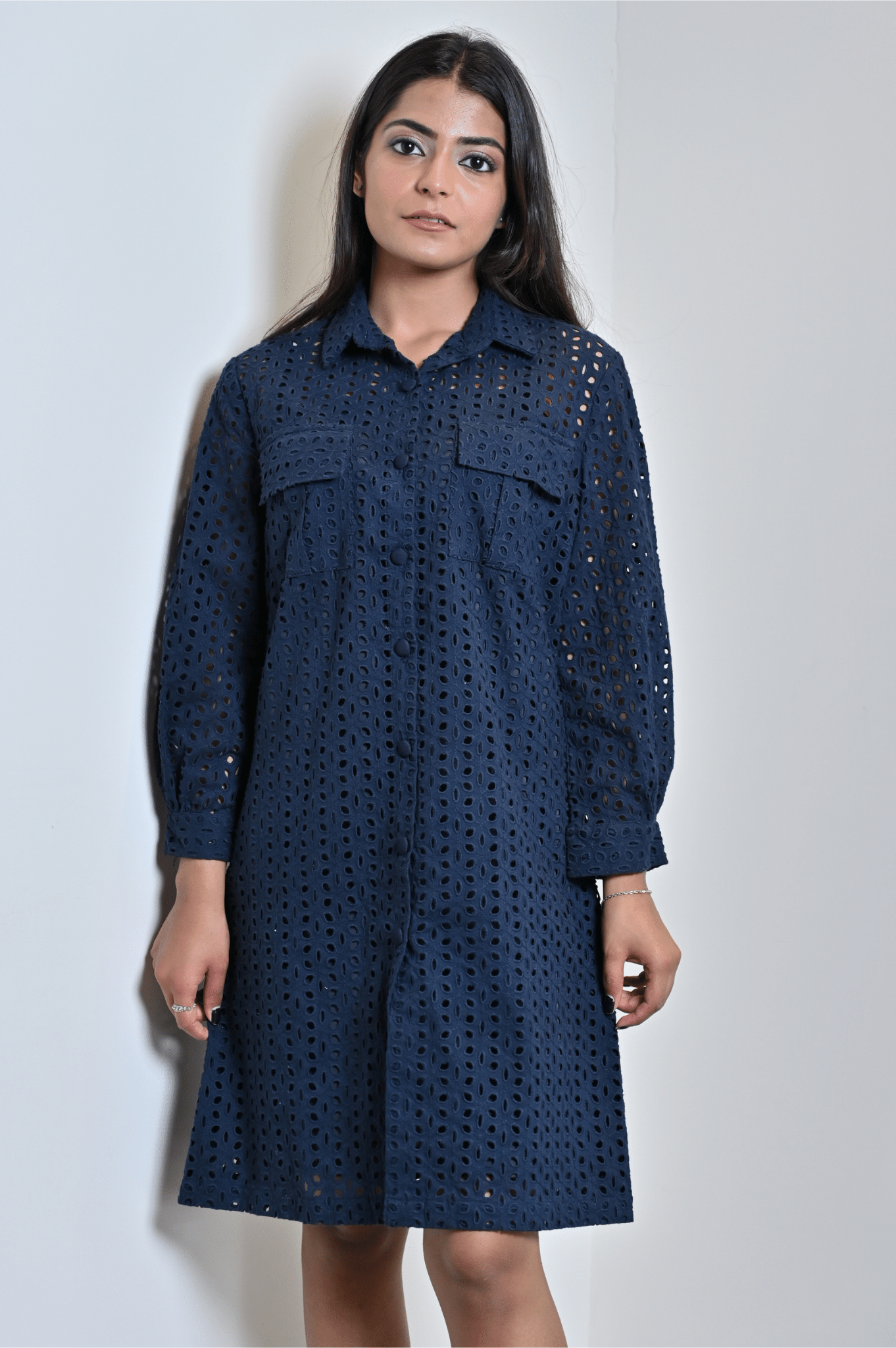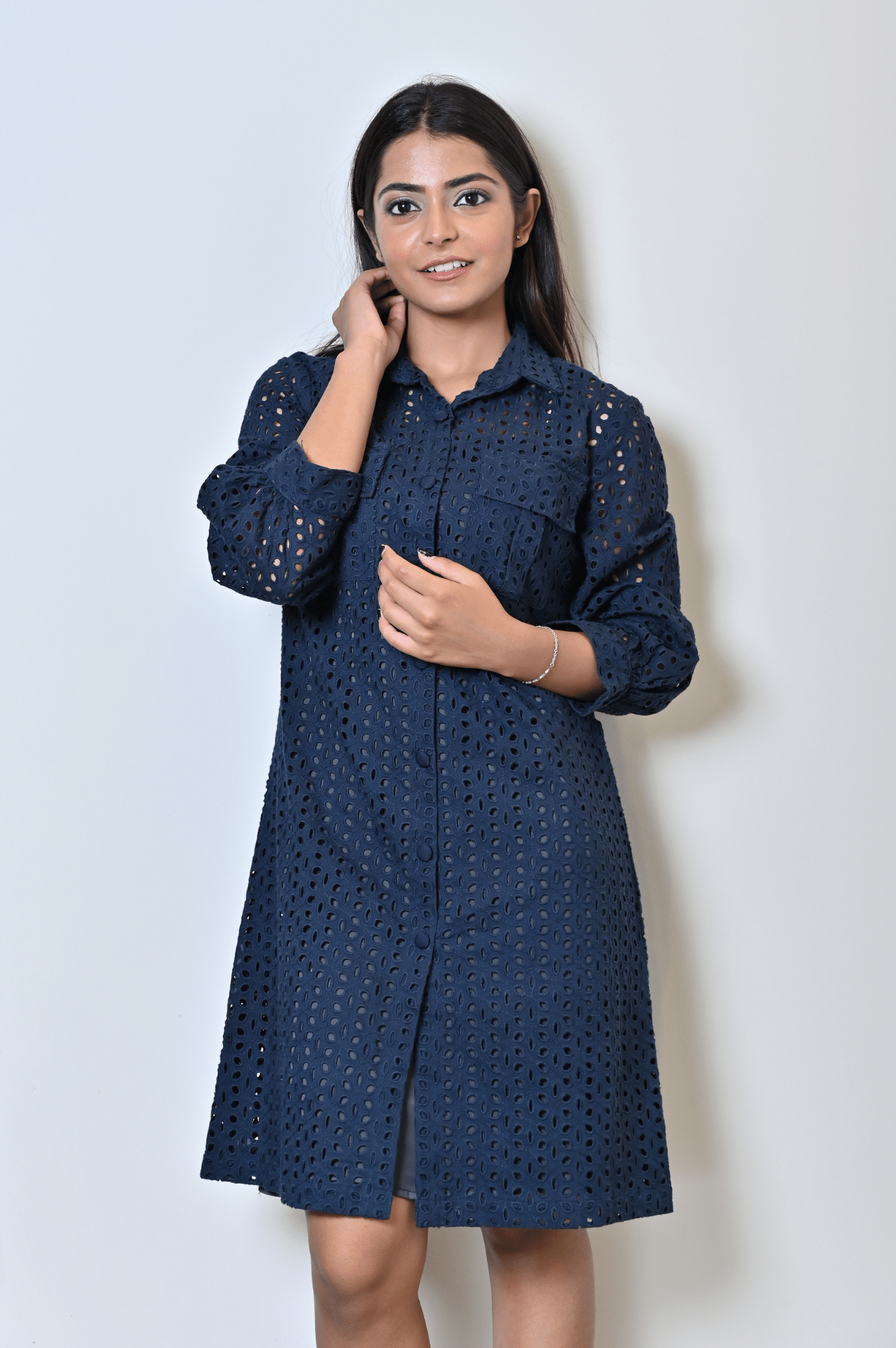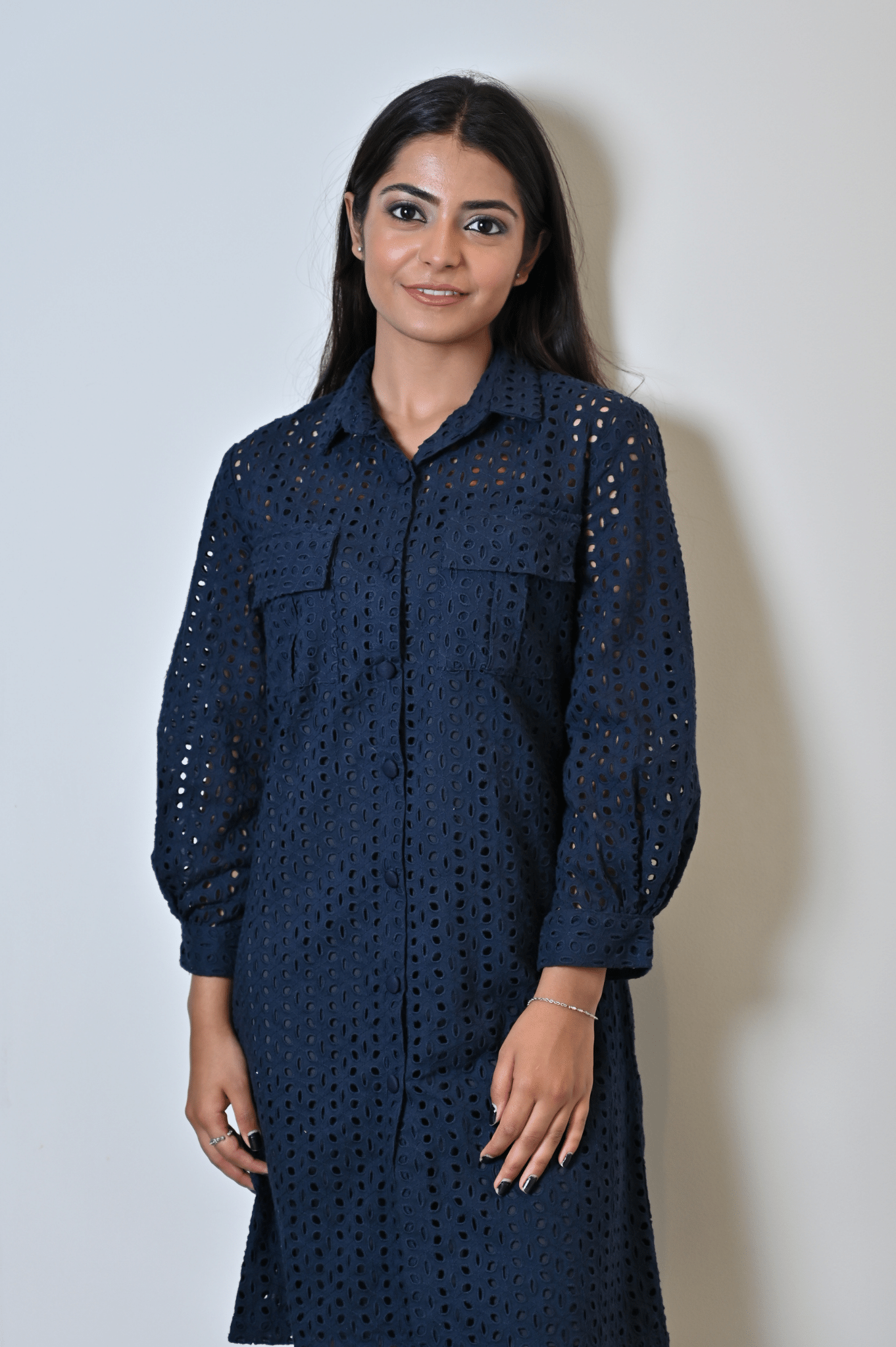 Dark blue lace fabric shirt dress with pockets and cuffs .