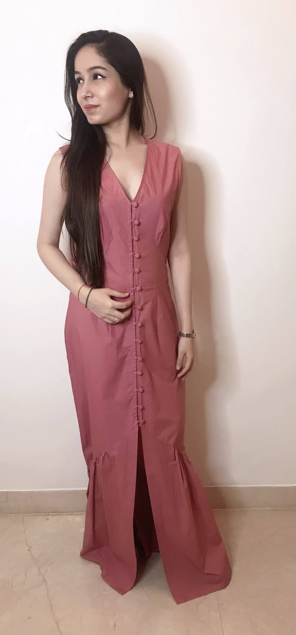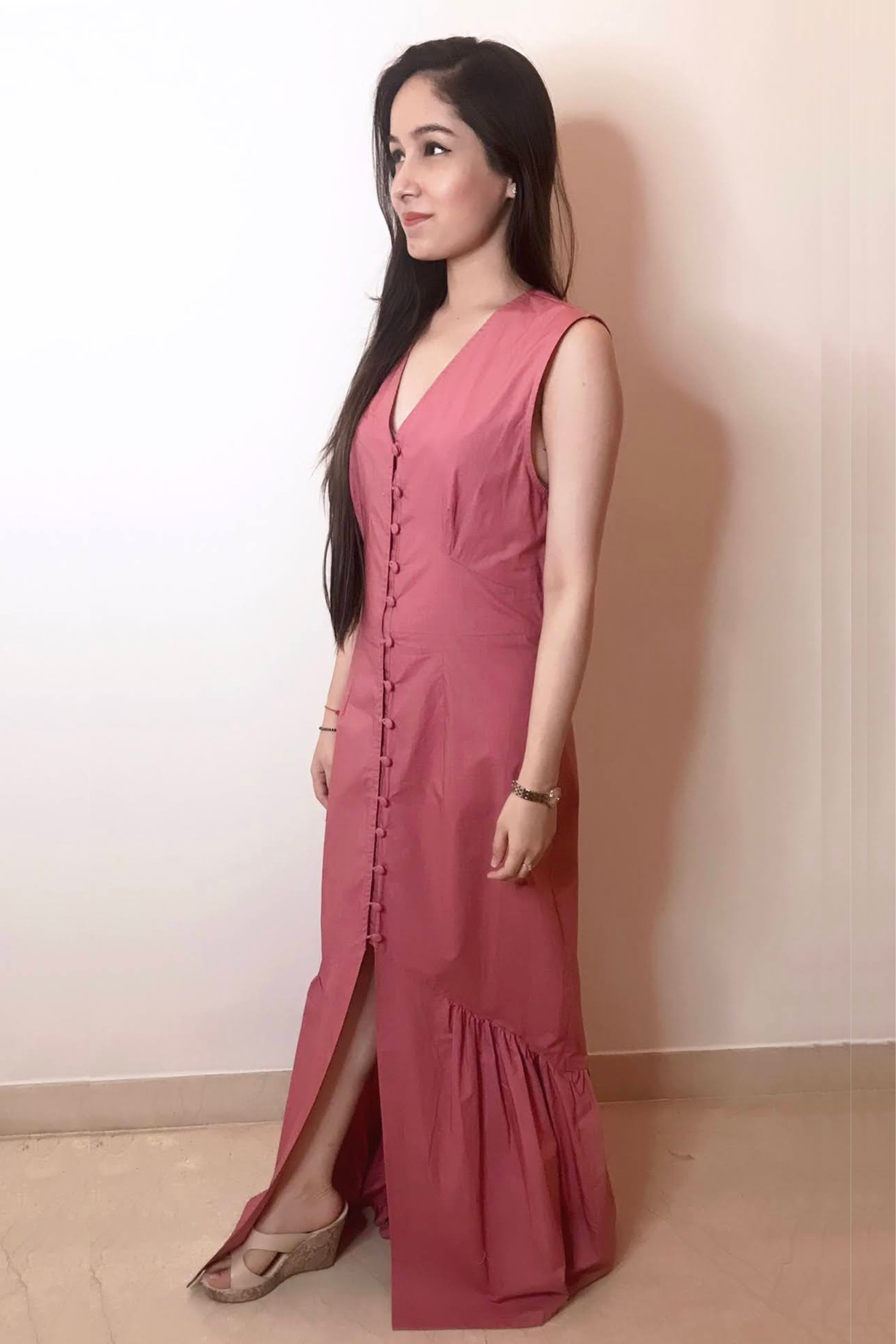 Dark Pink cotton maxi dress with buttons all over, gathered frill near the hem.