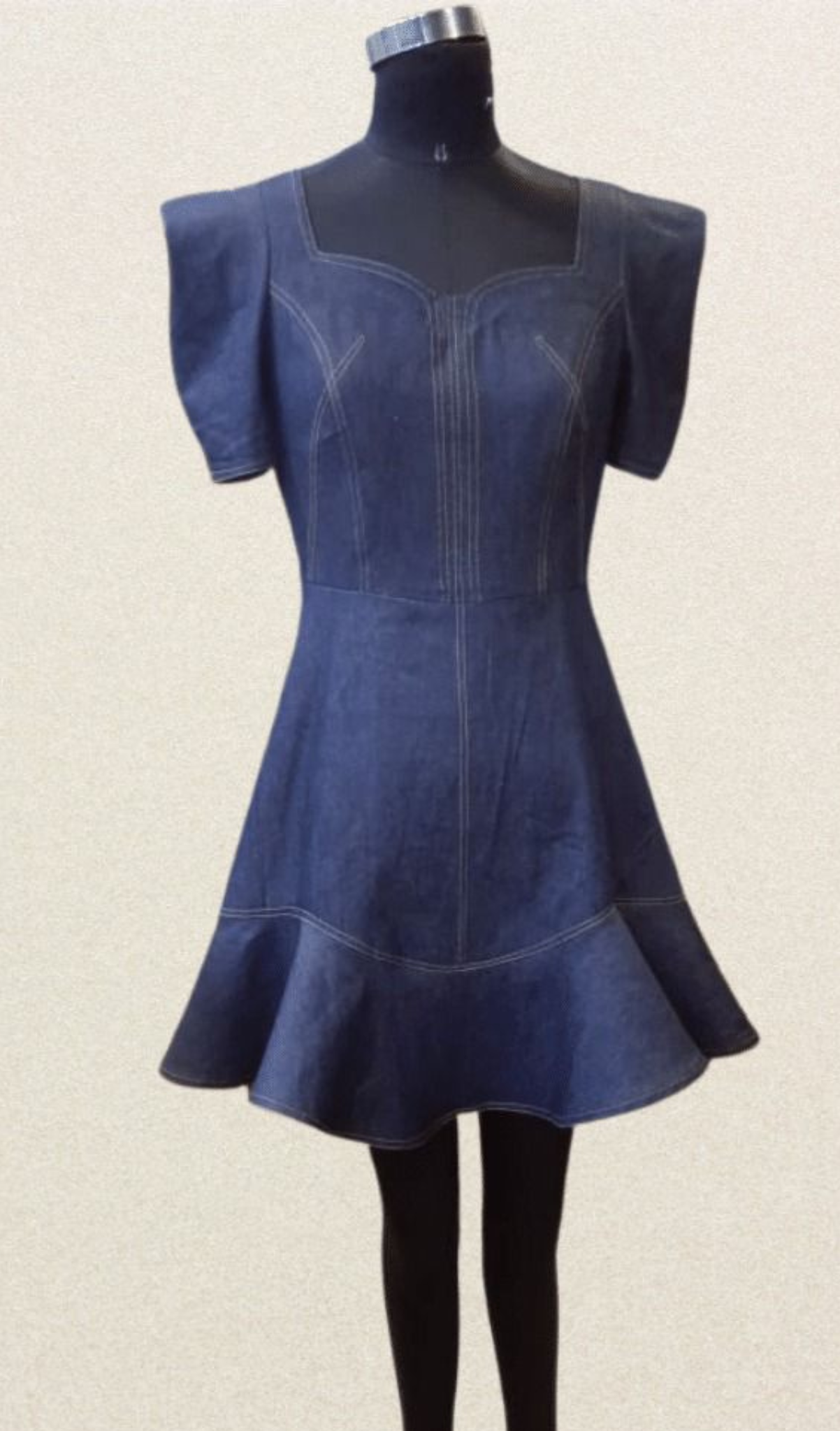 The denim dress has sweetheart neckline, ruffles at bottom with small cape sleeves. Thread detailing enhancing the dress even more .