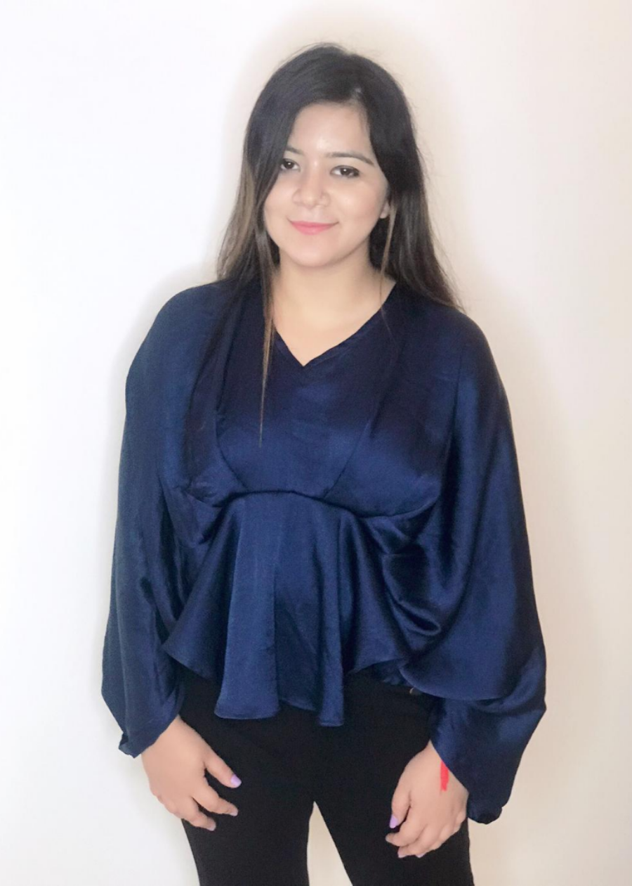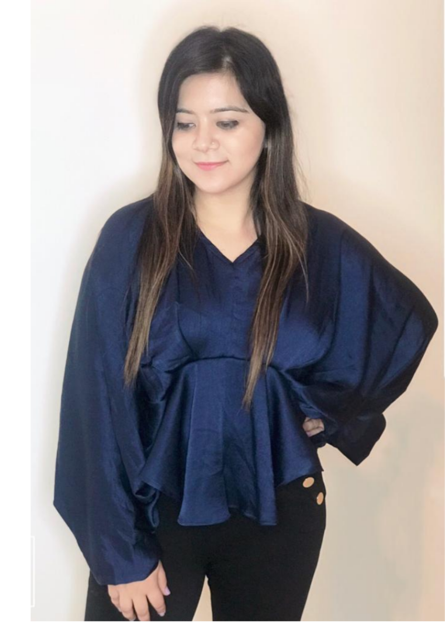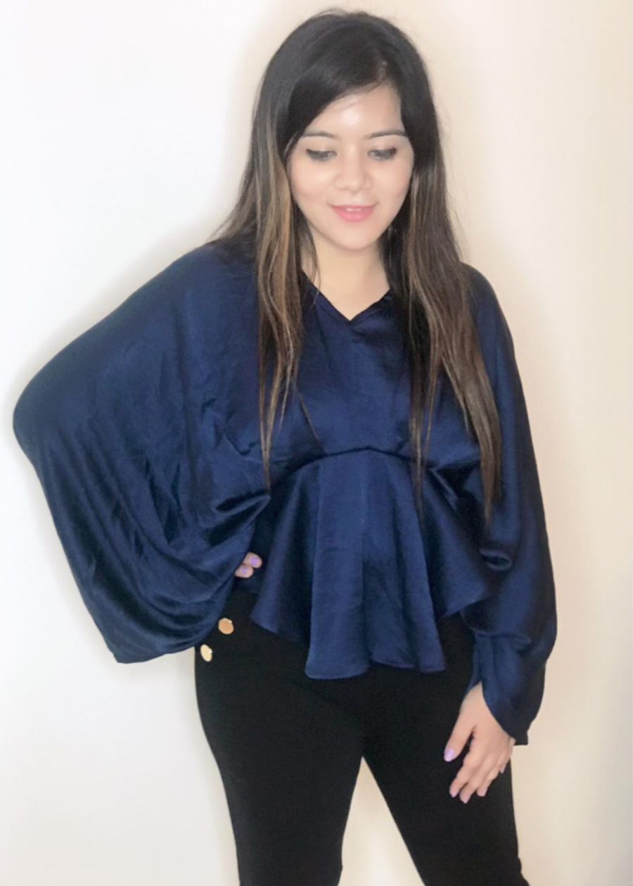 Rich Navy blue draped top with loose draped sleeves.