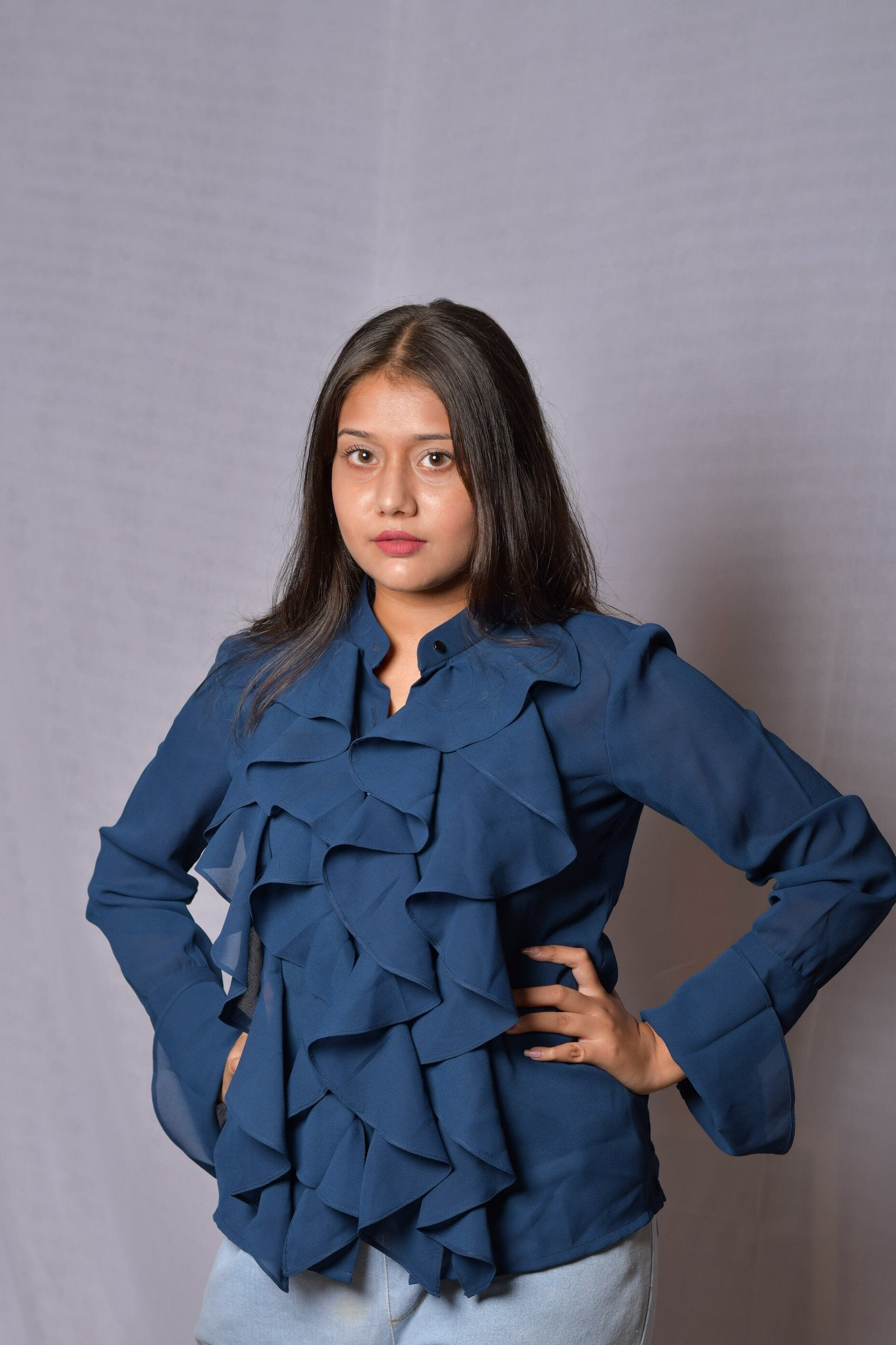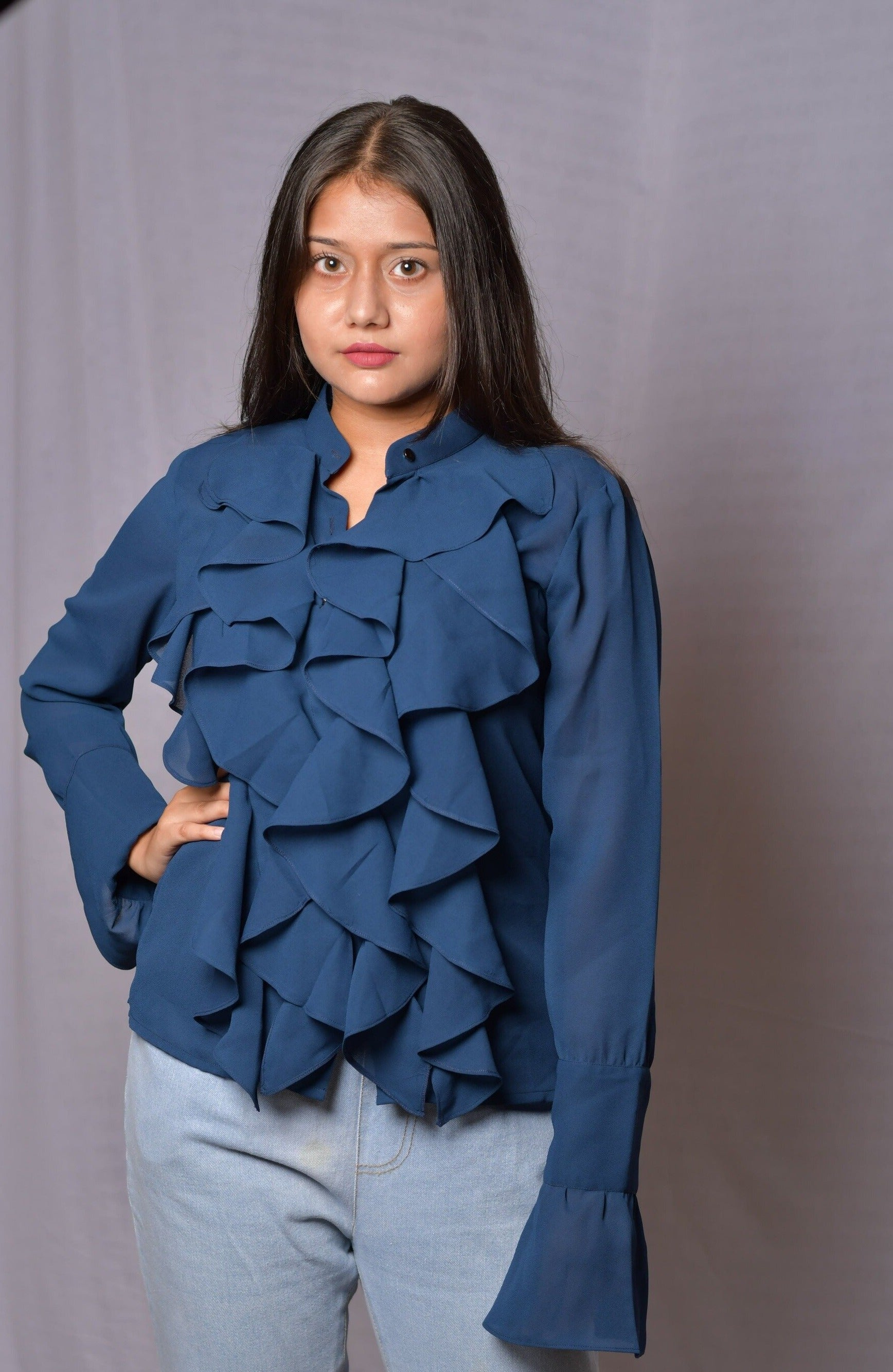 Blue all over the body ruffle top with band collar and frill on the sleeves hem.