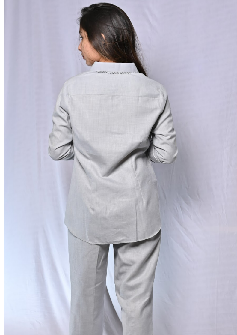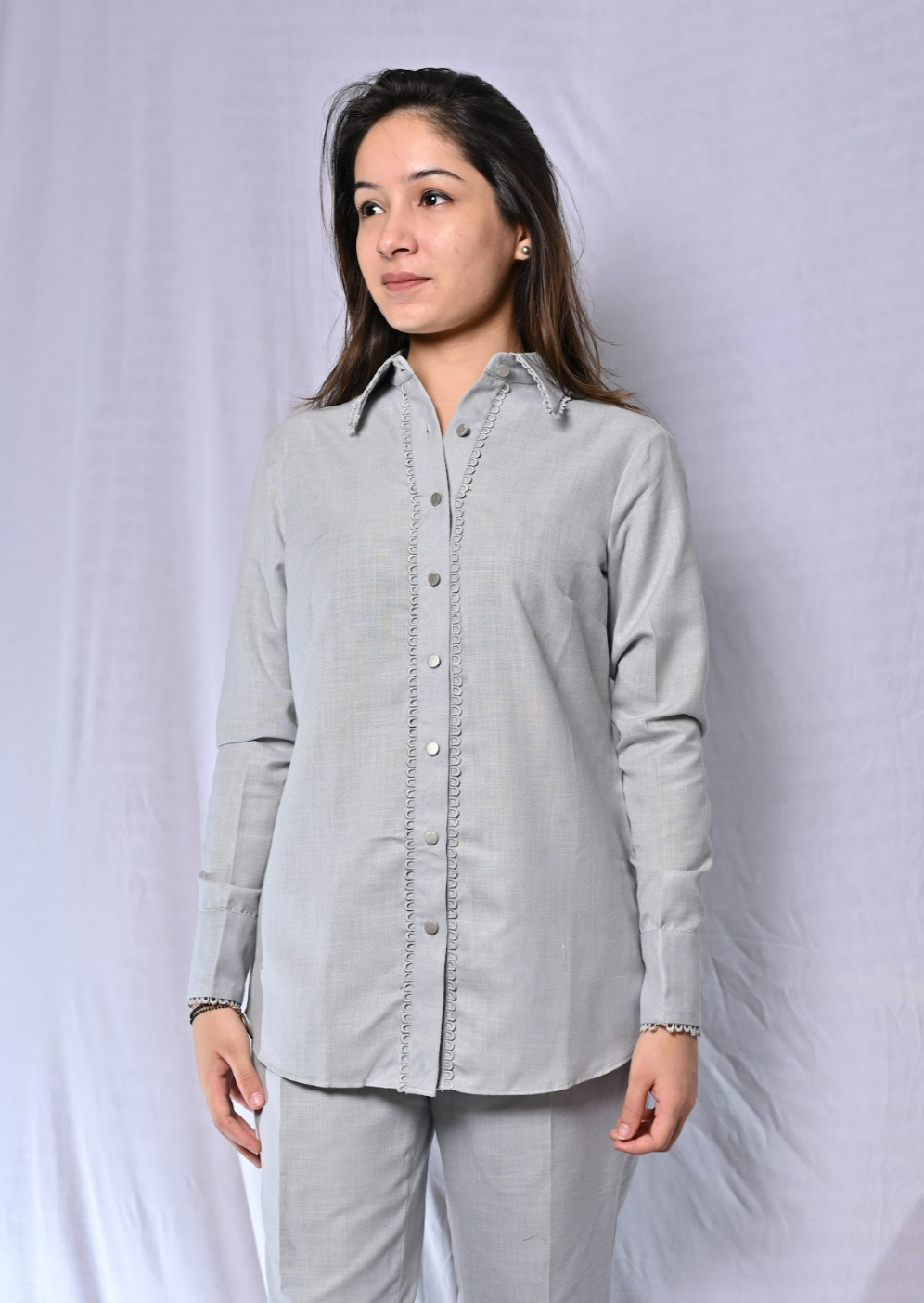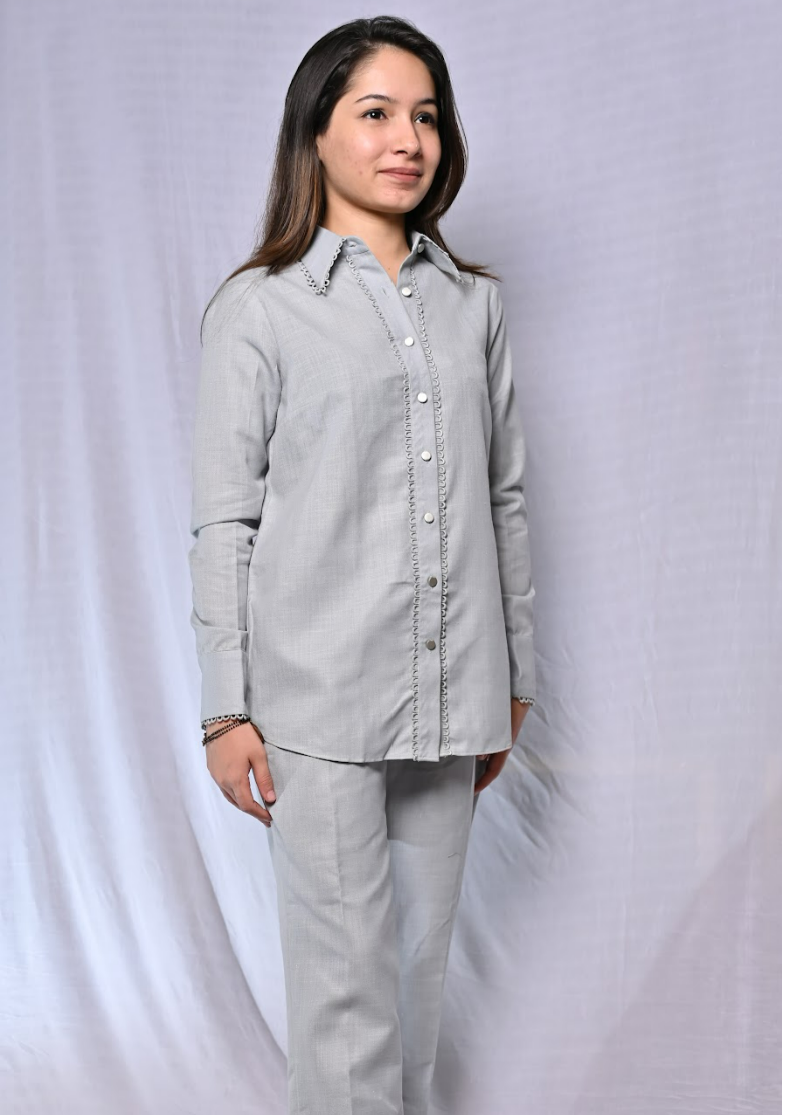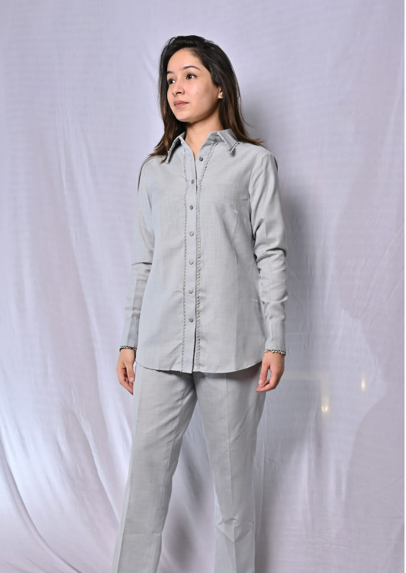 This shirt style cotton co-rd set comes in a this beautiful light grey shade, along with lace detailing, full sleeves and straight fit pants.