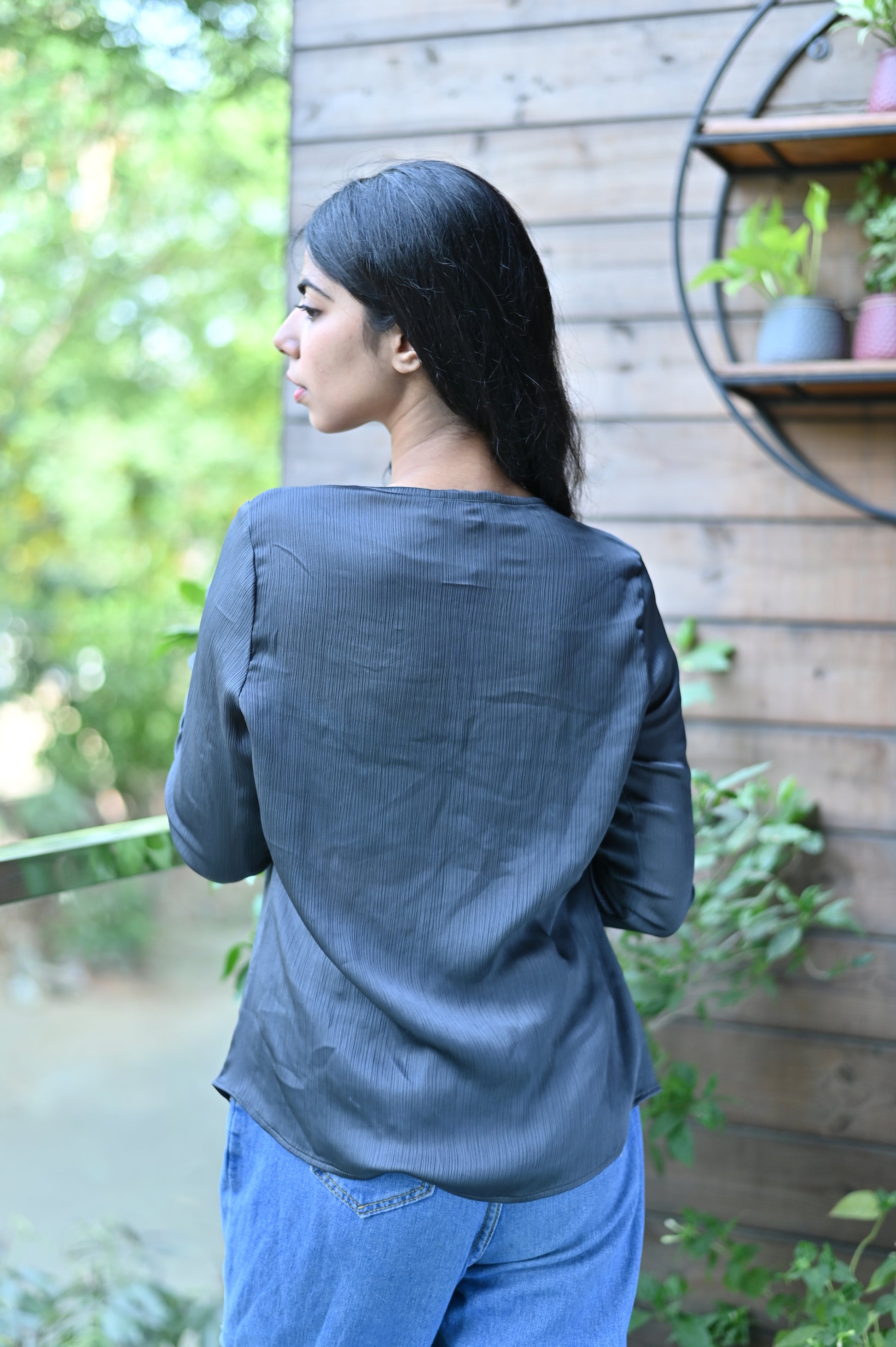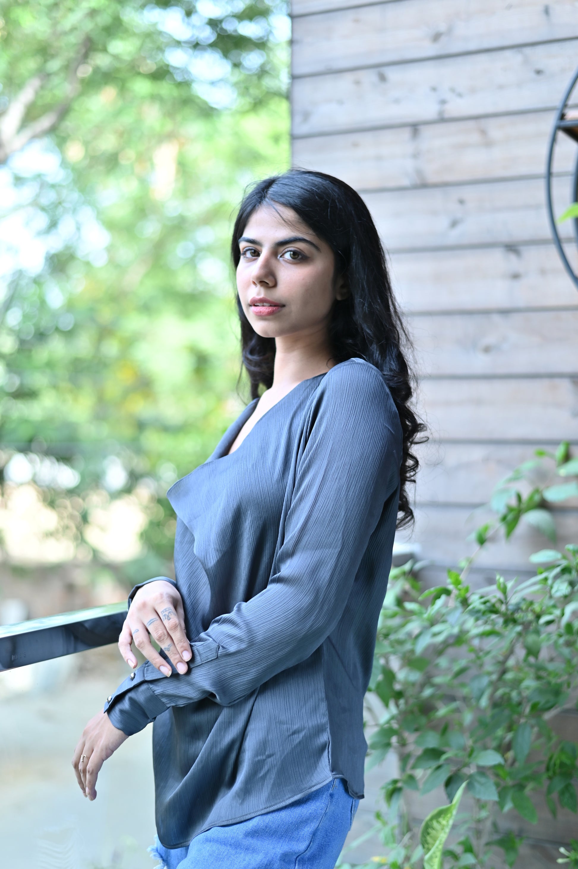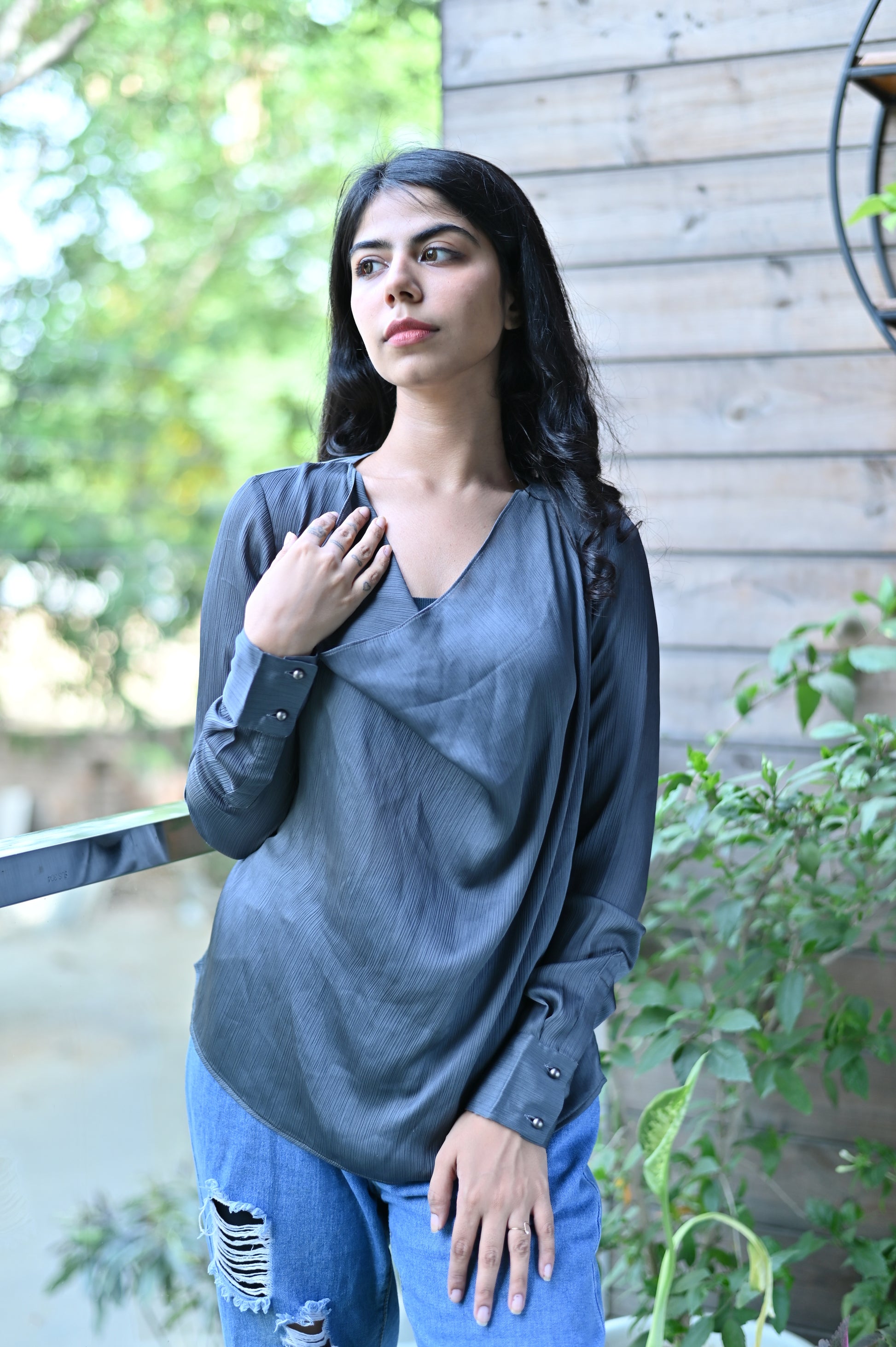 Grey Loose Fit Top has wide neck cowl with full sleeves and cuffs with metallic buttons