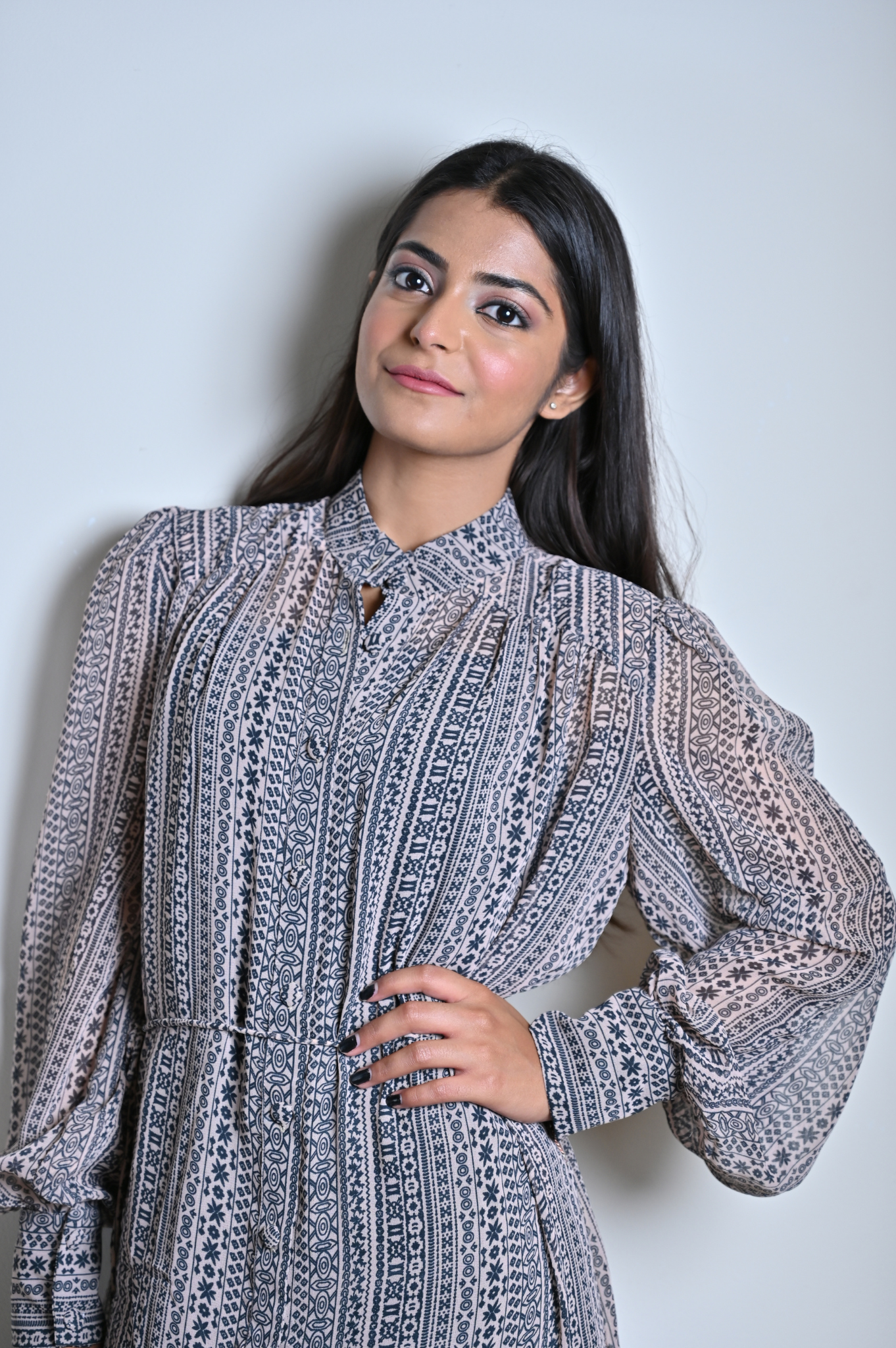 Printed grey dress with balloon sleeves.