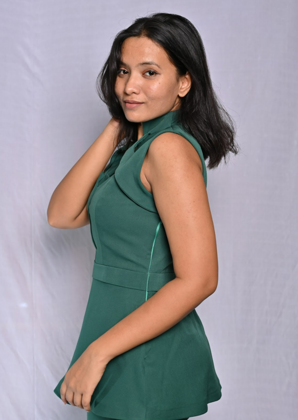 Bottle Green co-ord set, with sleeveless, highneck style, peplum look and flared bottoms.