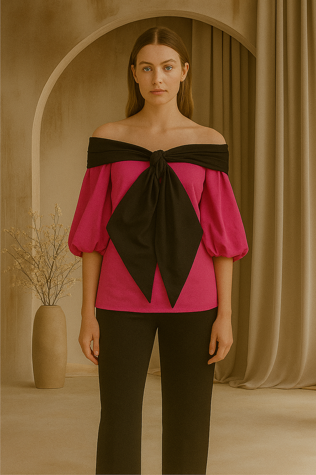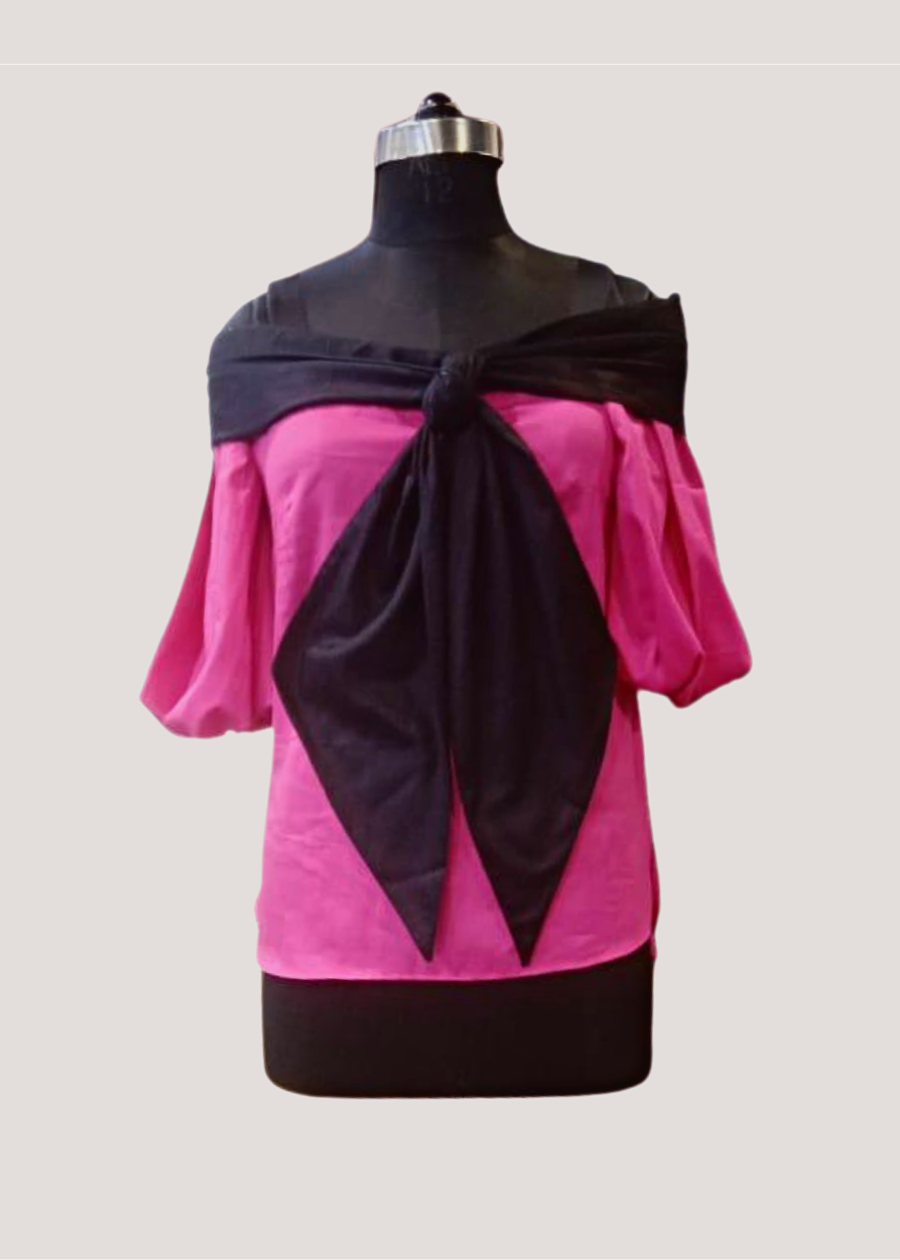 The Hot Pink and Black Top has black colour front knot above the bust, that falls till the waist line. It has off shoulder pattern with half balloon sleeves.