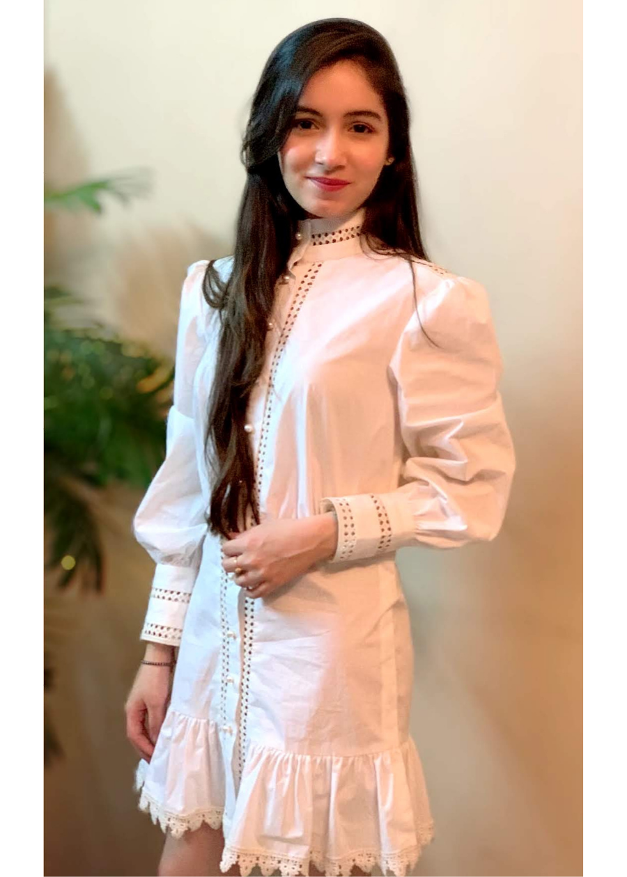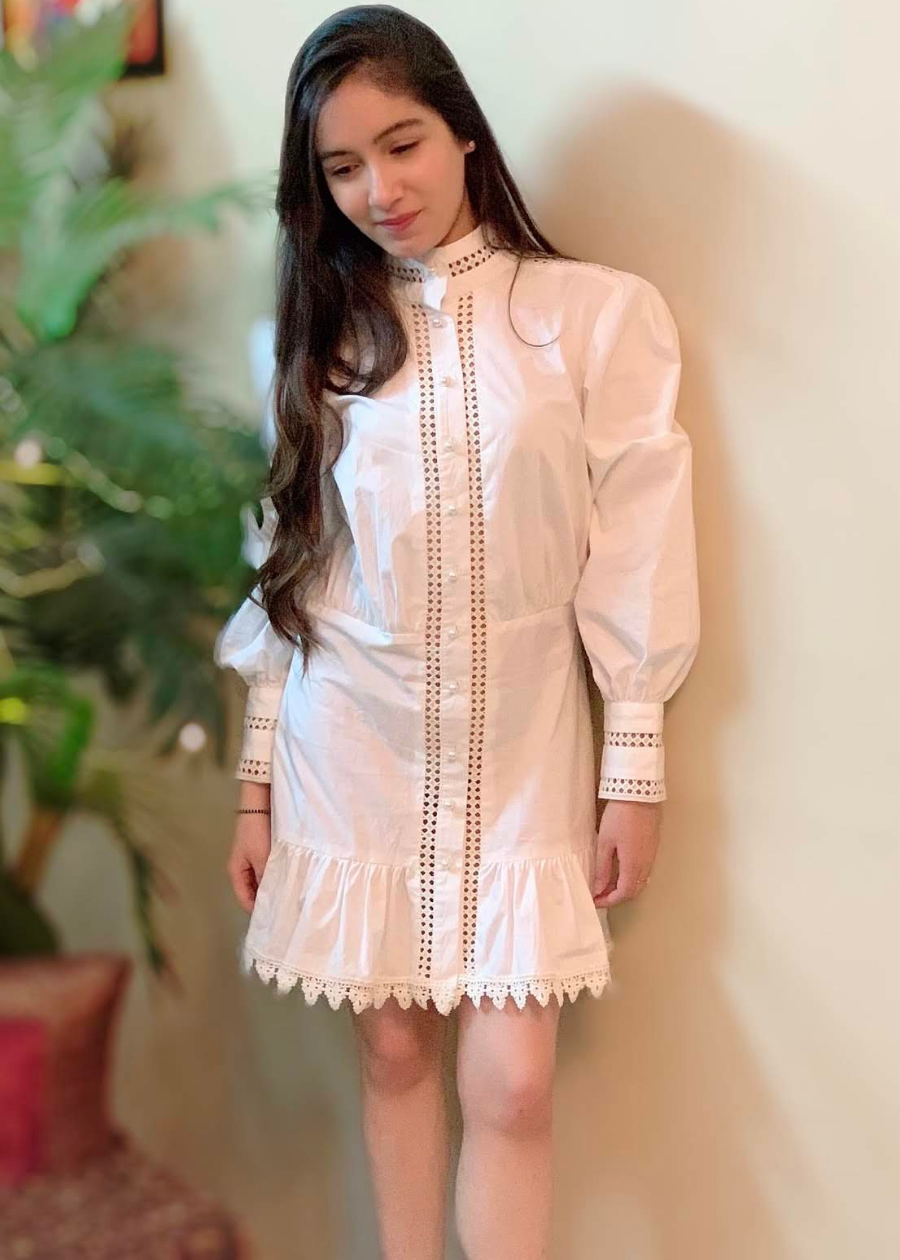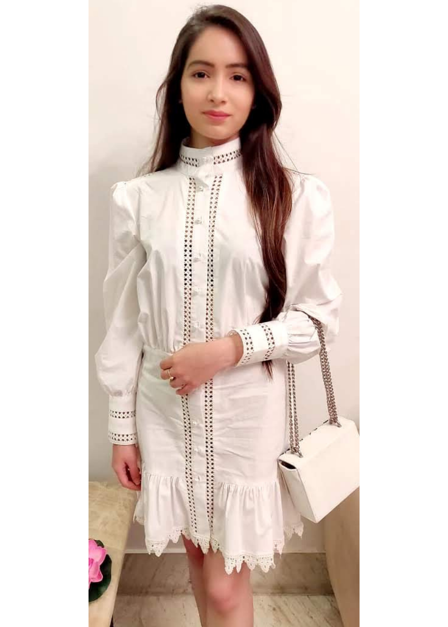 White high round neck dress with lace work all over, featuring balloon sleeves and frill at the hem.