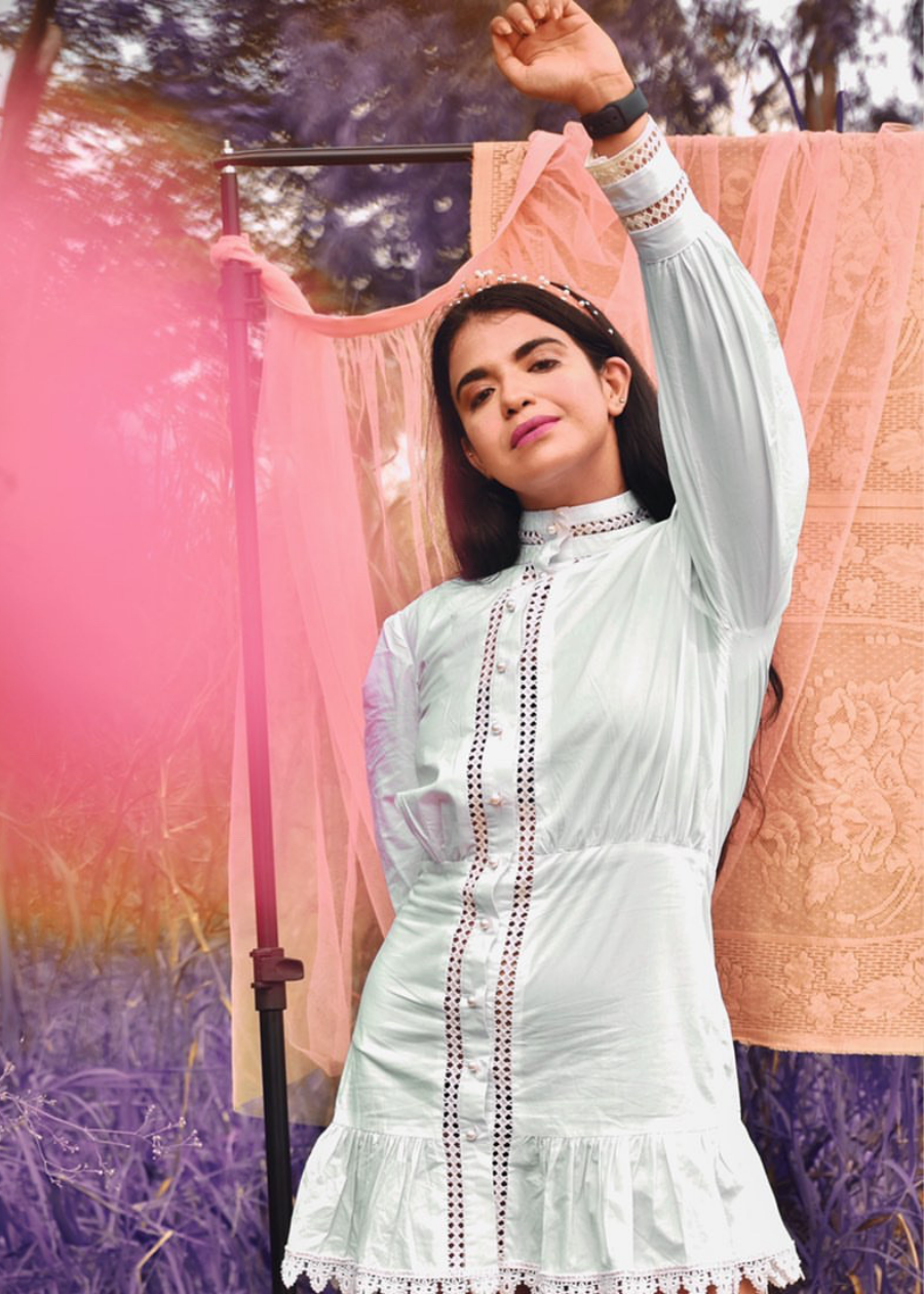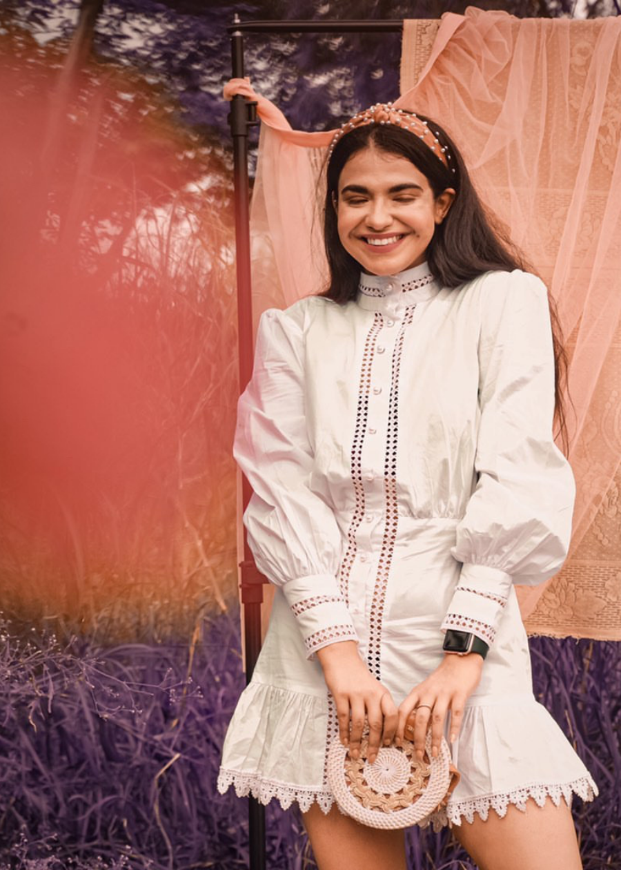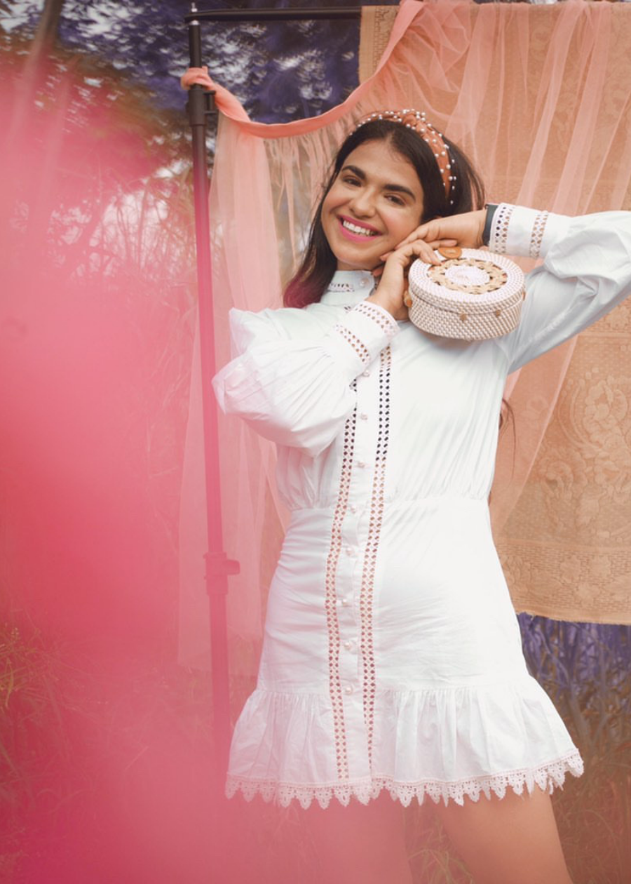 White high round neck dress with lace work all over, featuring balloon sleeves and frill at the hem.