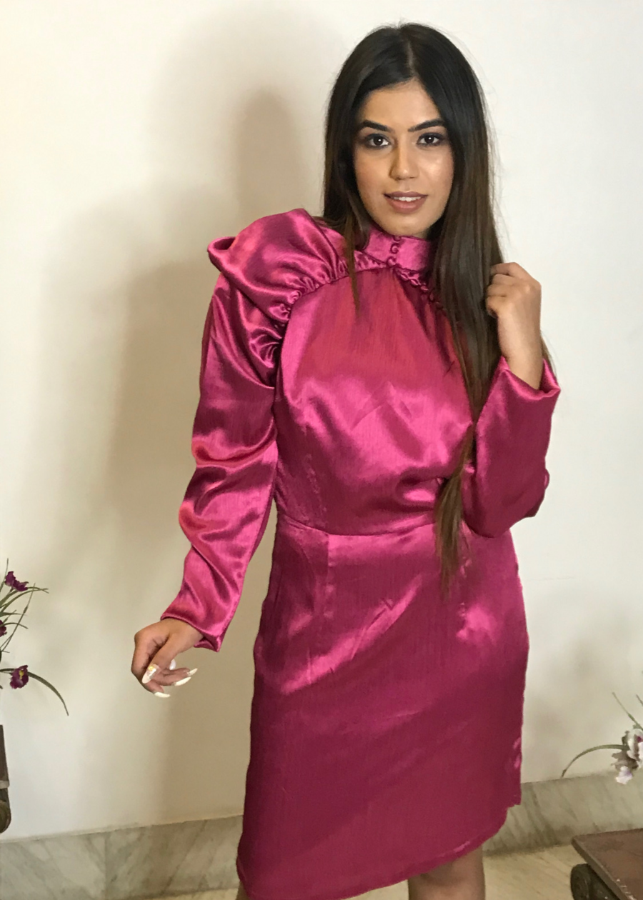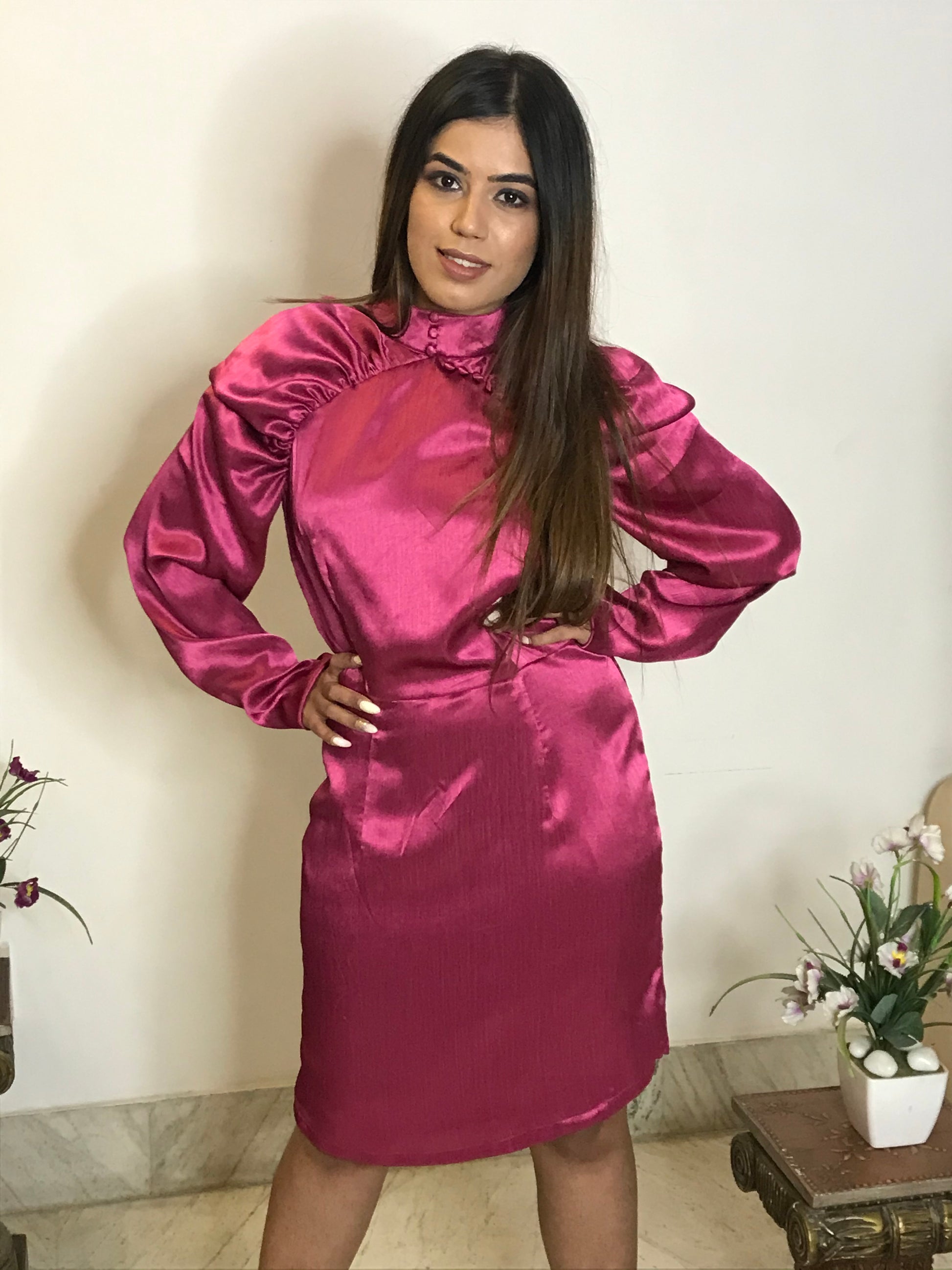 Satin magenta dress with elaborating sleeves and buttoned neck.