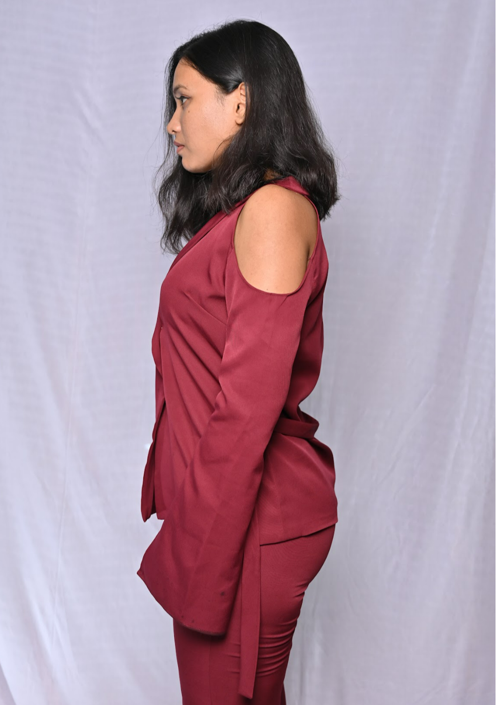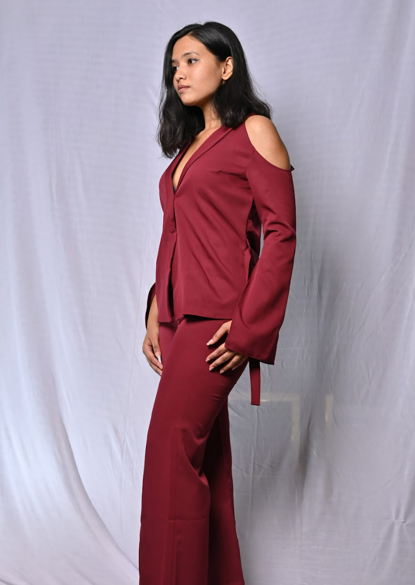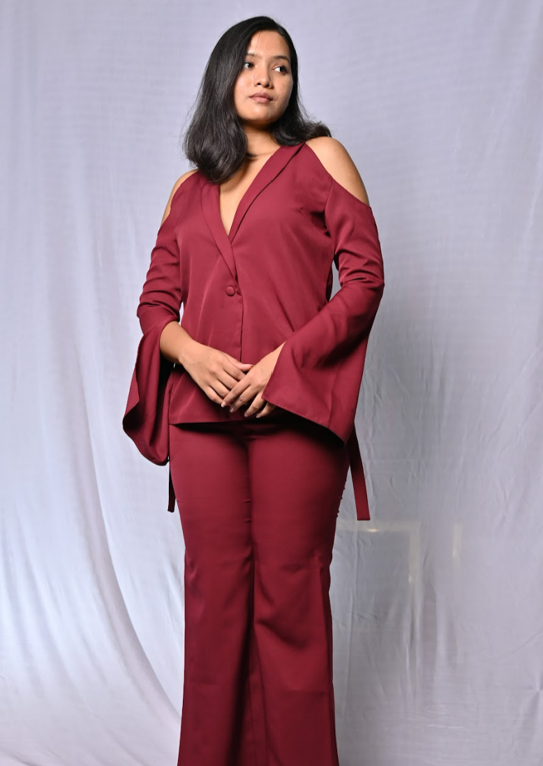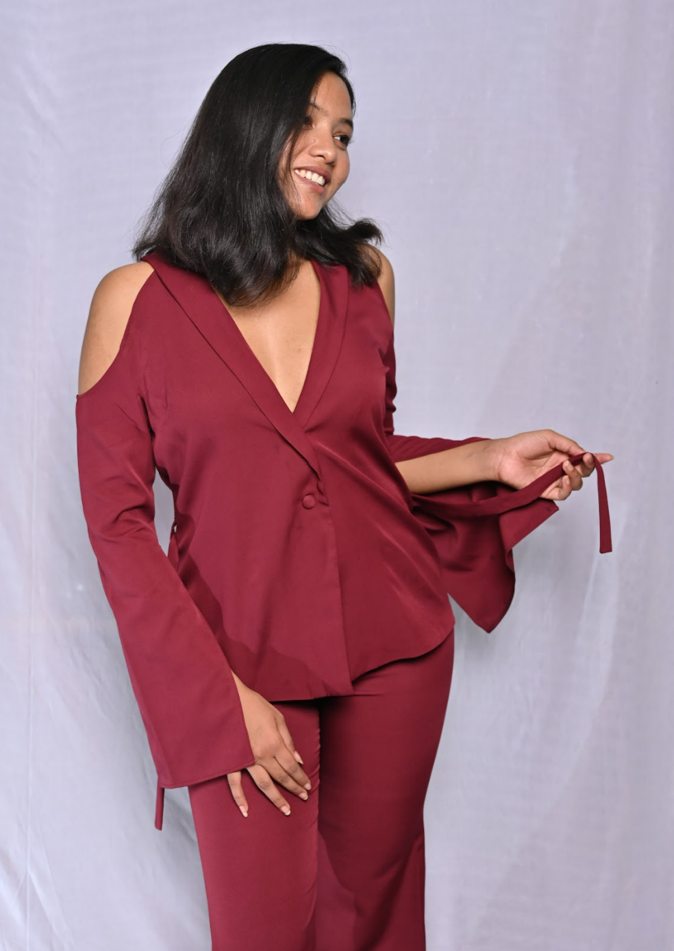 This Maroon Co-ord Set consists of a cold shoulder style coat witha v-neck and long bell sleeves. And flared bottoms.