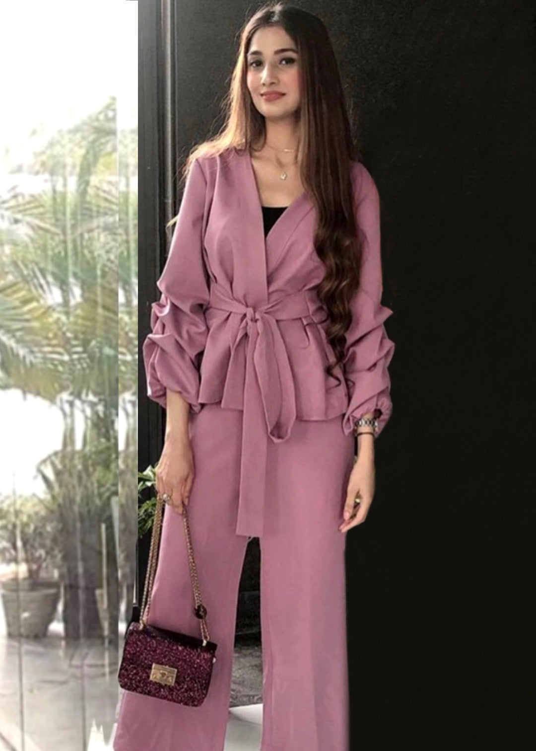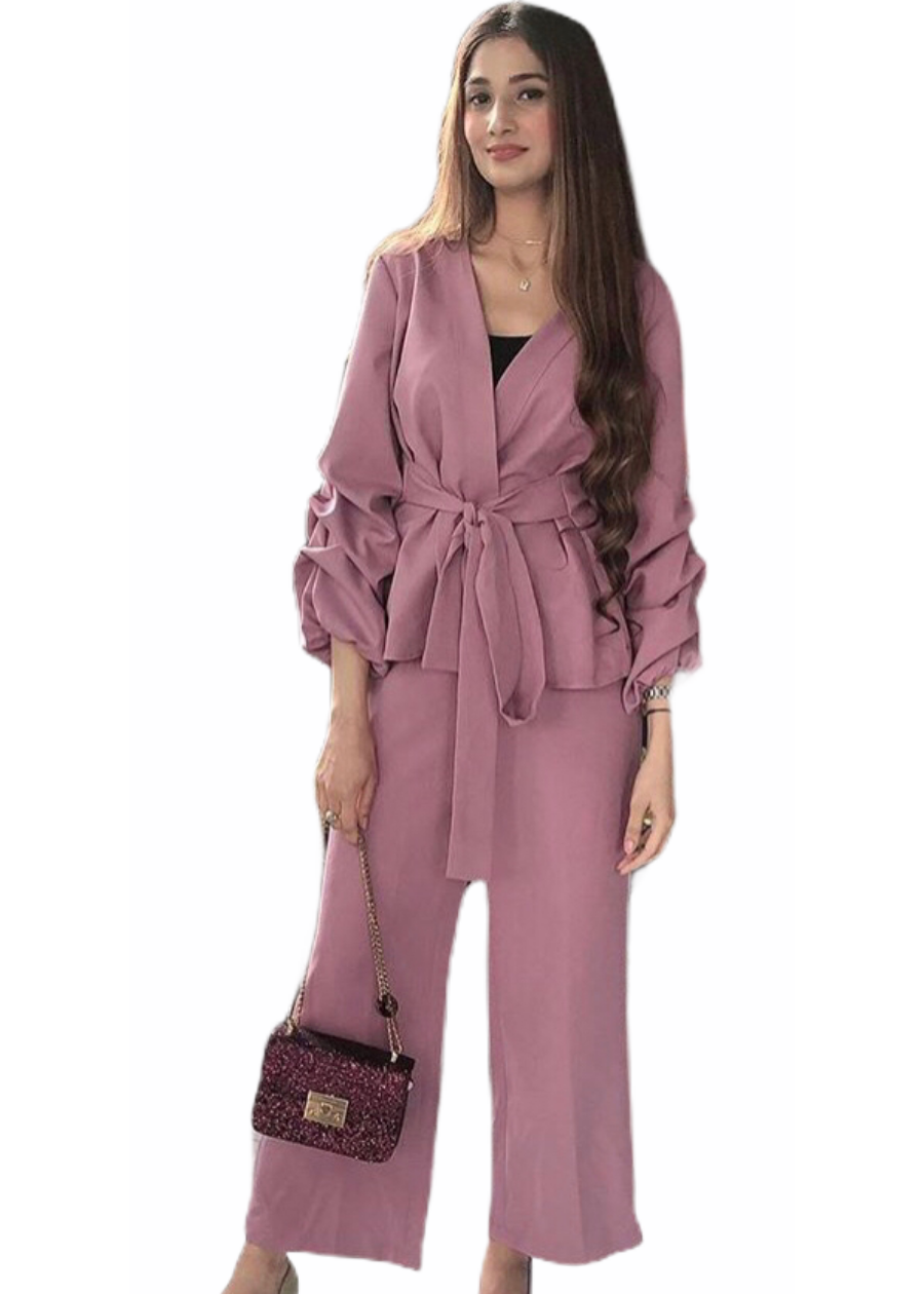 Best seller mauve coord set with front knot blazer with draping sleeves.