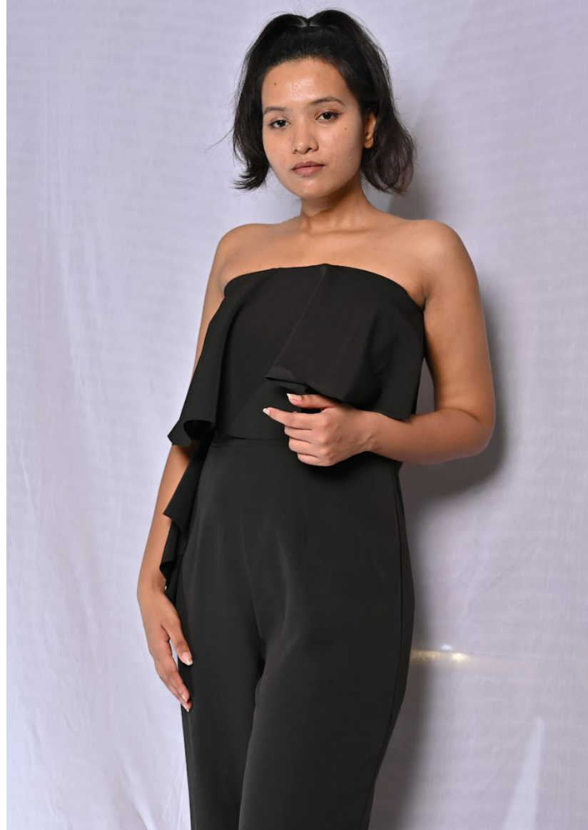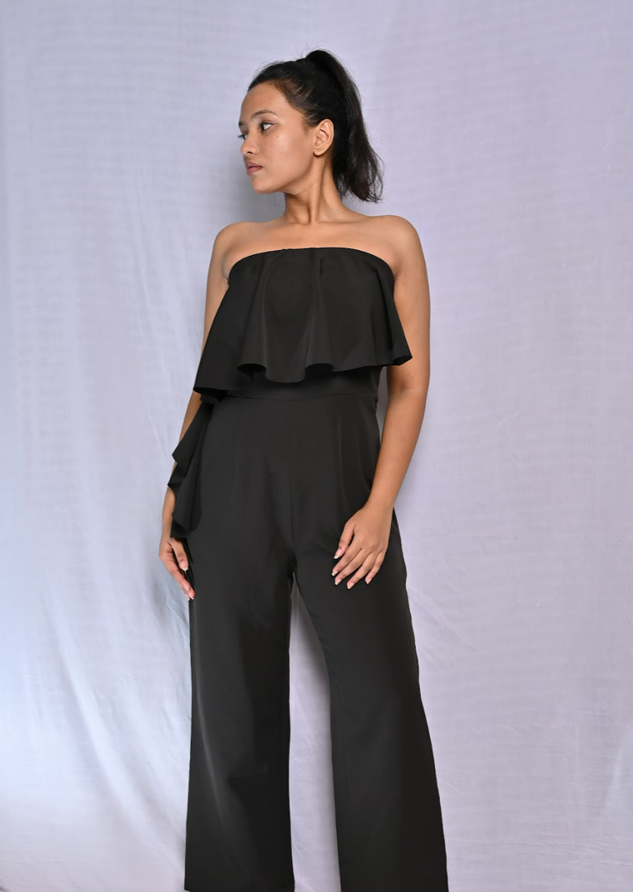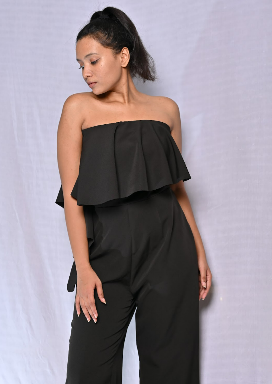Off Shoulder Black Ruffle Jumpsuit, Wide Leg Pants