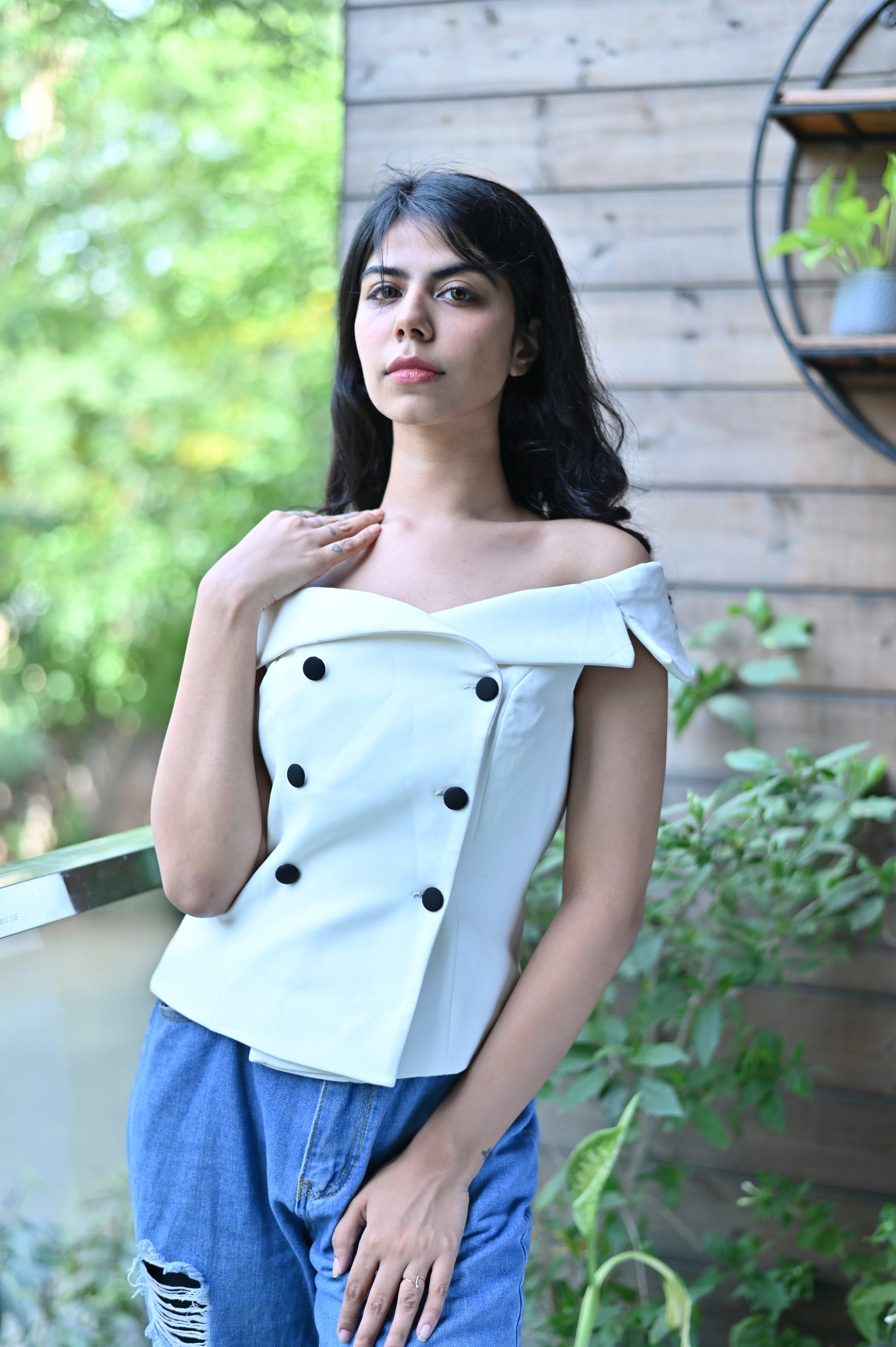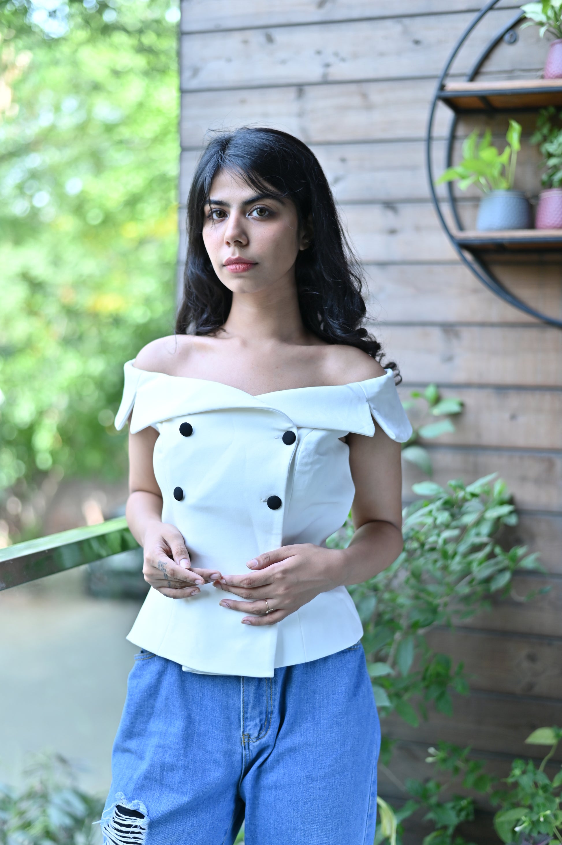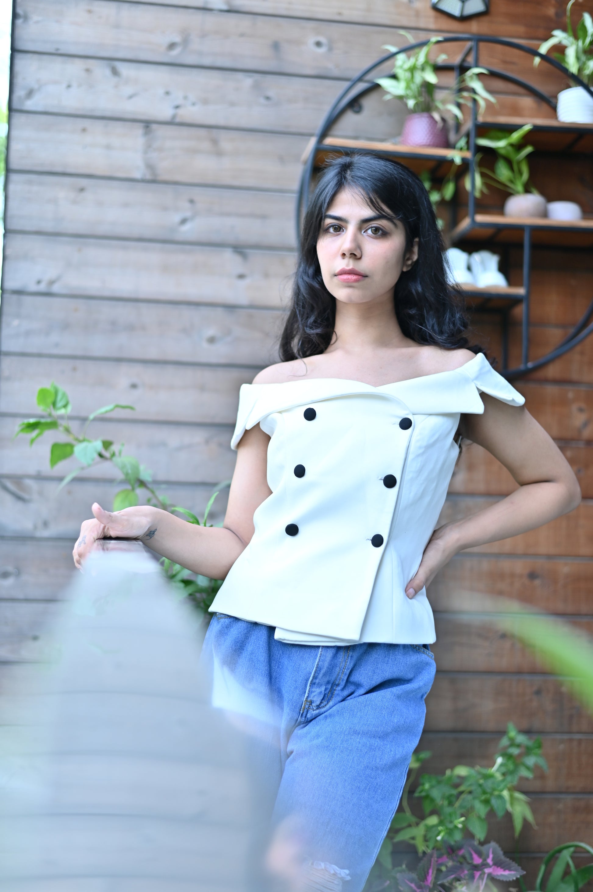 Off Shoulder Blazer Top is off-shoulder top with front black buttons.