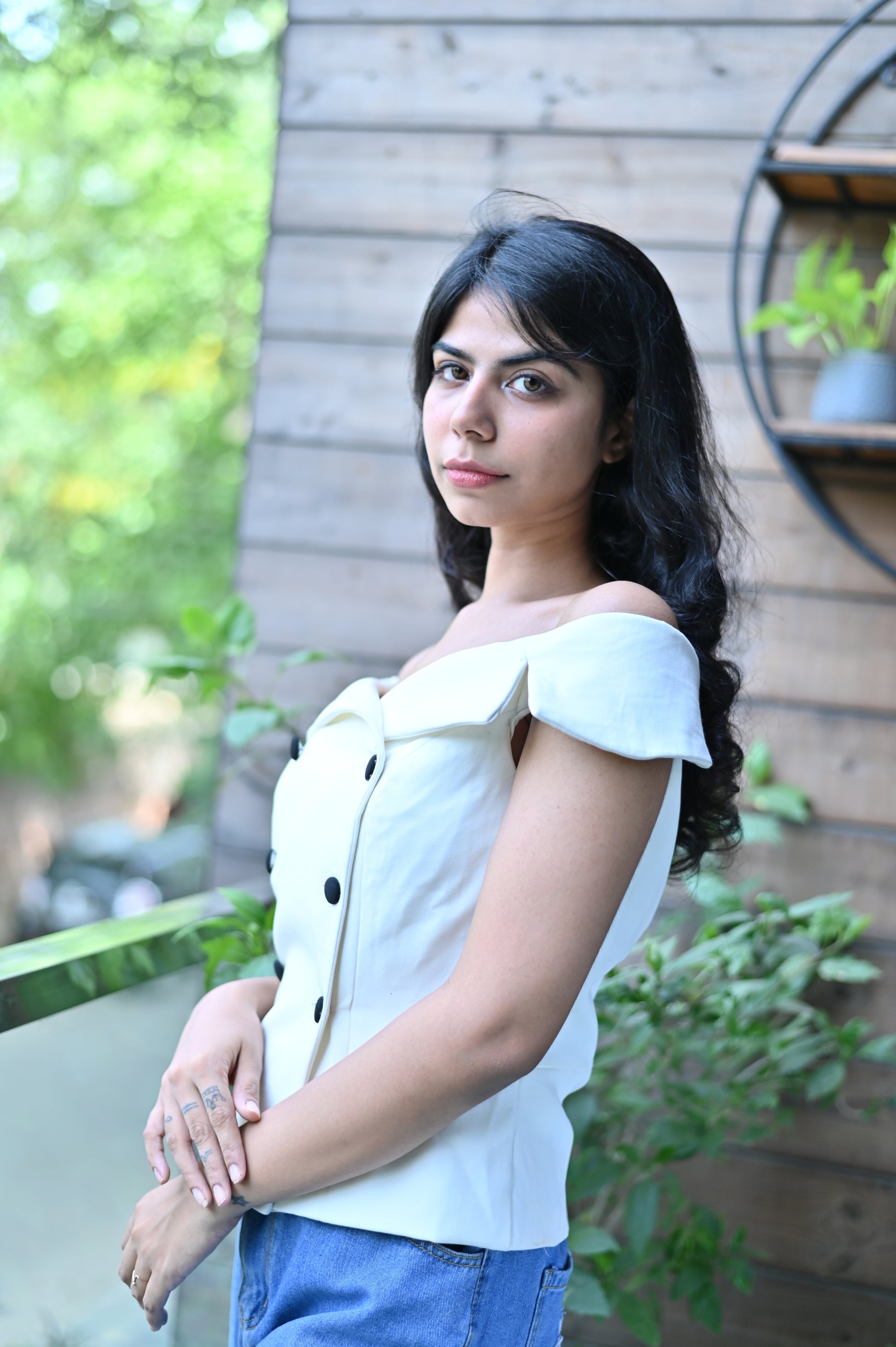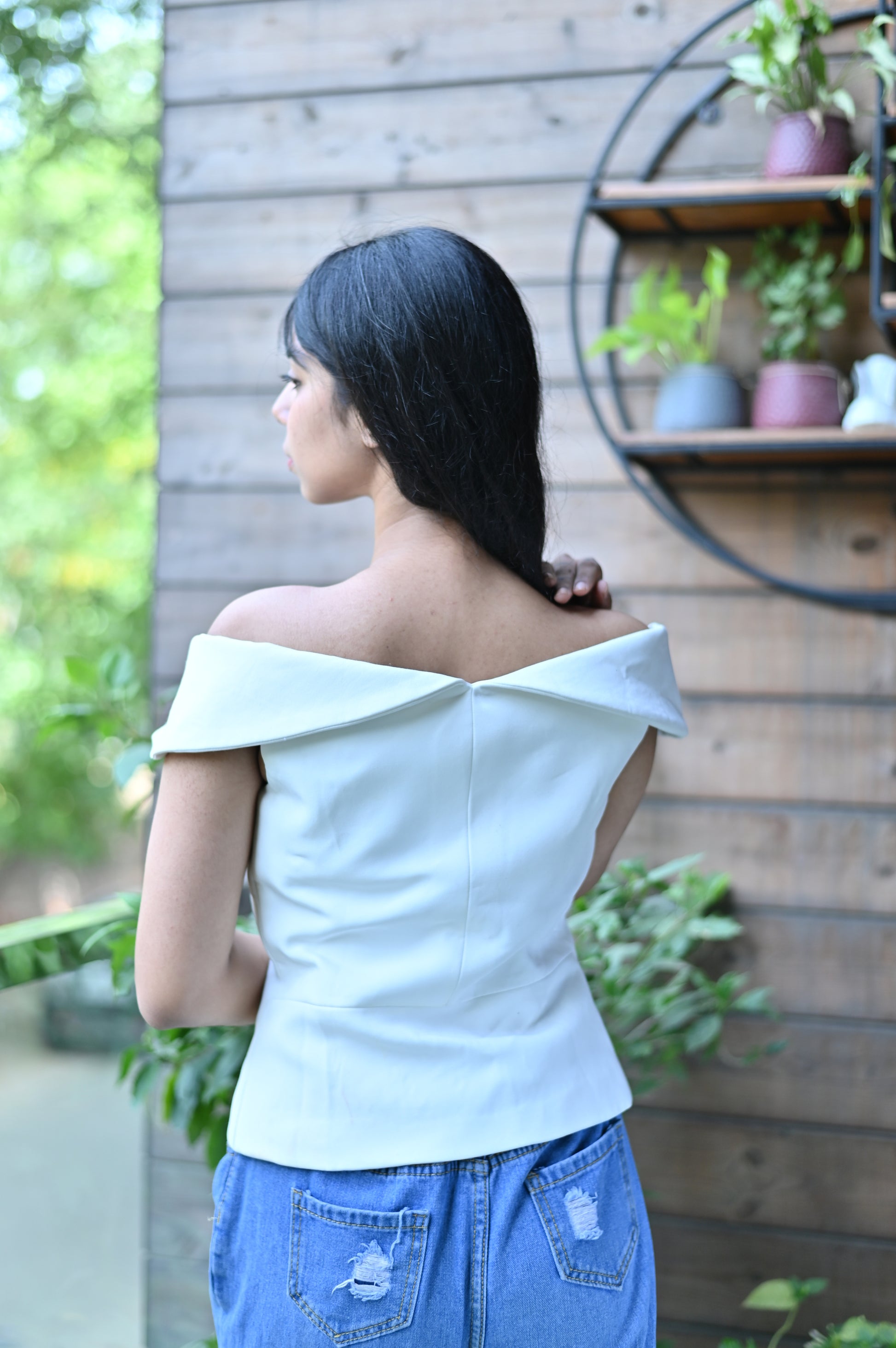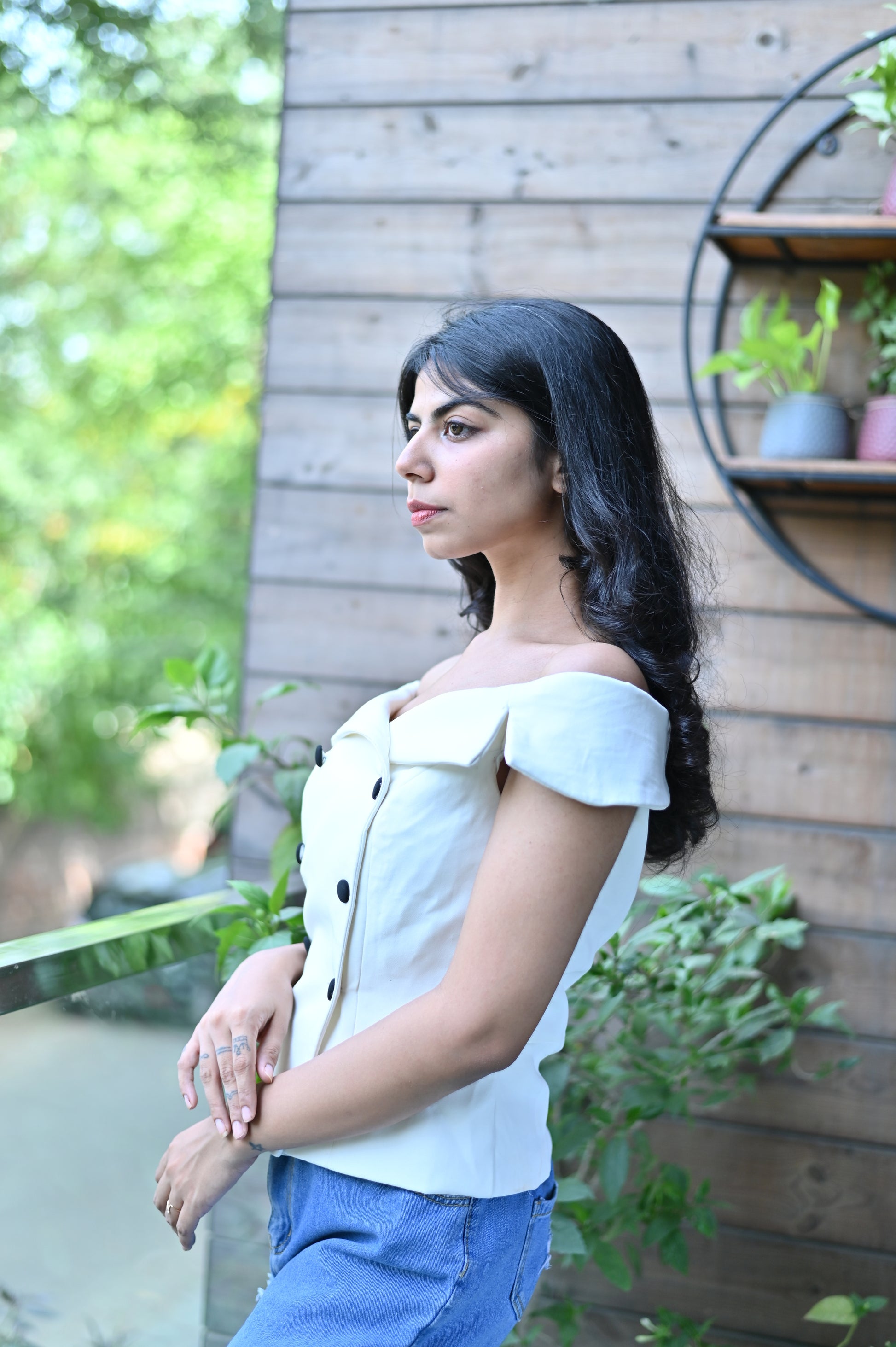 Off Shoulder Blazer Top is off-shoulder top with front black buttons.