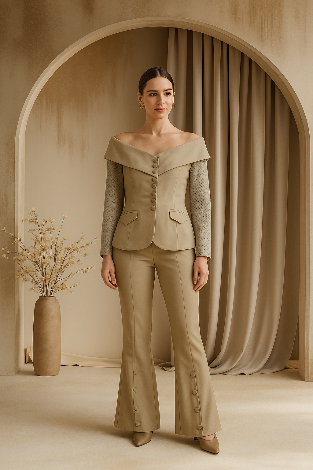 The Olive Green with lace Co-ord Set has a deep boat neckline collar with front buttons and pockets.