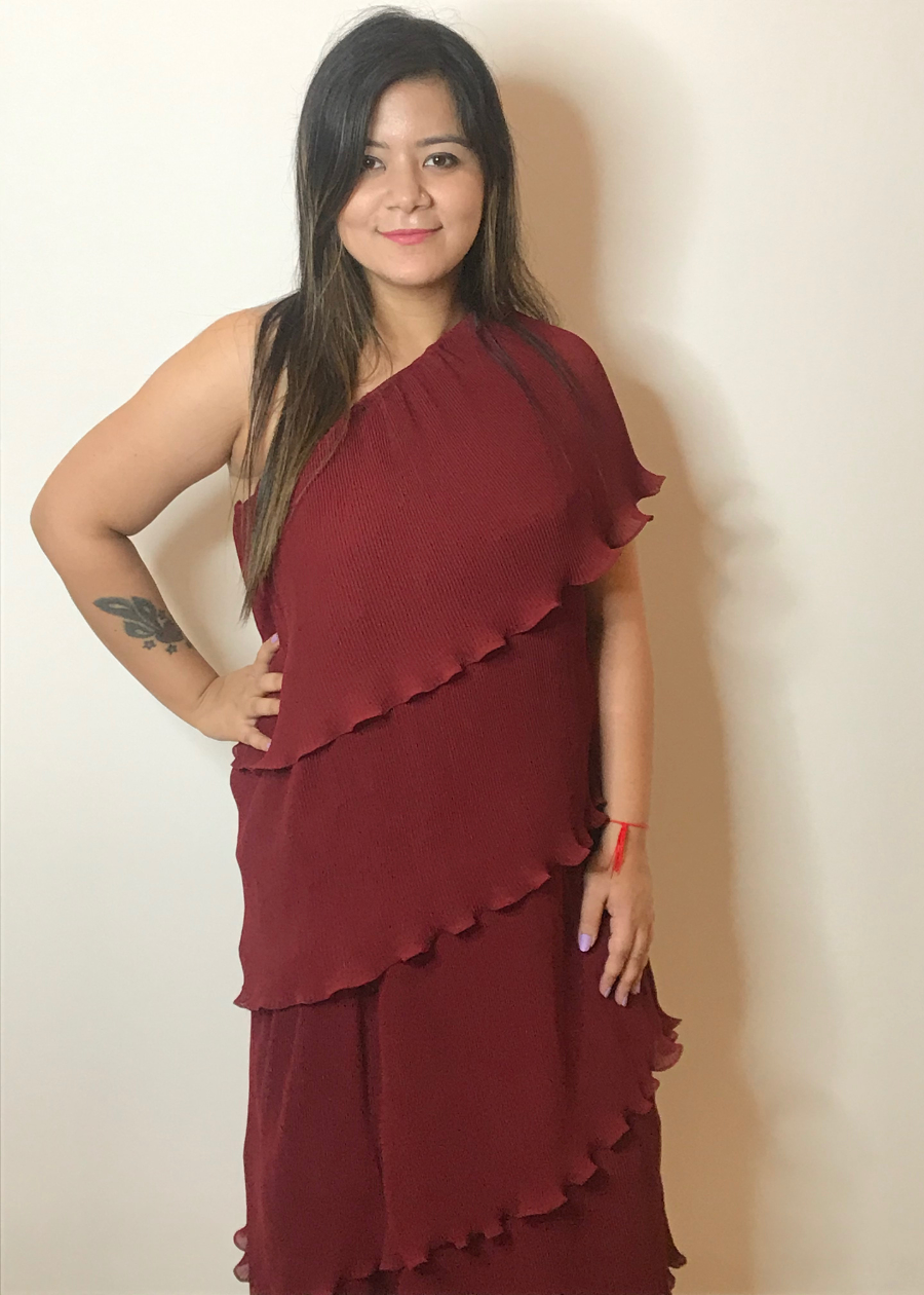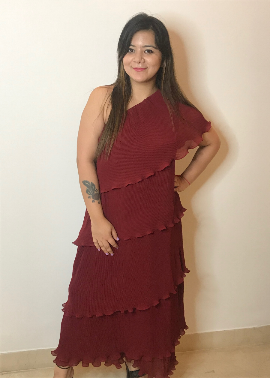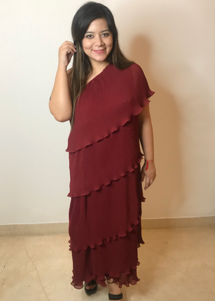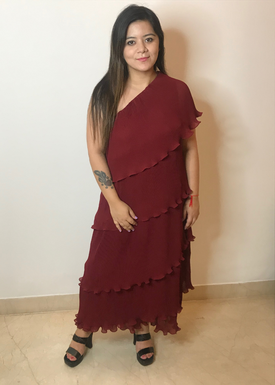 Maroon hued one shoulder maxi layered dress featuring pleated fabric .