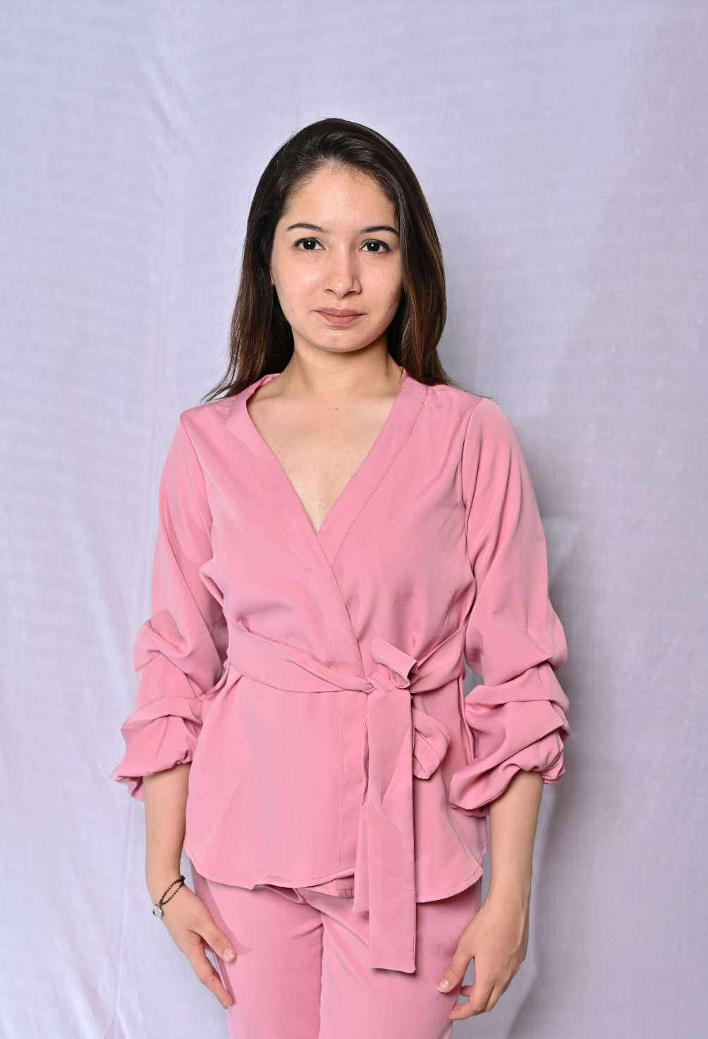 The Pastel Pink Tieable Co-ord Set has straight fit pants with a knot in front. It has v-neckline.