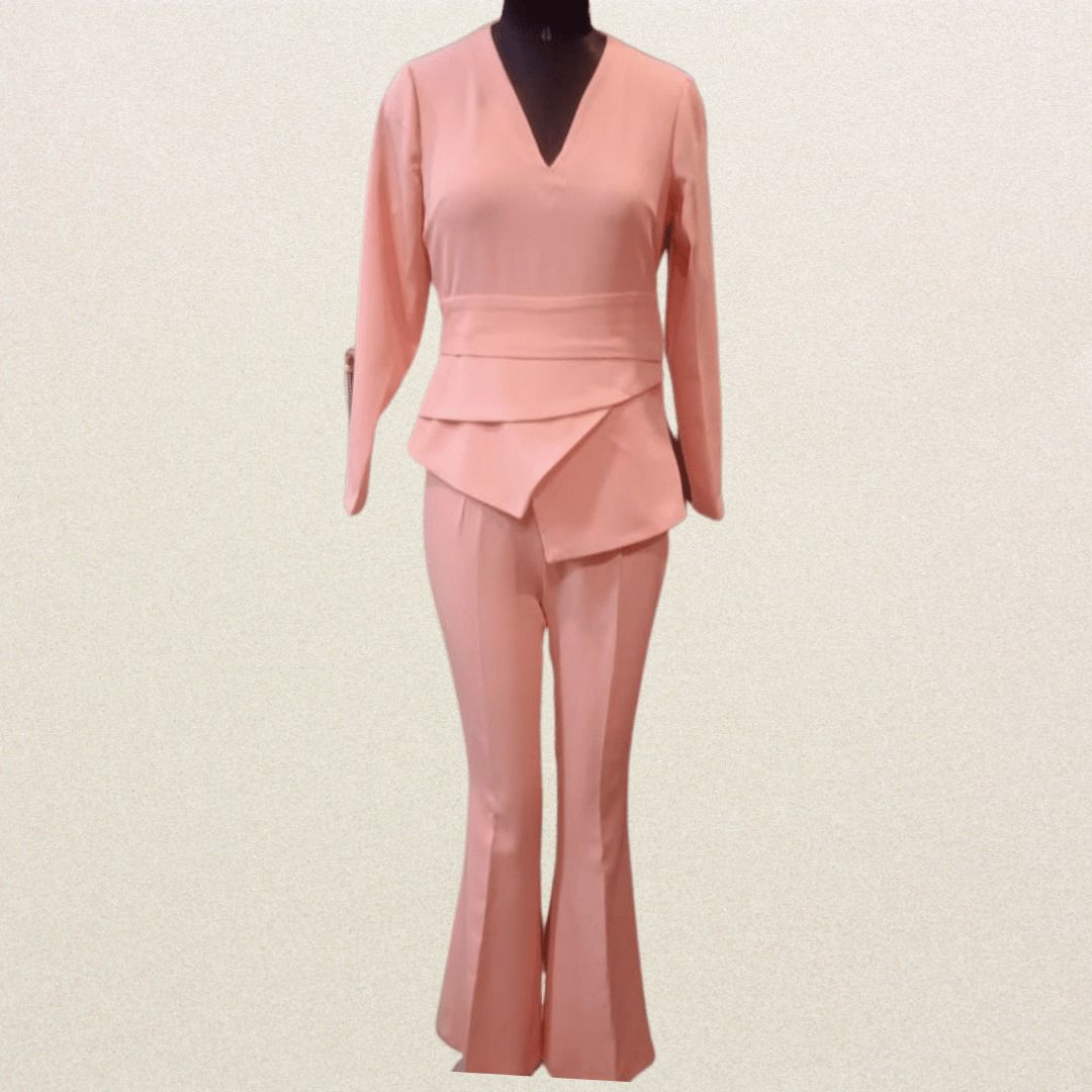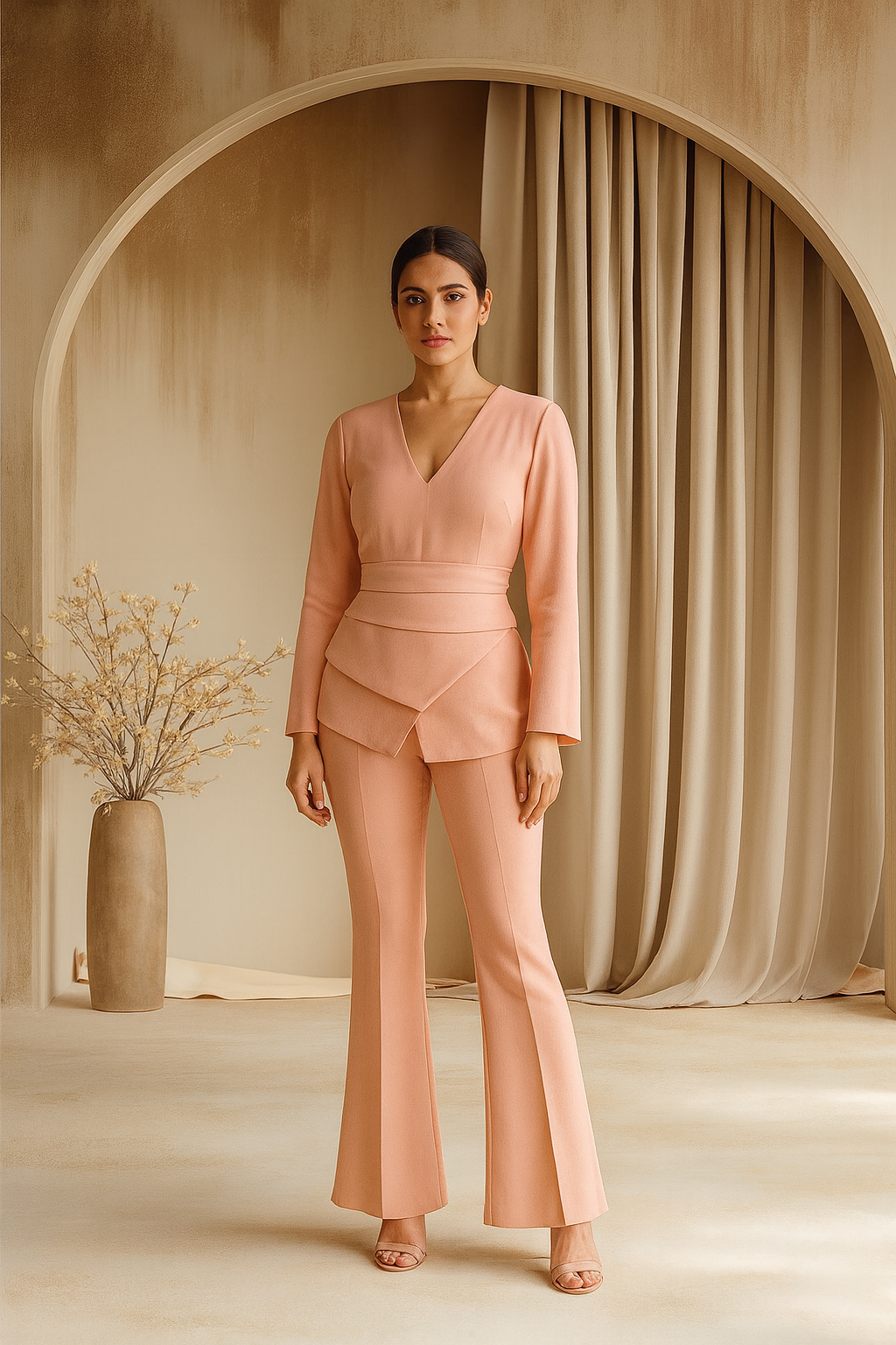 The Co-ord set has high low style top with V-neckline. It comes with the flared pants.
