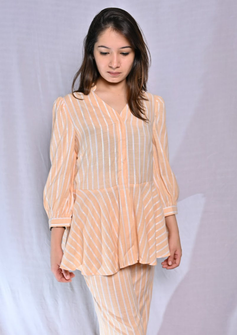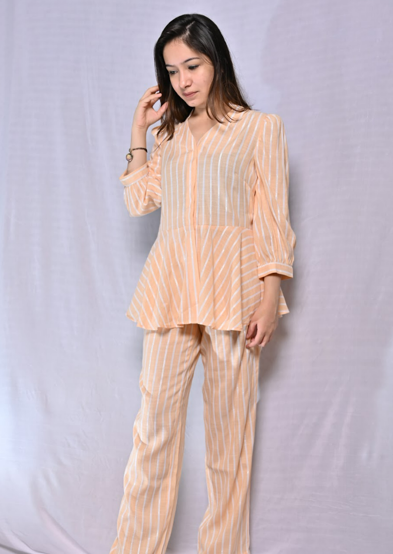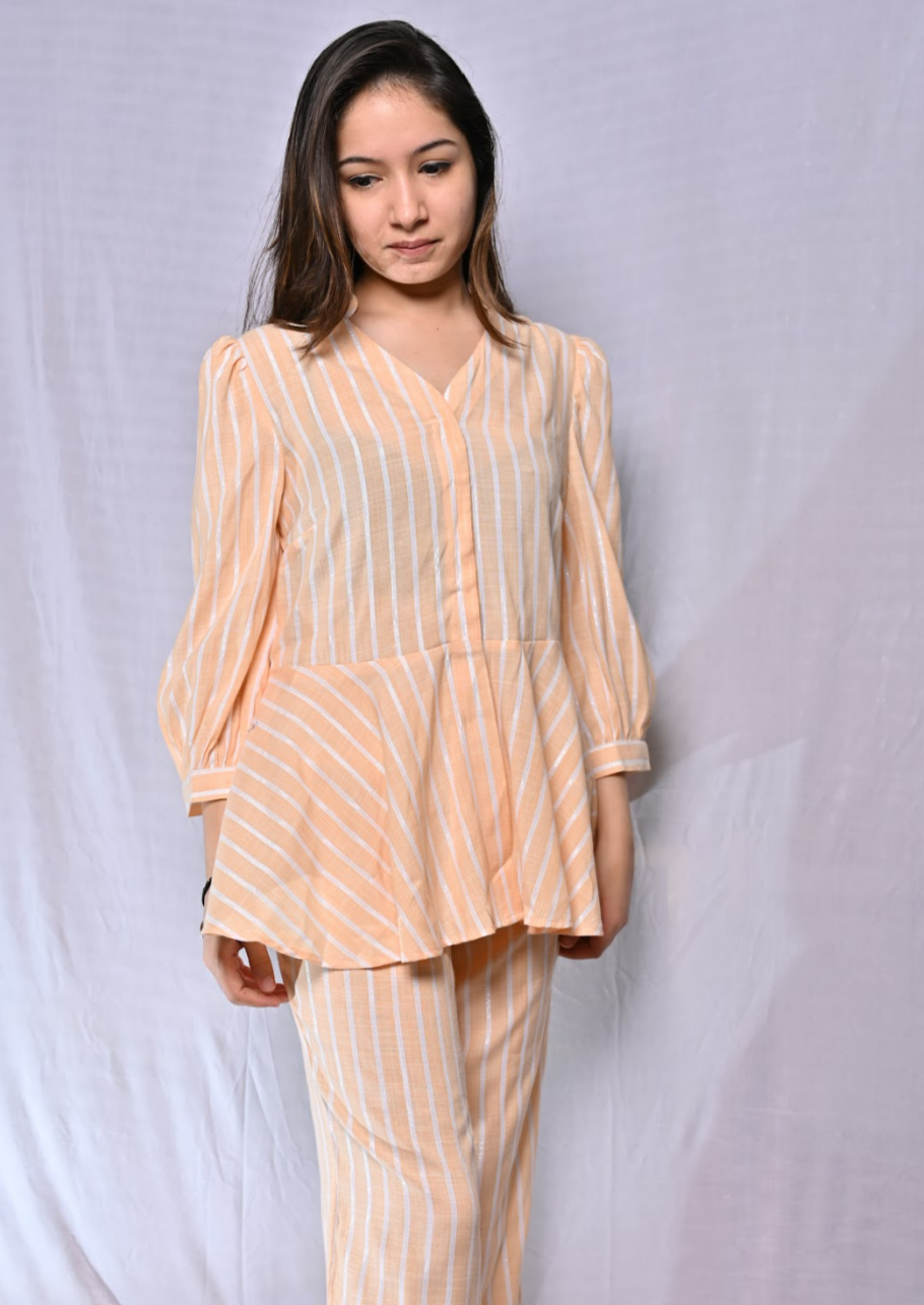 This Peach Co-ord Set comes in a striped pattern and gathered and pleated detail, a flared hem. Along with straight fit pants.
