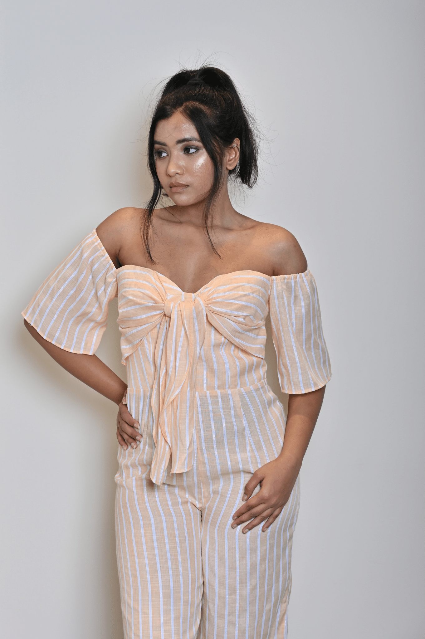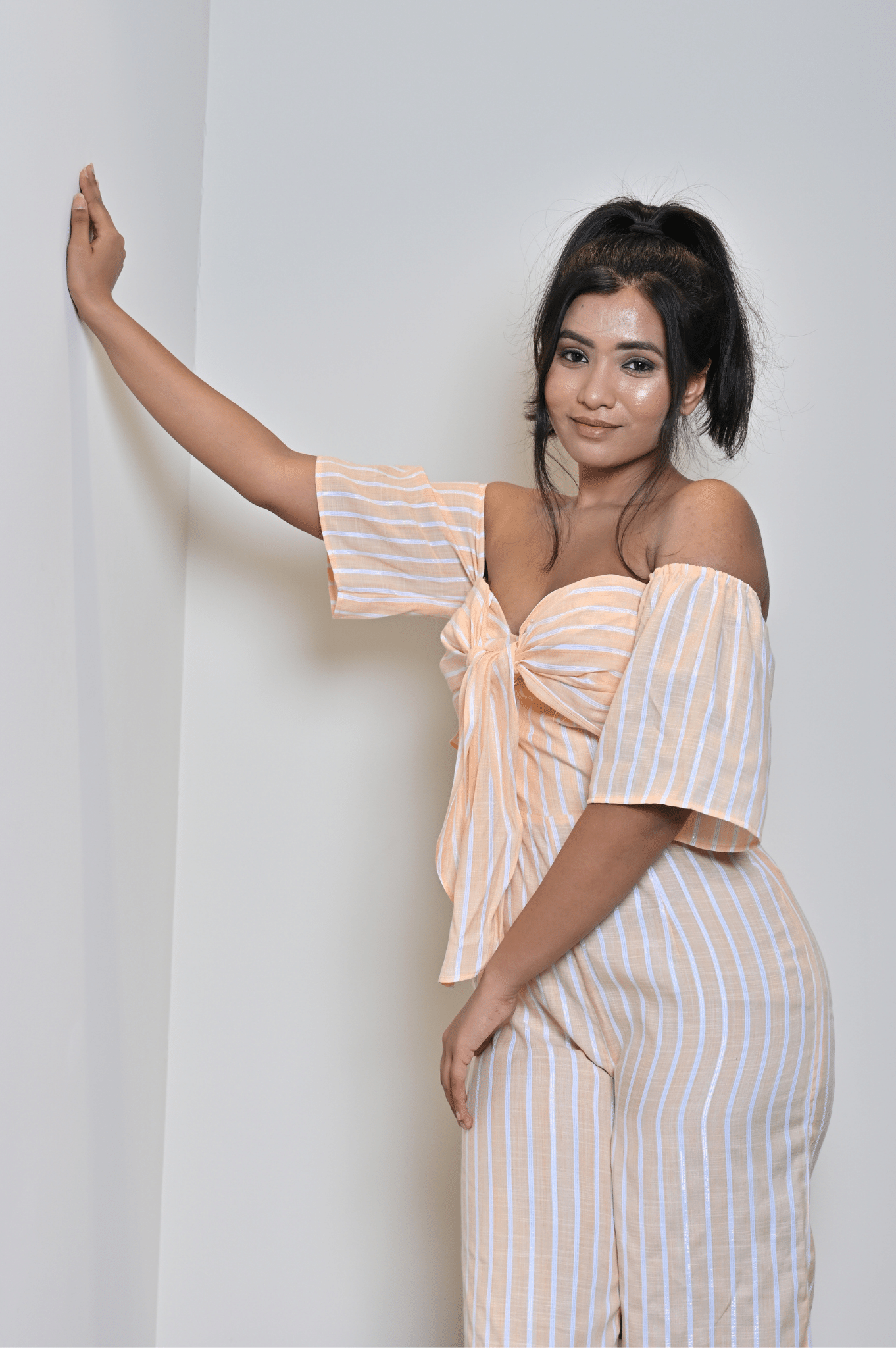 Strapless Cotton Peach lines jumpsuit with loose sleeves and tie knot.