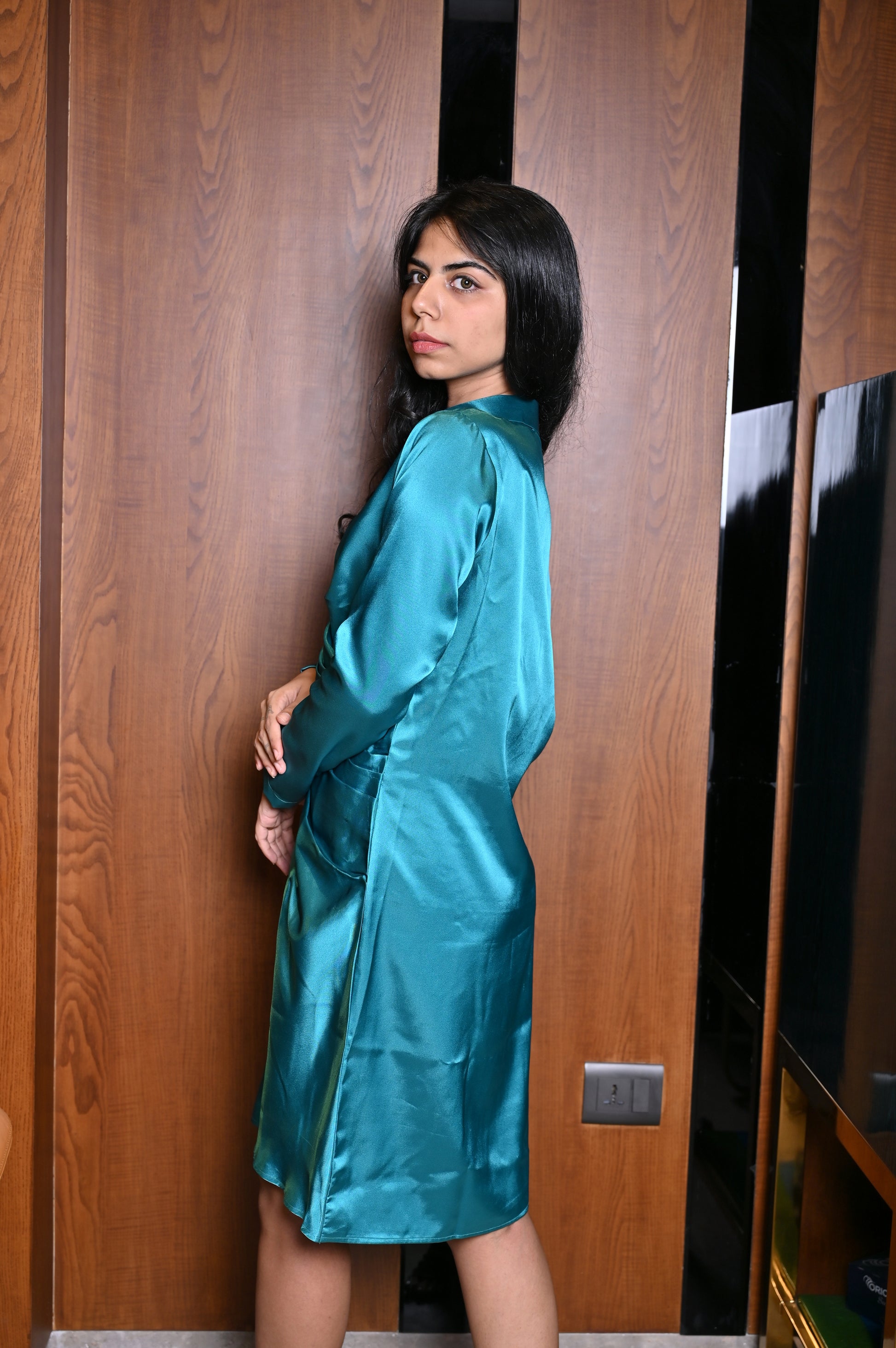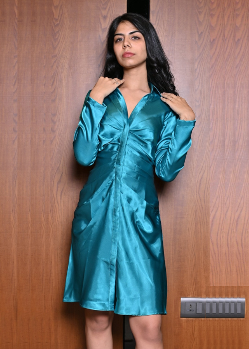 Peacock Button Down Dress has front drape with side cowls. It's a mid-length dress.