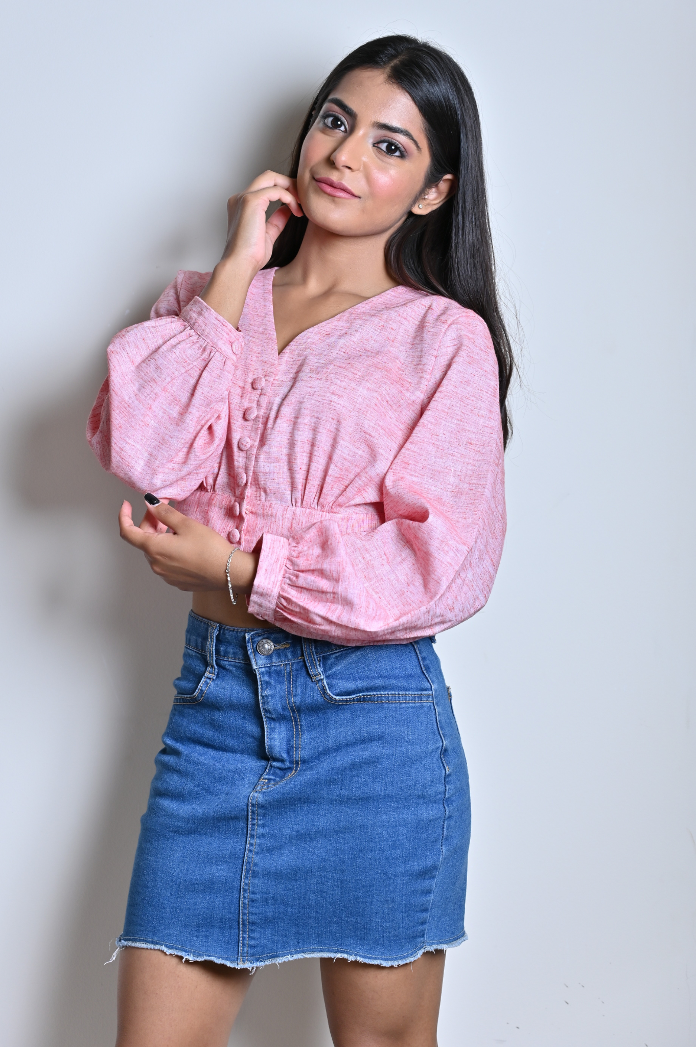 Pink crop top featuring v neckline with balloon sleeves and fabric buttons.