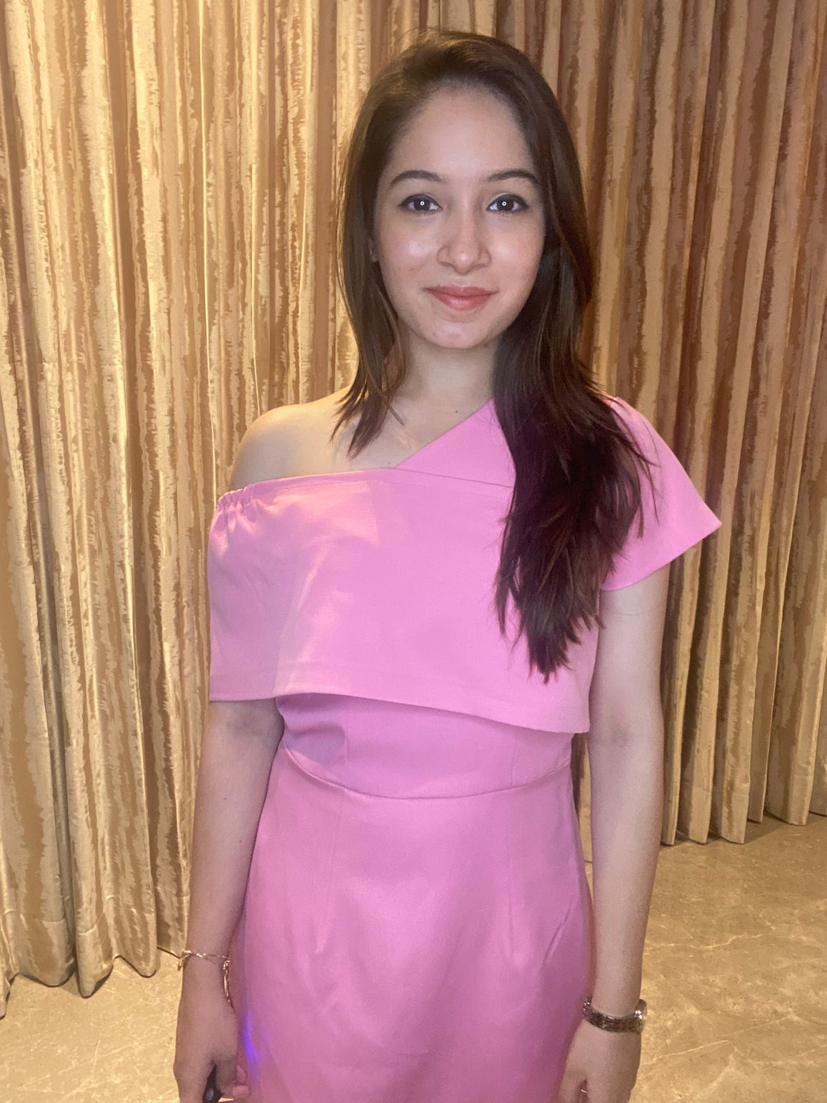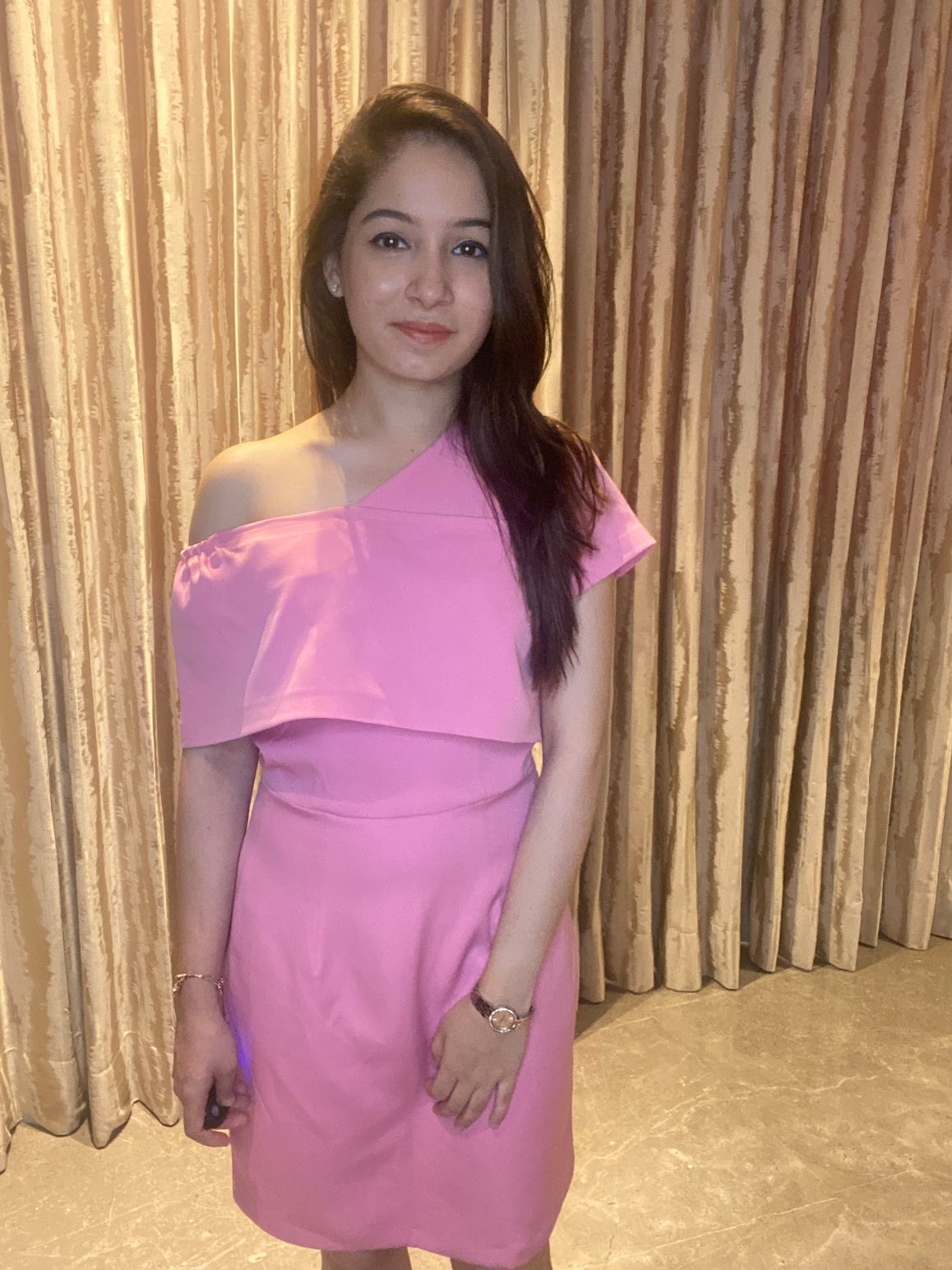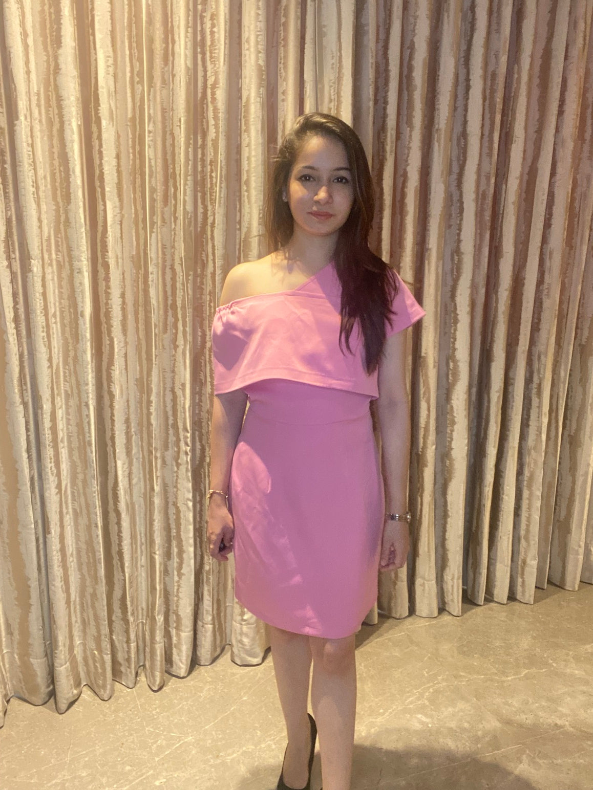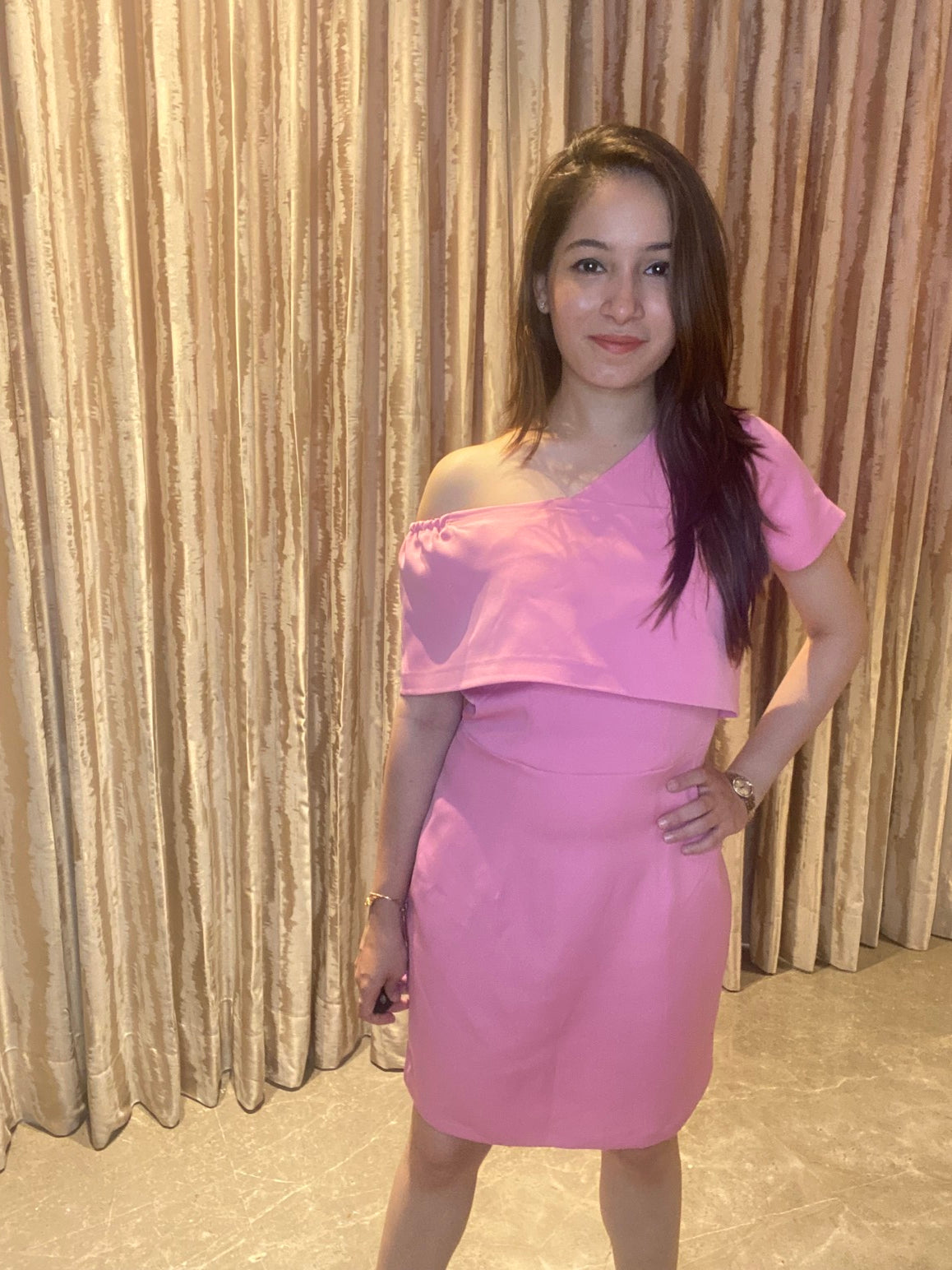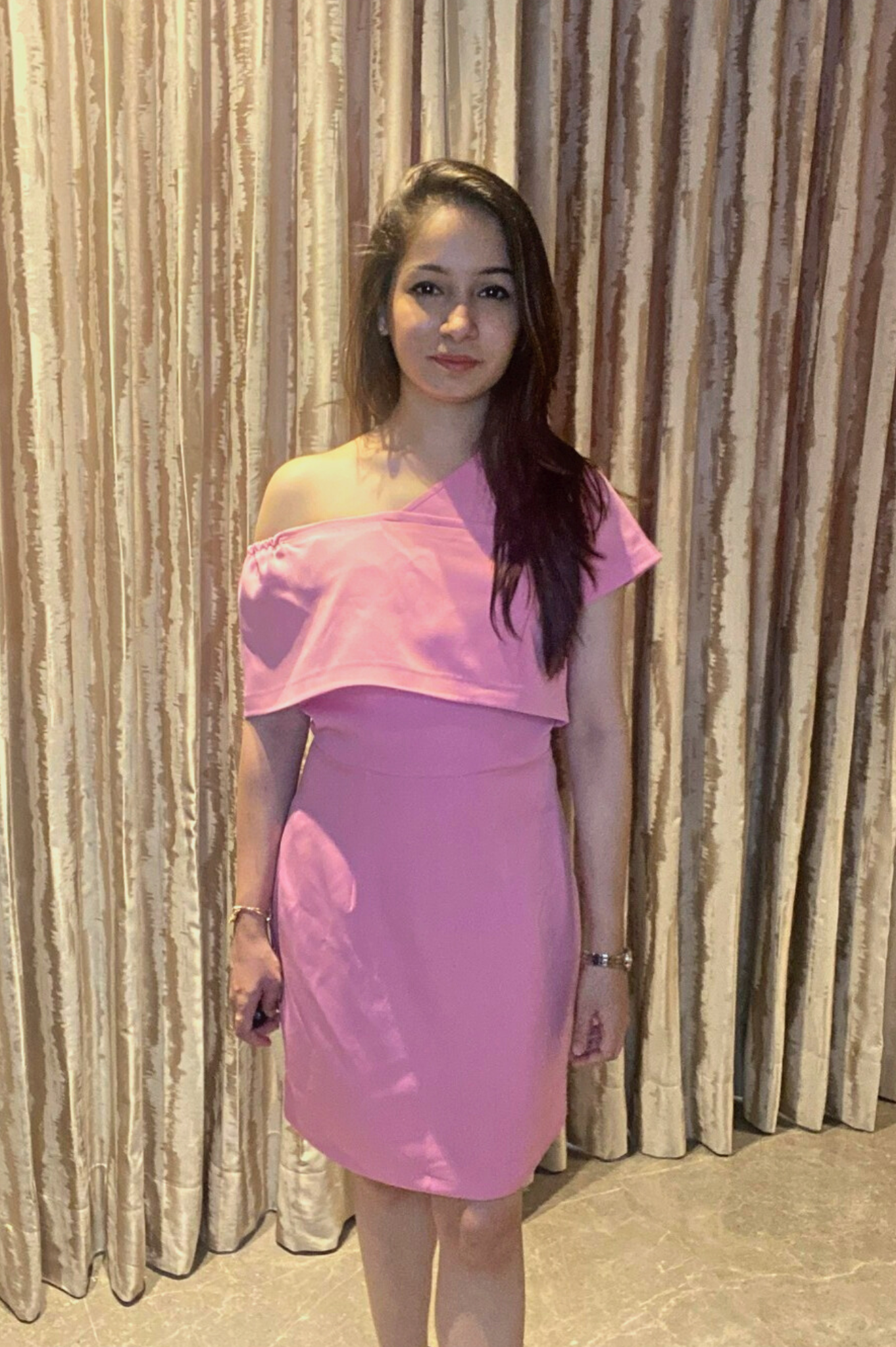 Pink one side shoulder dress with sleeves and upper panel on the other side .
