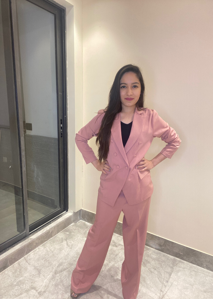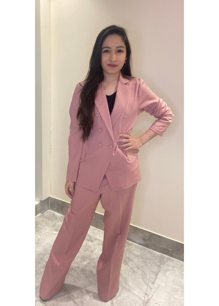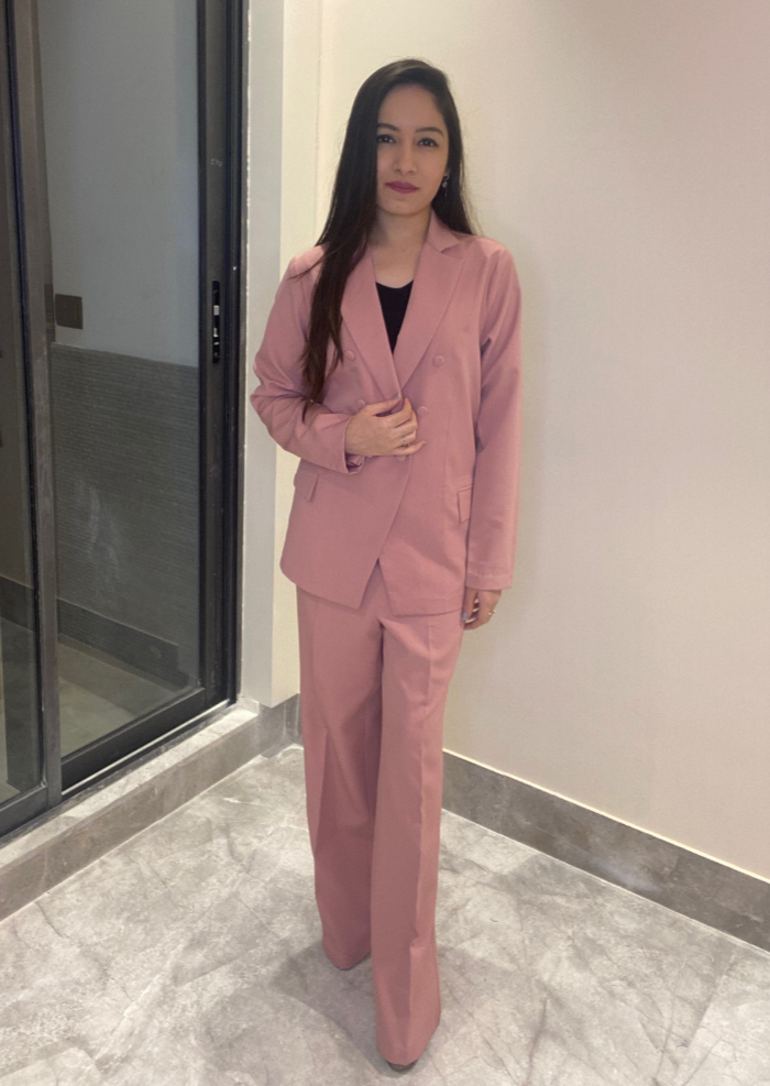 blush pink suit with front buttoned coat & pants.