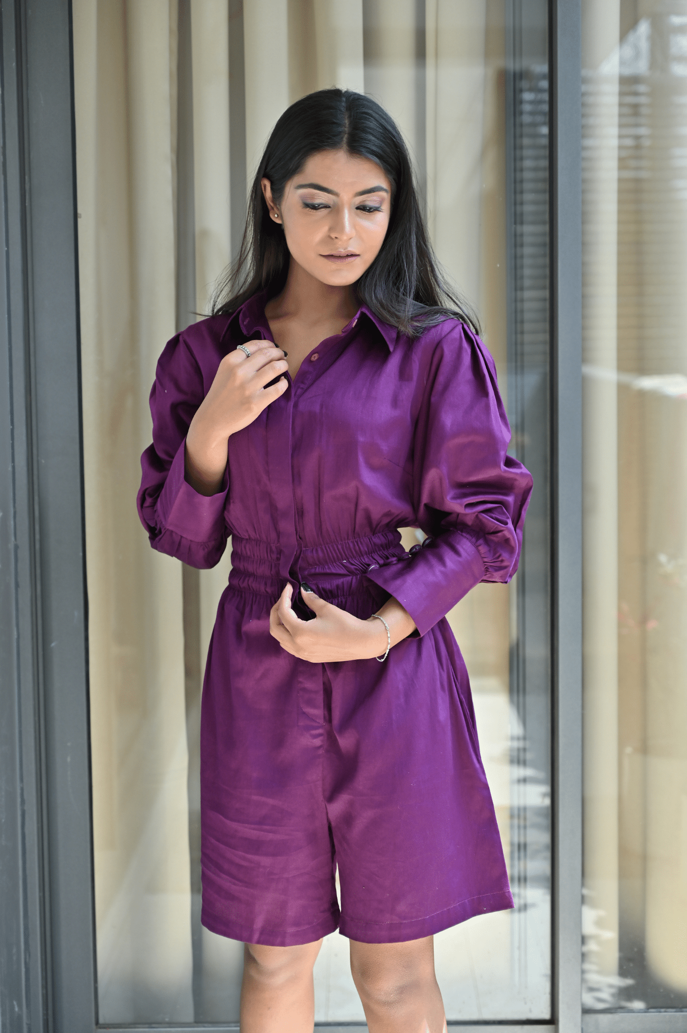 Purple play suit with elastic on the waist line with cuffs and fabric buttons.