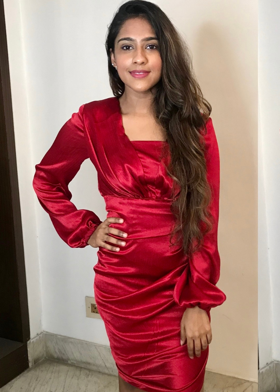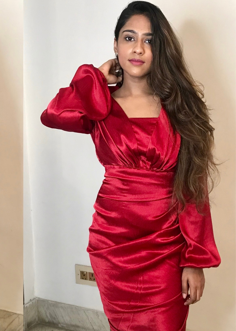 Red satin draped dress featuring v neckline and full sleeves .