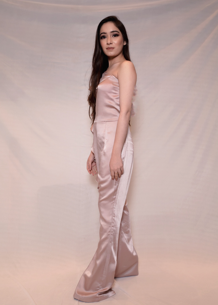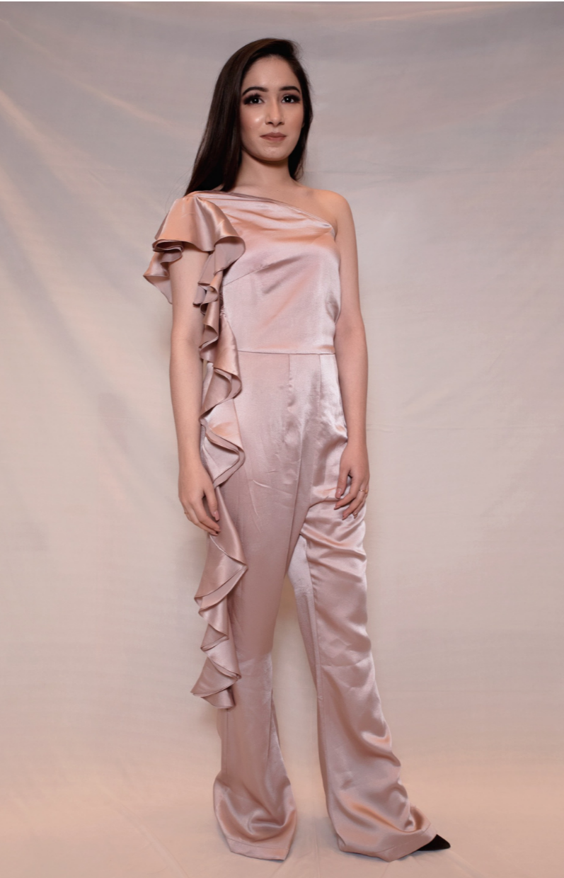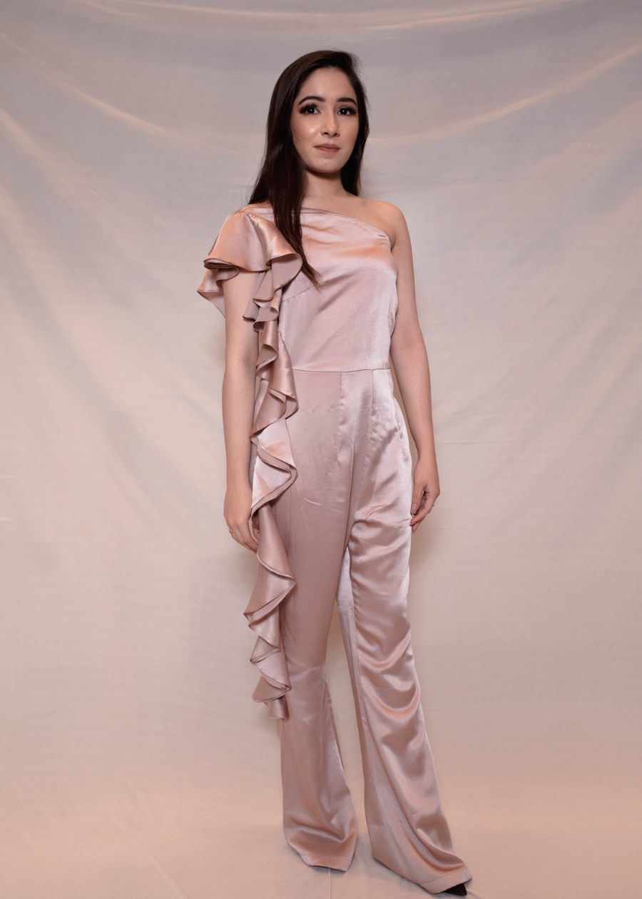 Glowing pink one shoulder jumpsuit with side seem frill work.