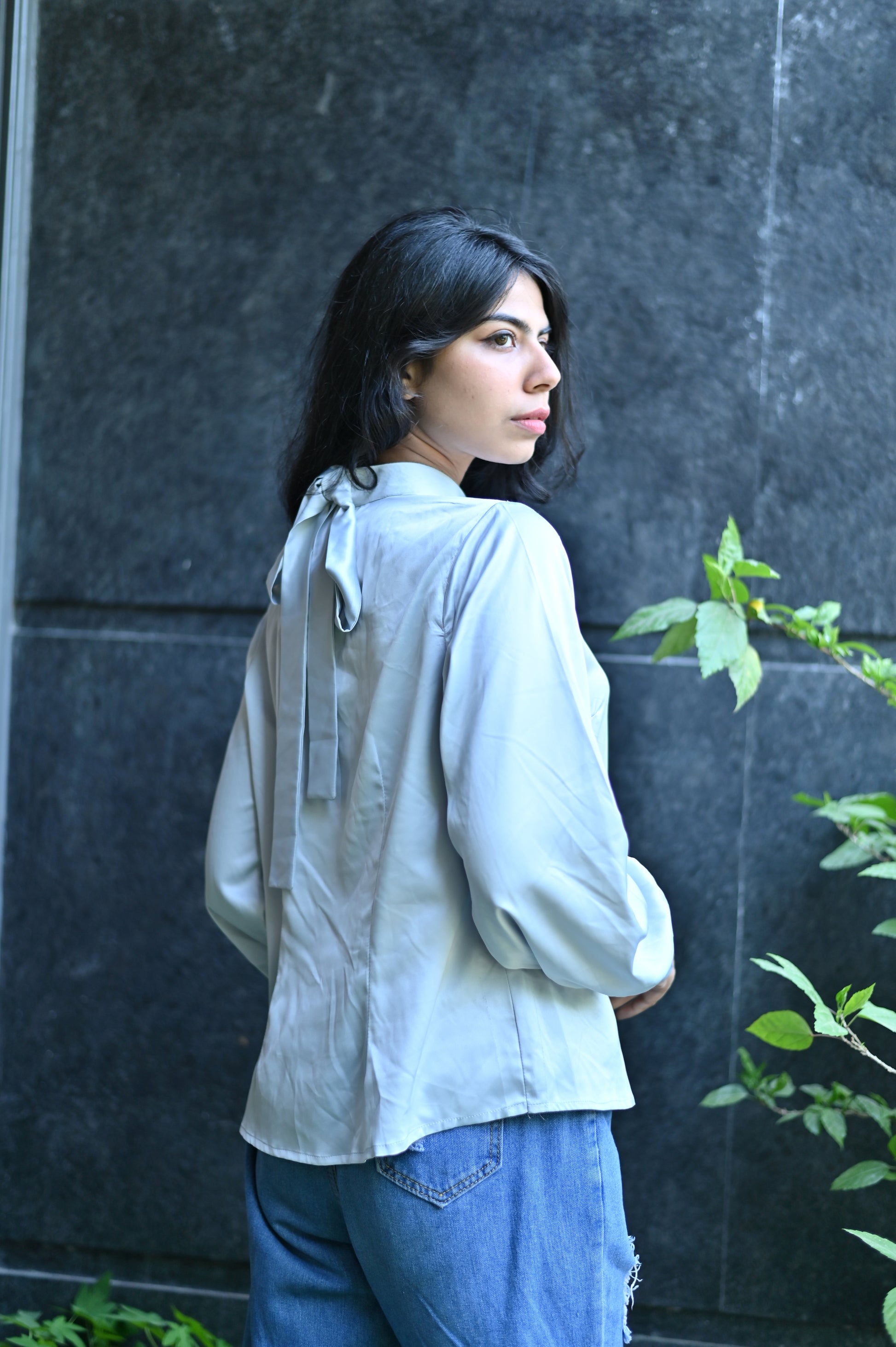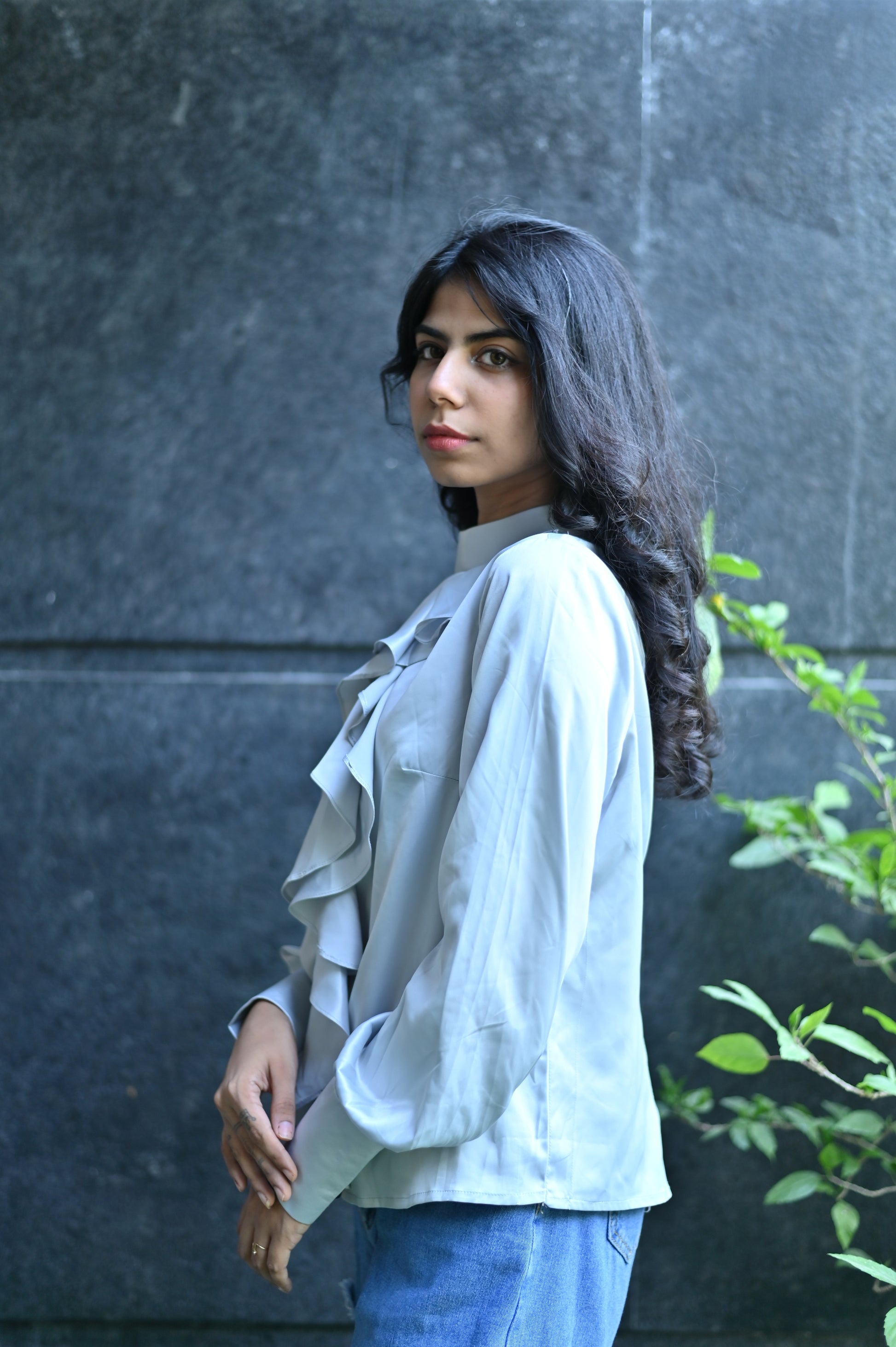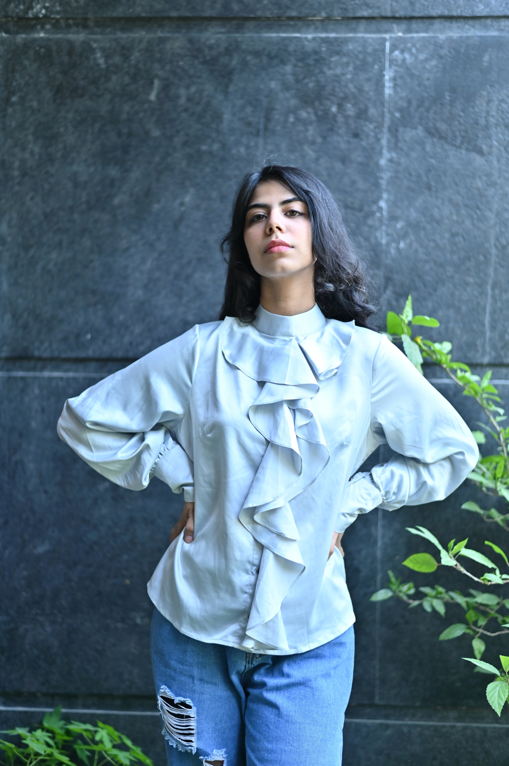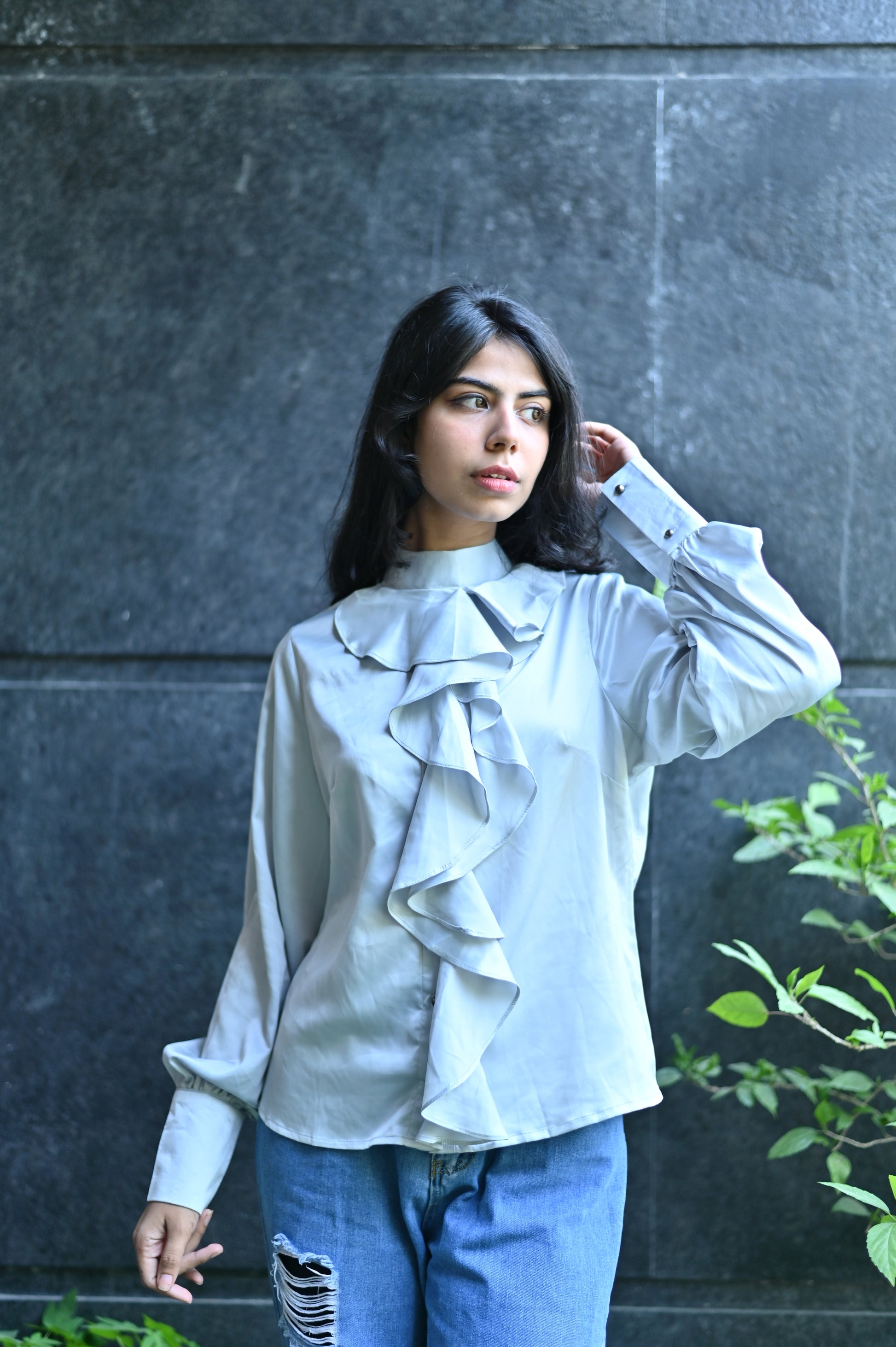 Silver Grey Band Top in satin fabric is soft, lightweight with a seamless high collar and ruffles in the front. It is comfortable yet chic silhouette making this a unique piece to own!