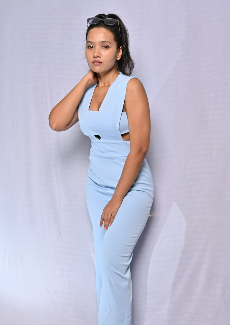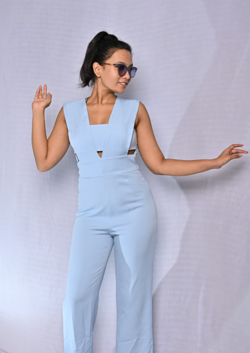 This sky blue Jumpsuit is sleeveless and the straps create a center and side keyhole cutout. Along with relaxed wide-leg bottoms.