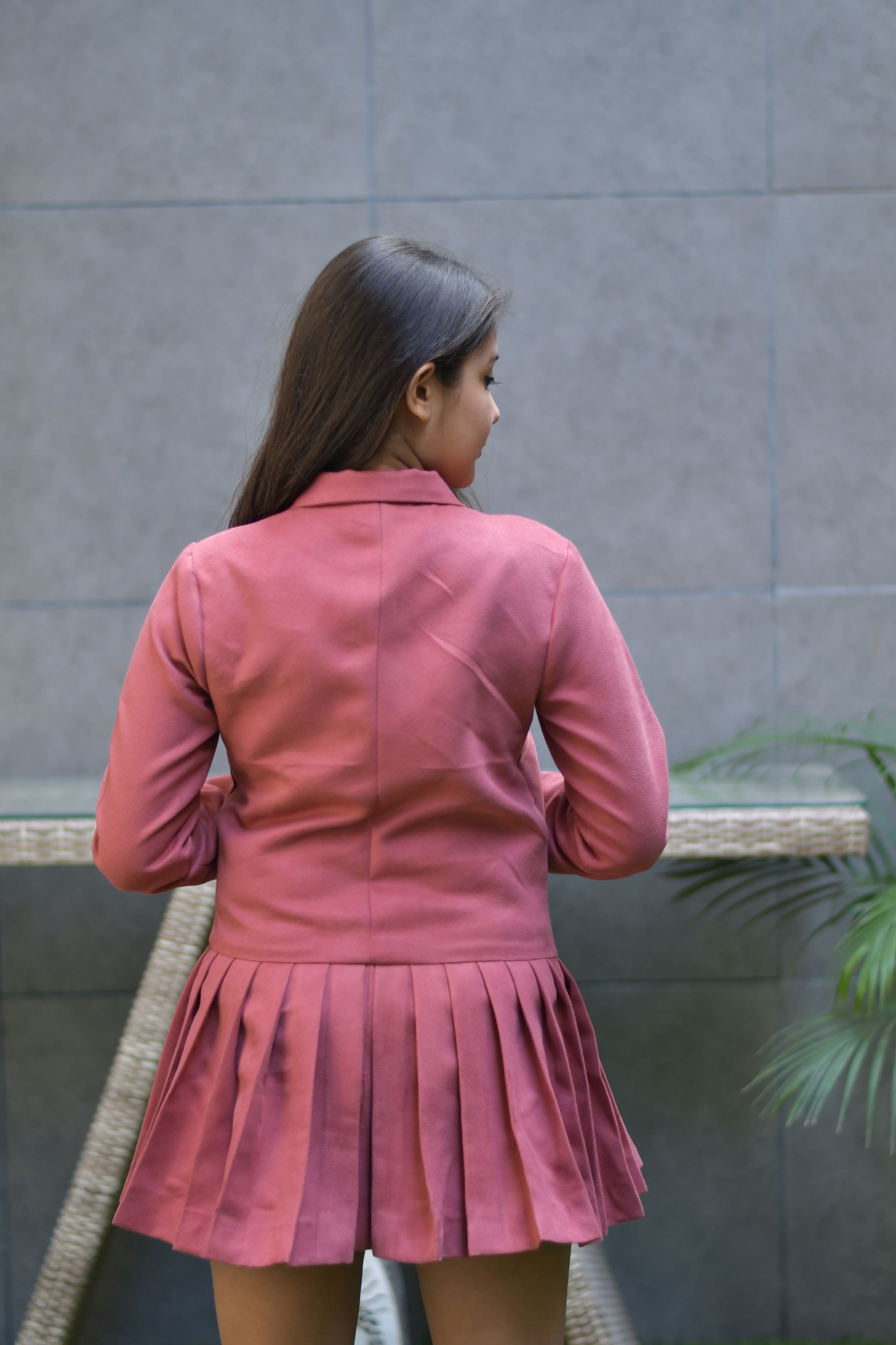 Suede woollen blazer dress featuring pleats on the hem with 6 buttons .