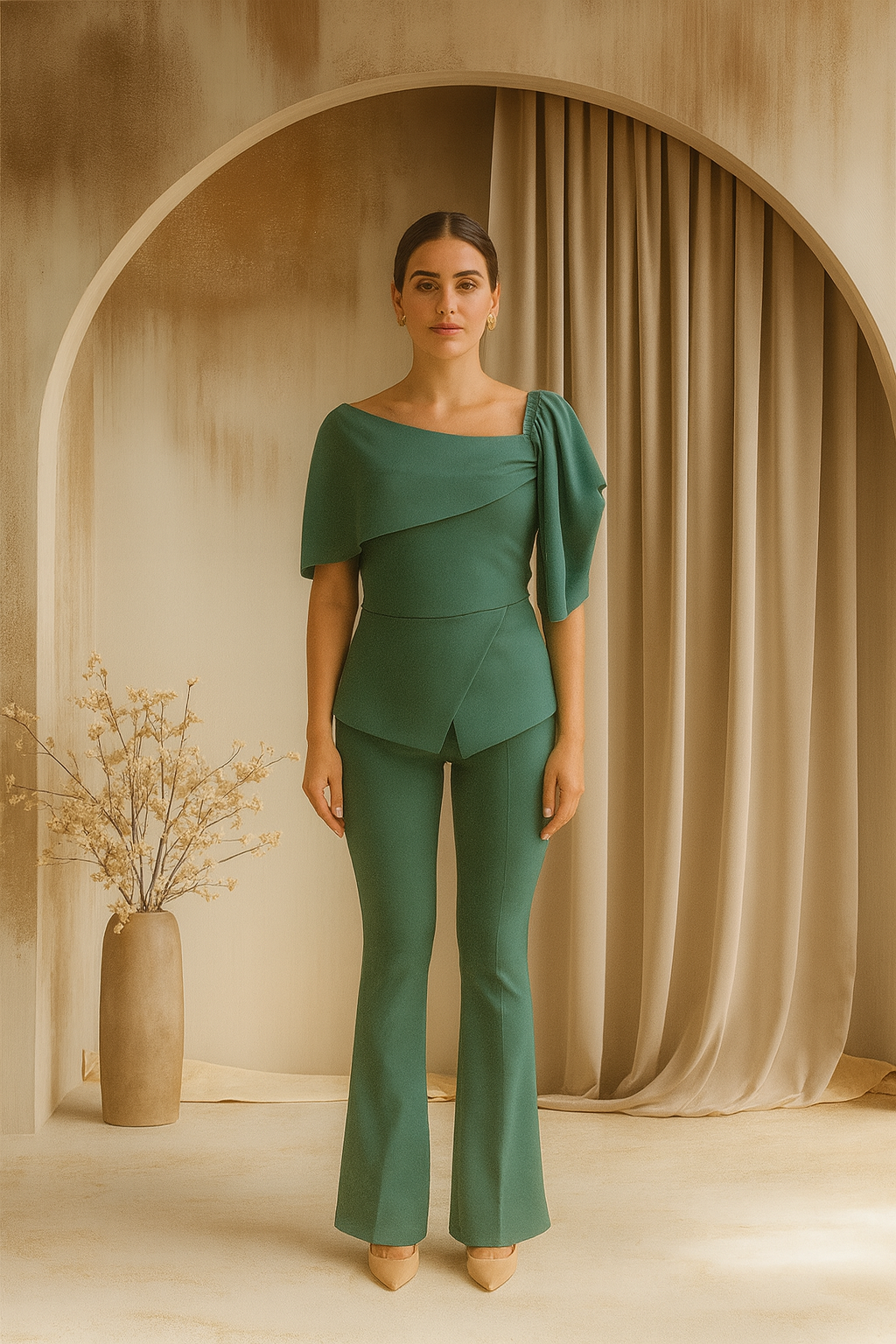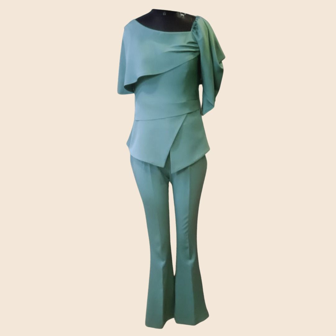This coord set has Draped sleeves with high low hem line with bell bottom pants .