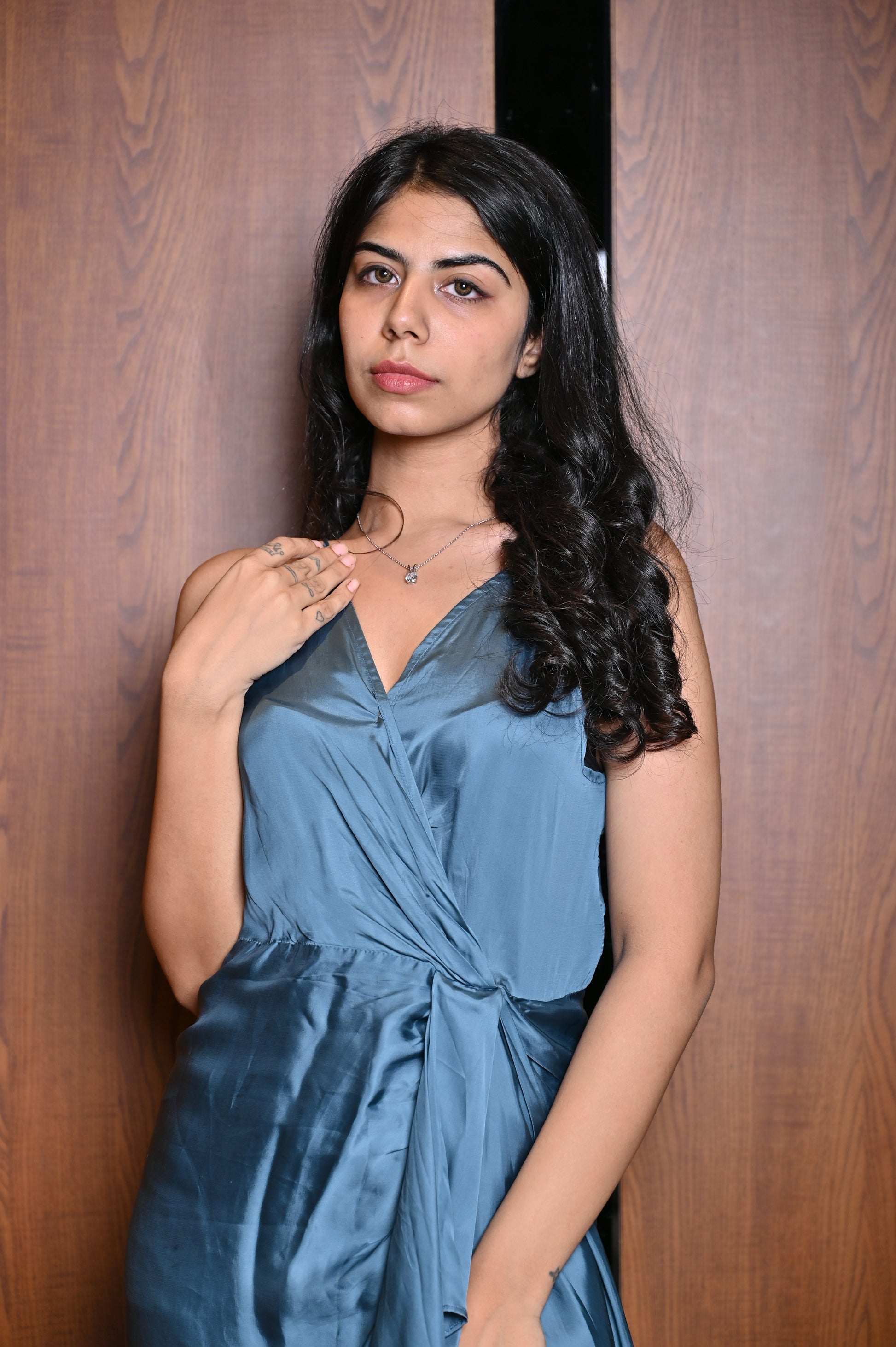Teal Strap Drape Dress has strap sleeves with drape at bottom. It has front slit and v-neckline.