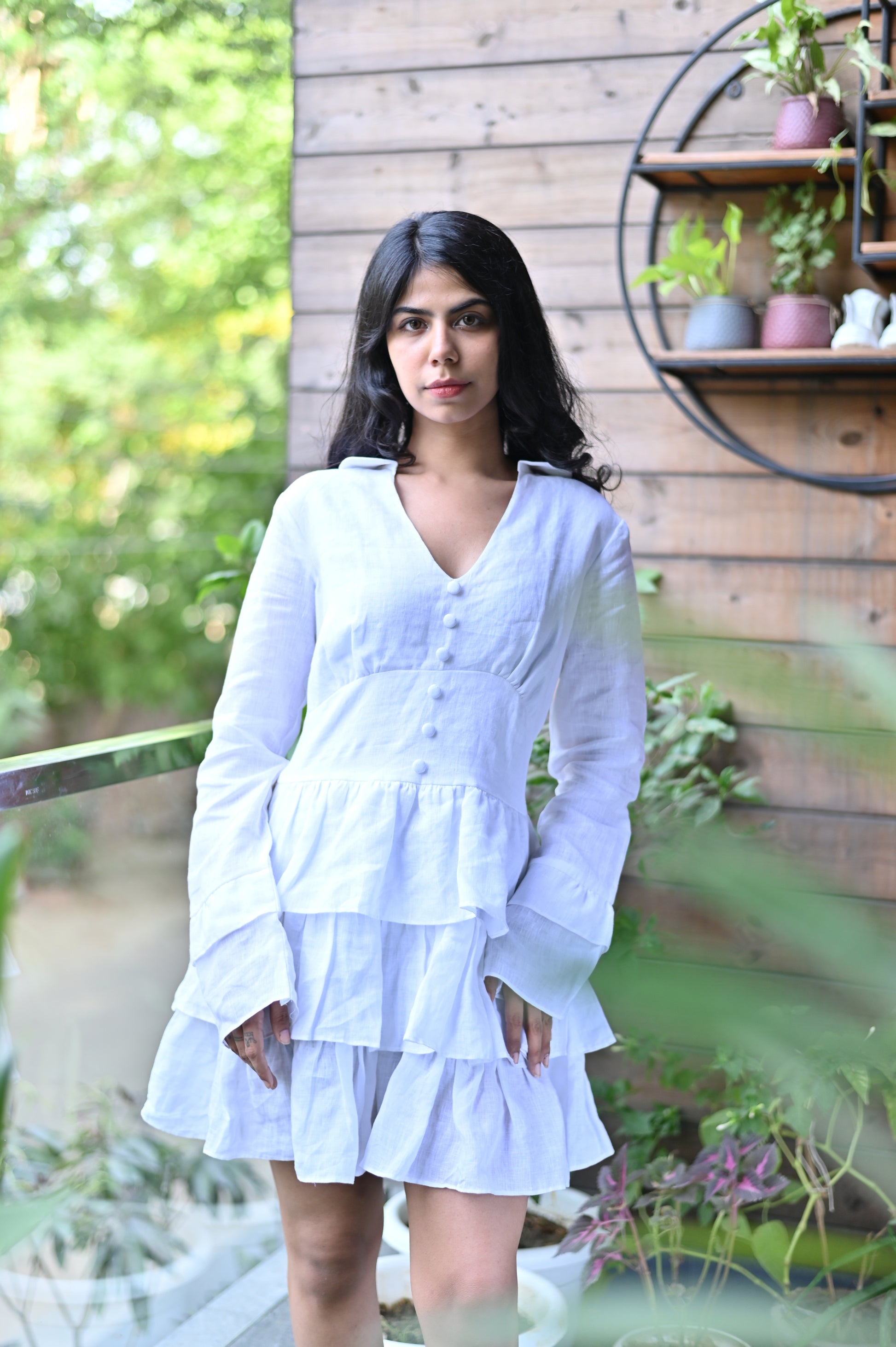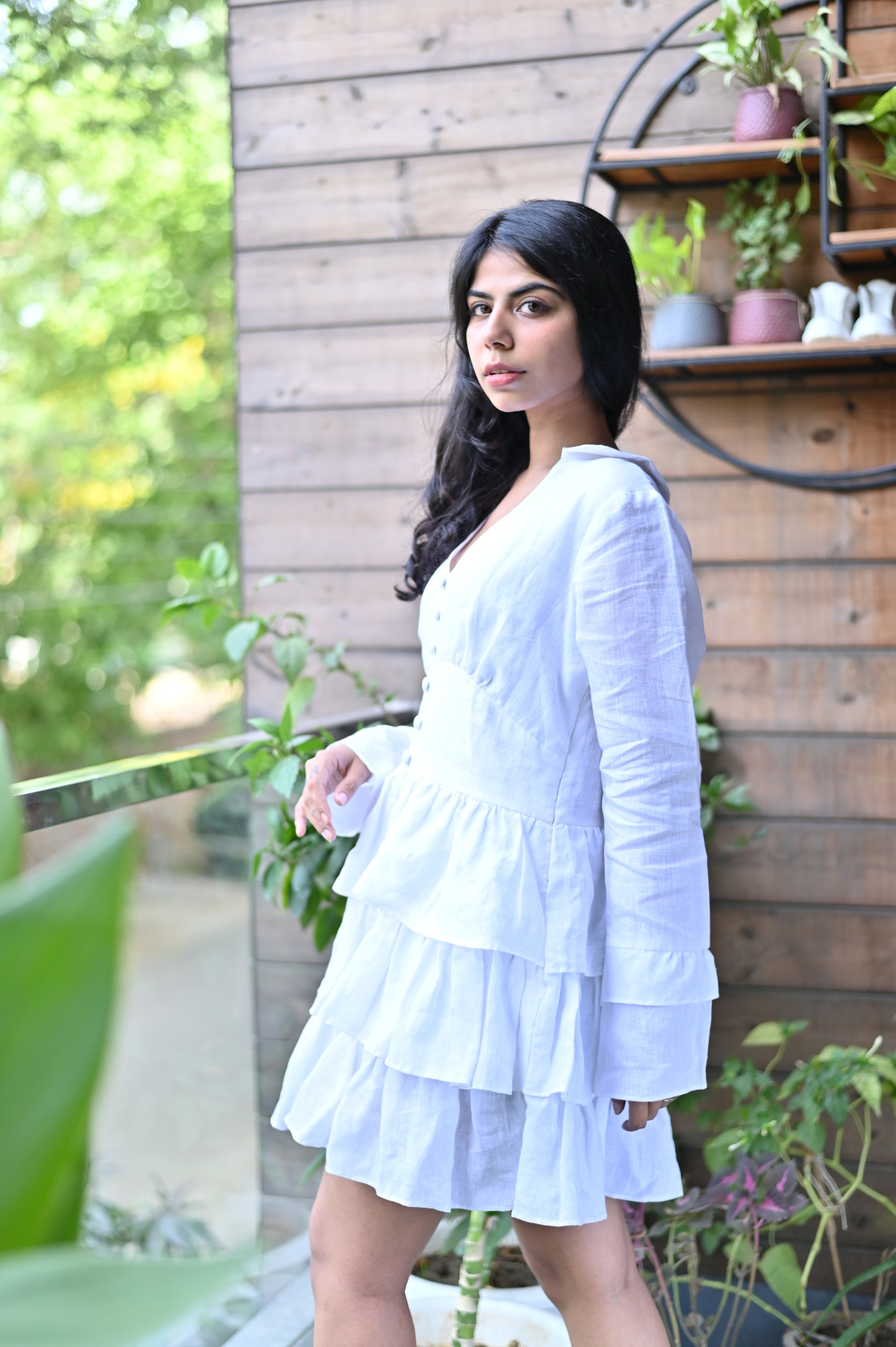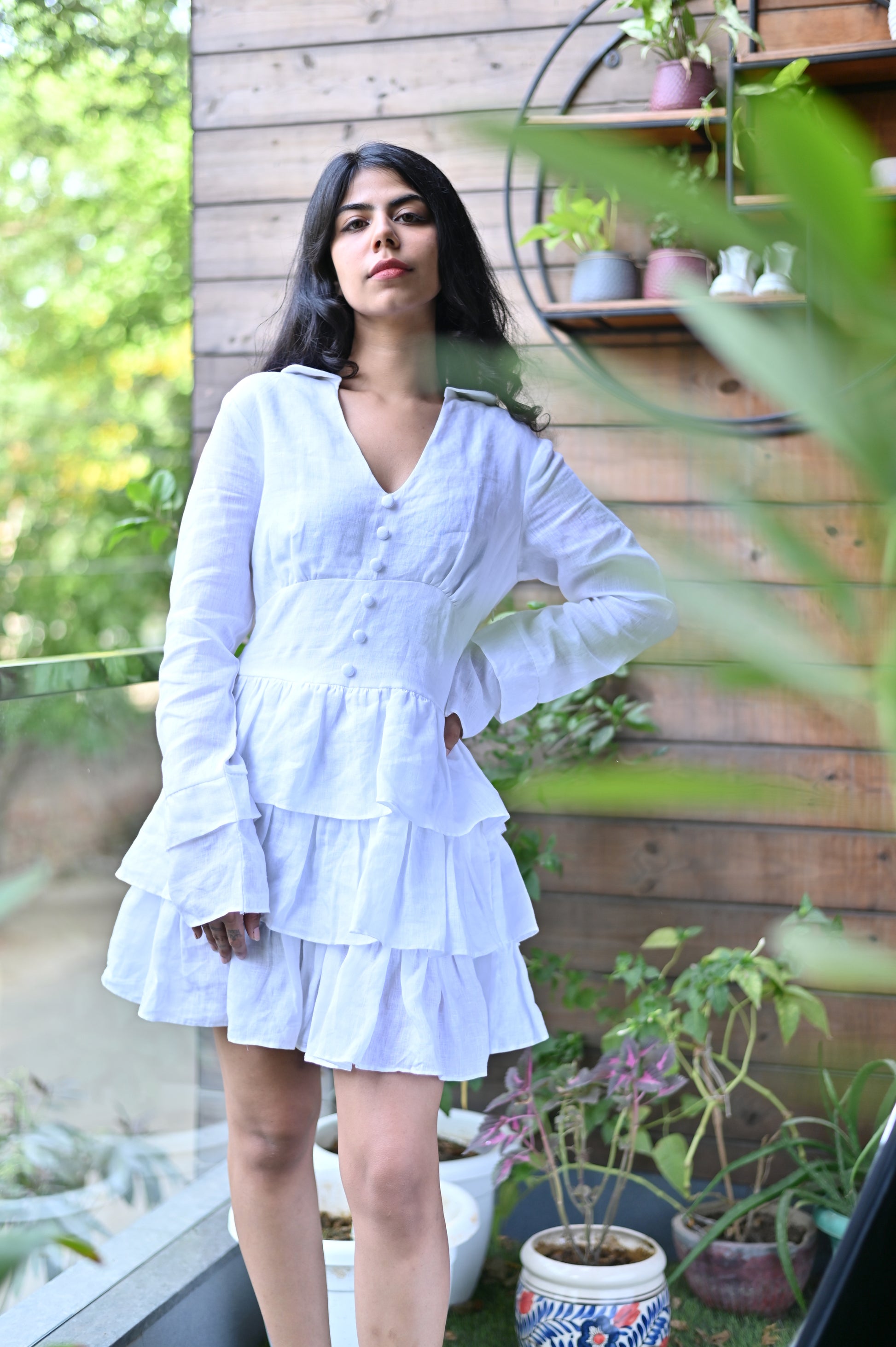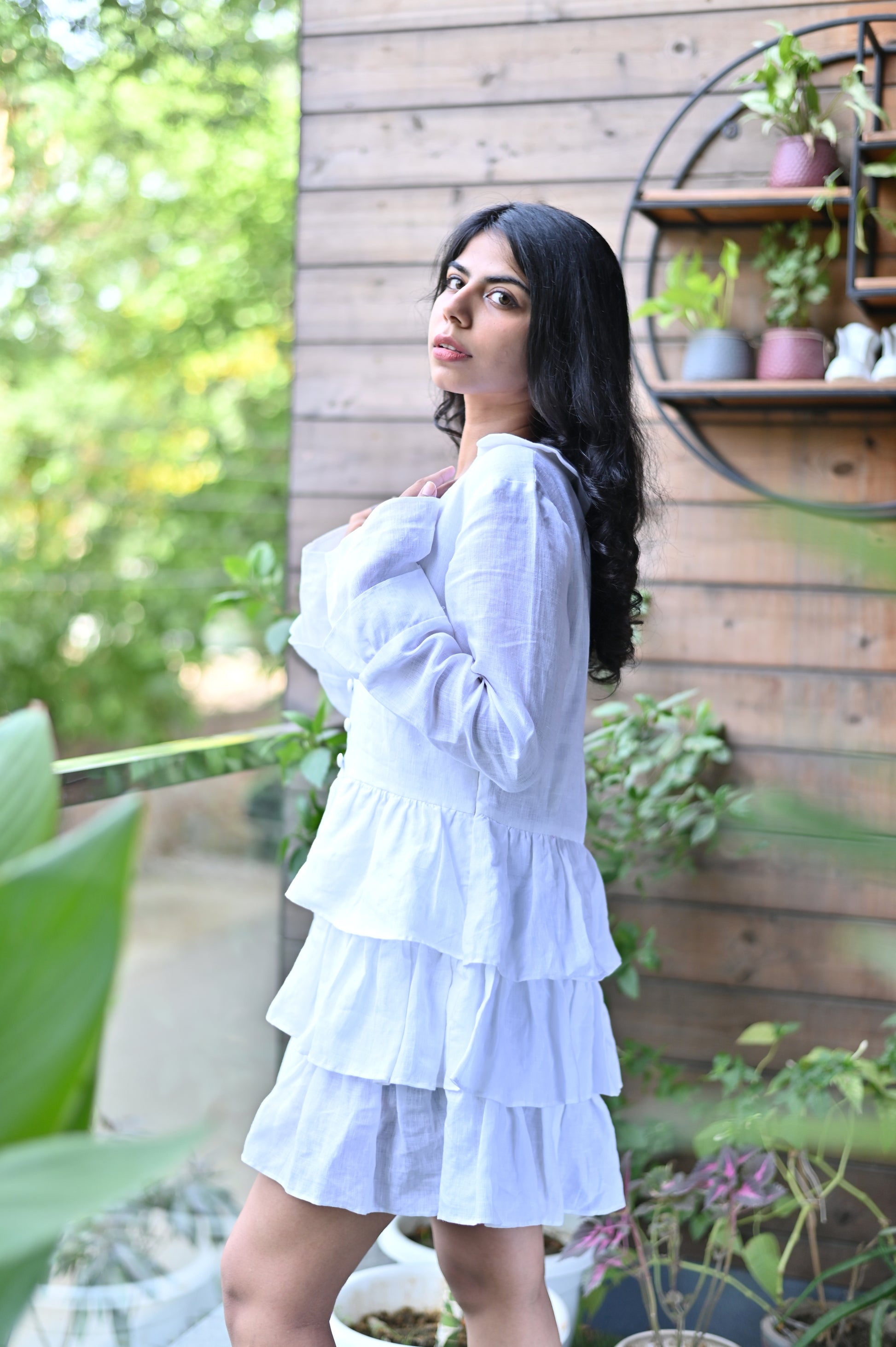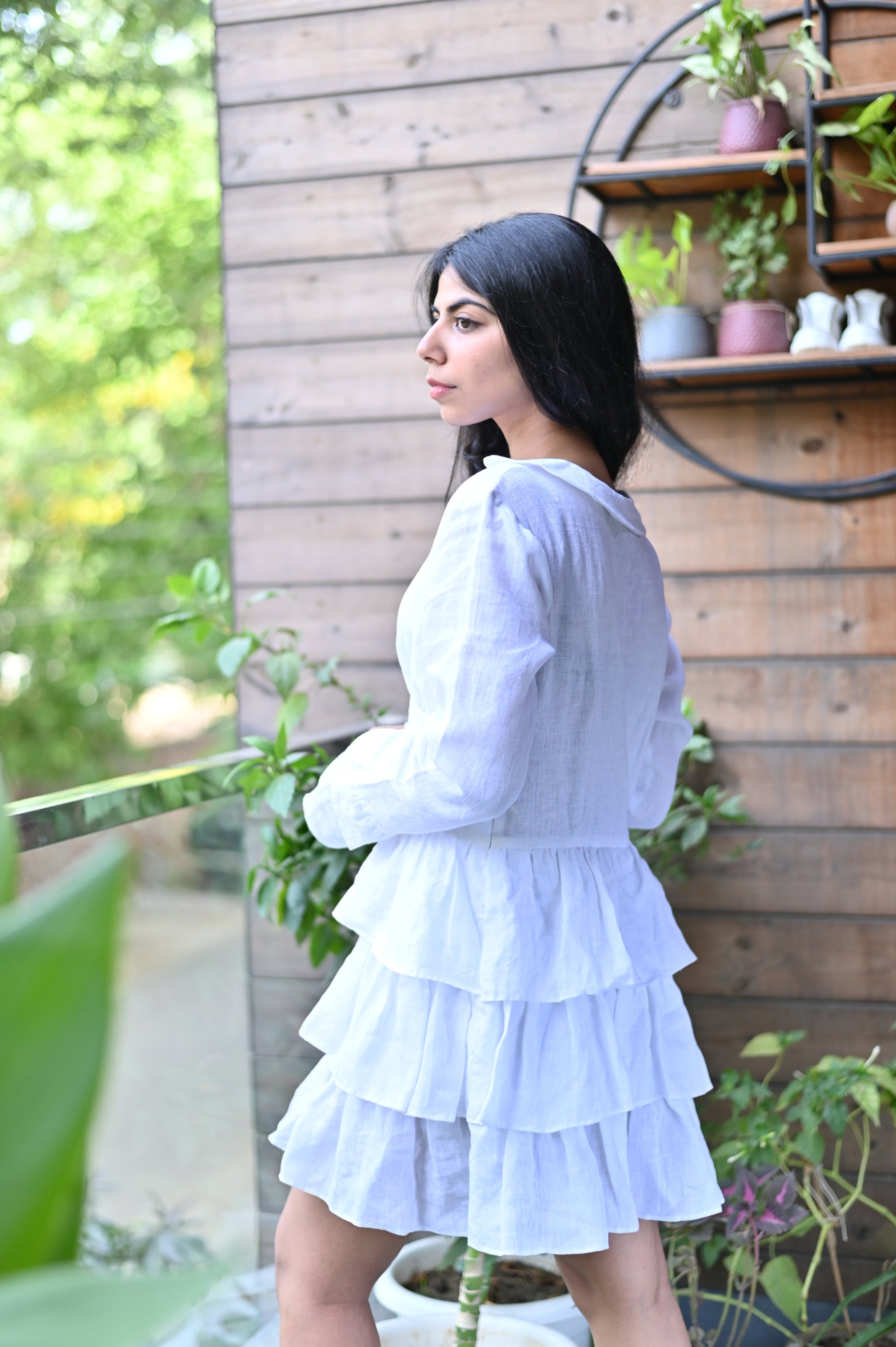 White Linen Layer Dress with several flowing gathers pinned, adding to the flounce and twirl of this summer dress.