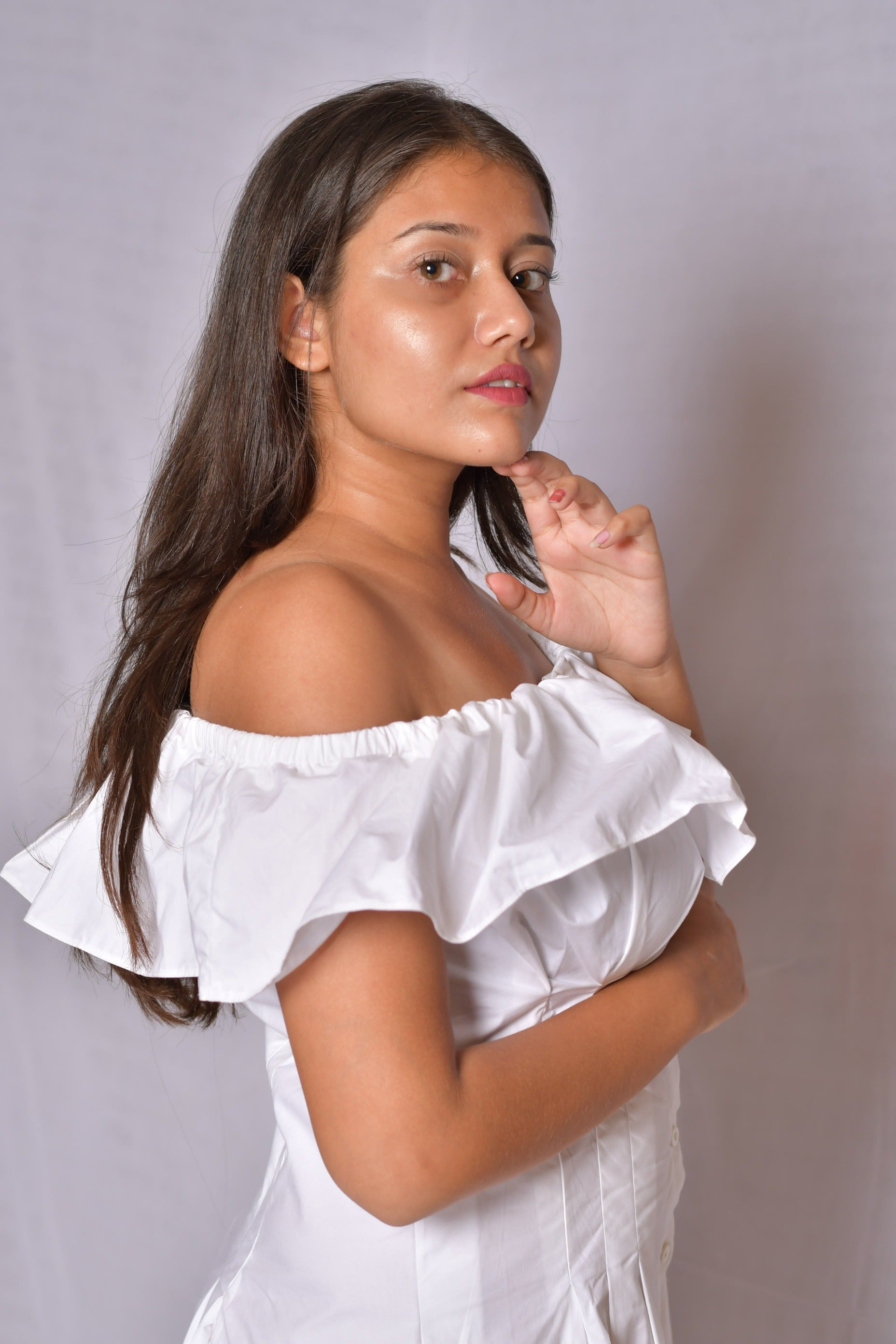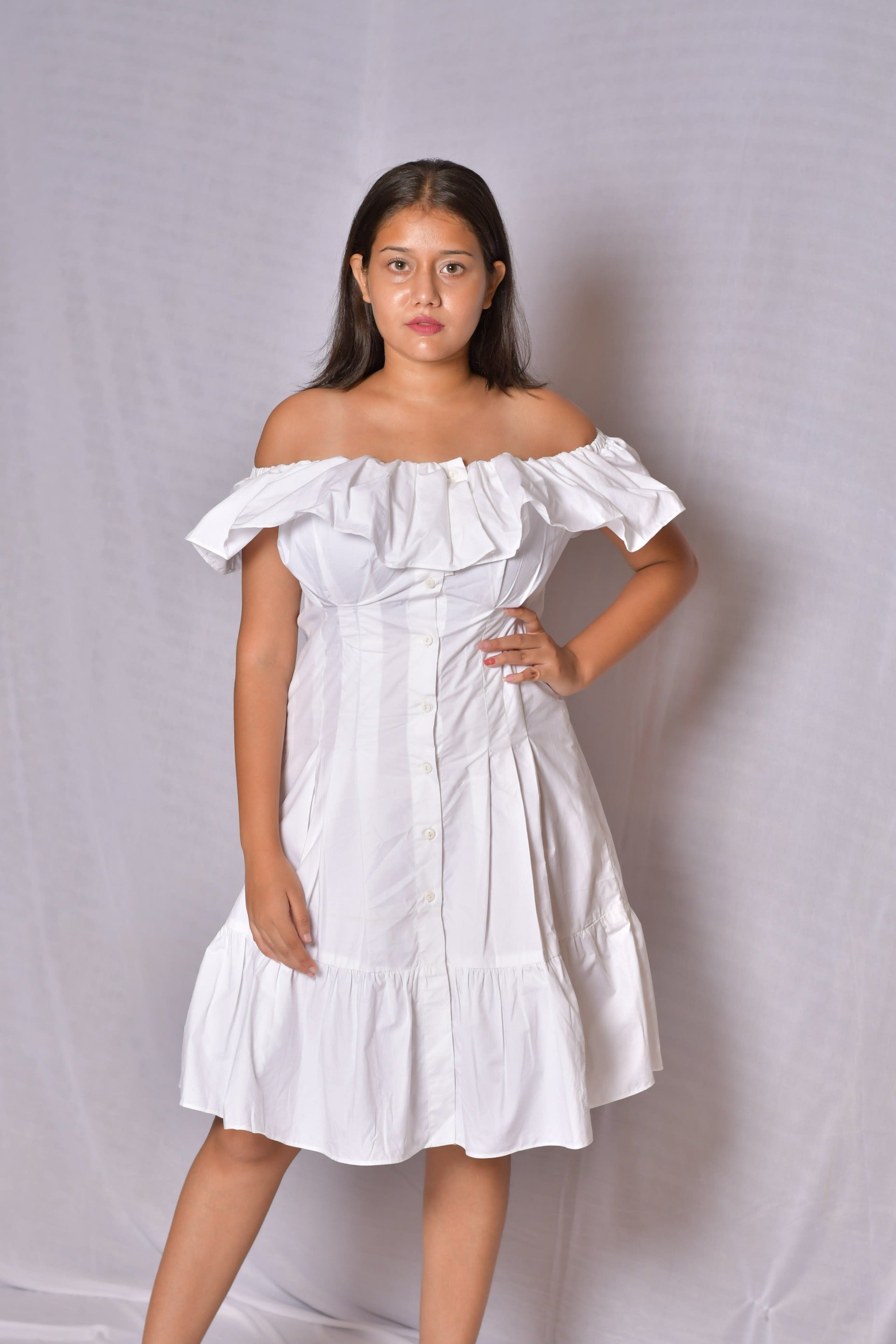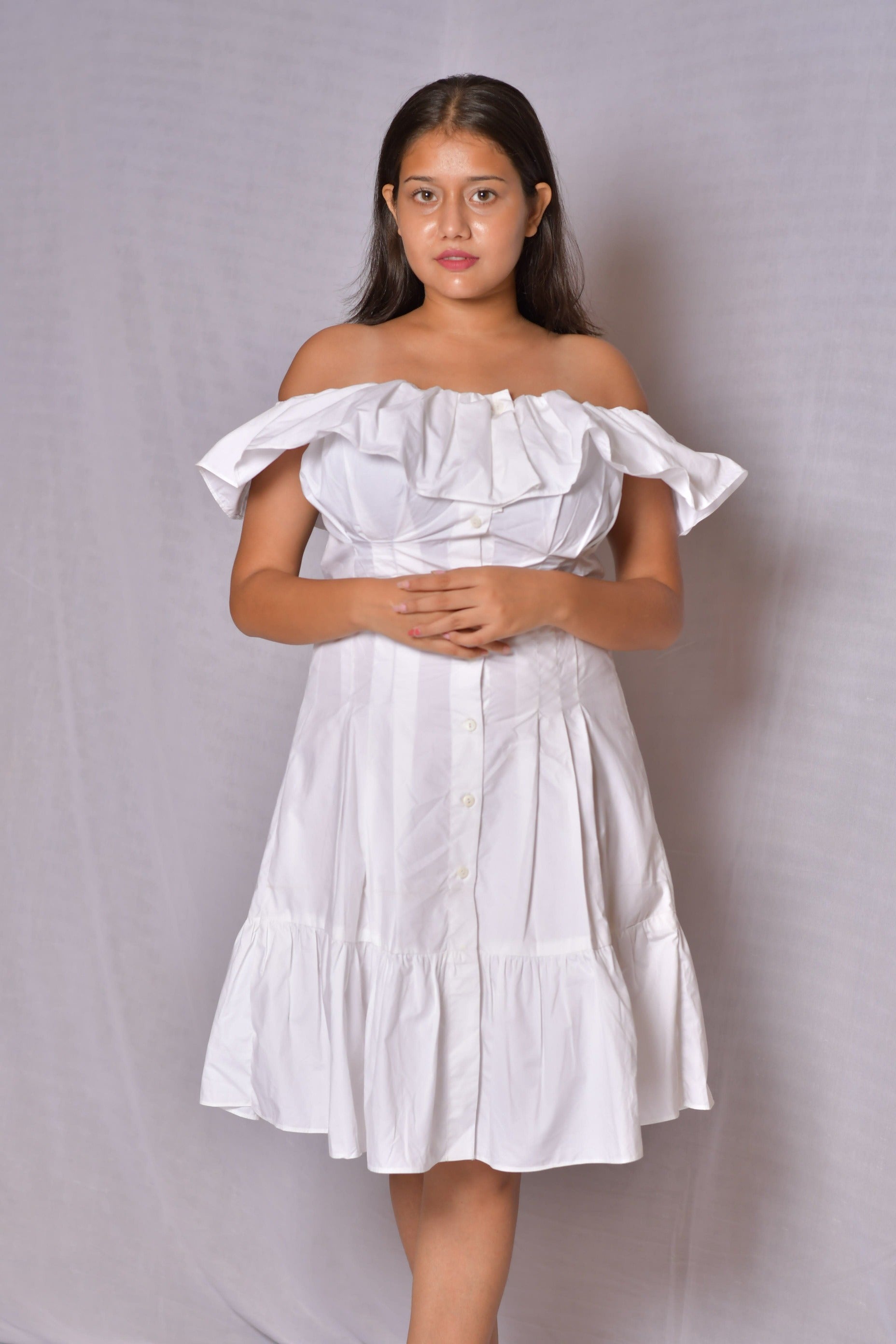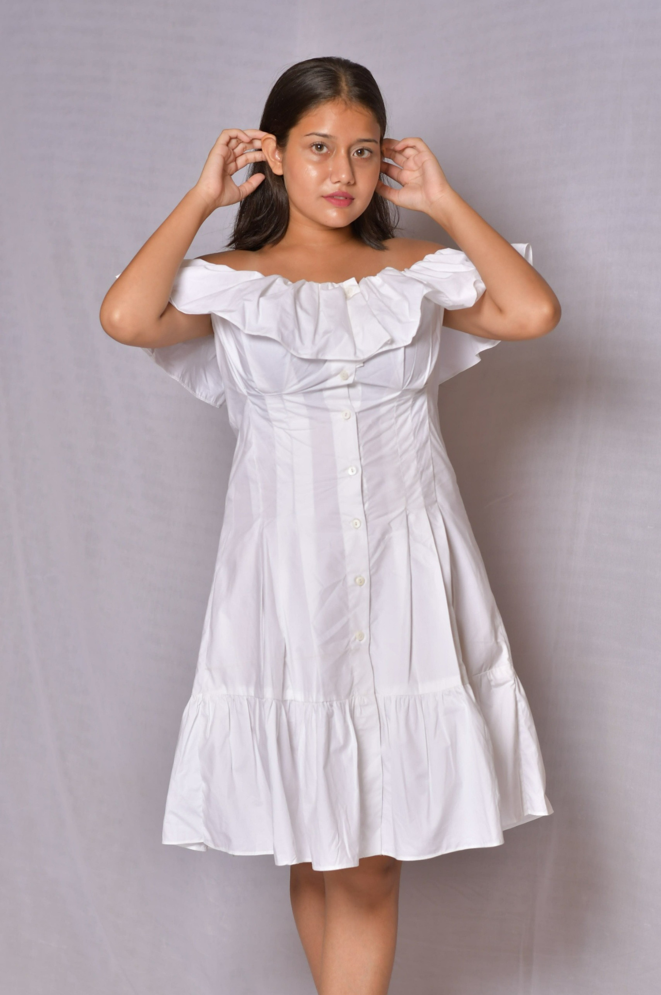 White cotton off shoulder dress , pin tucks silhouette with frill on the yoke and hem.
