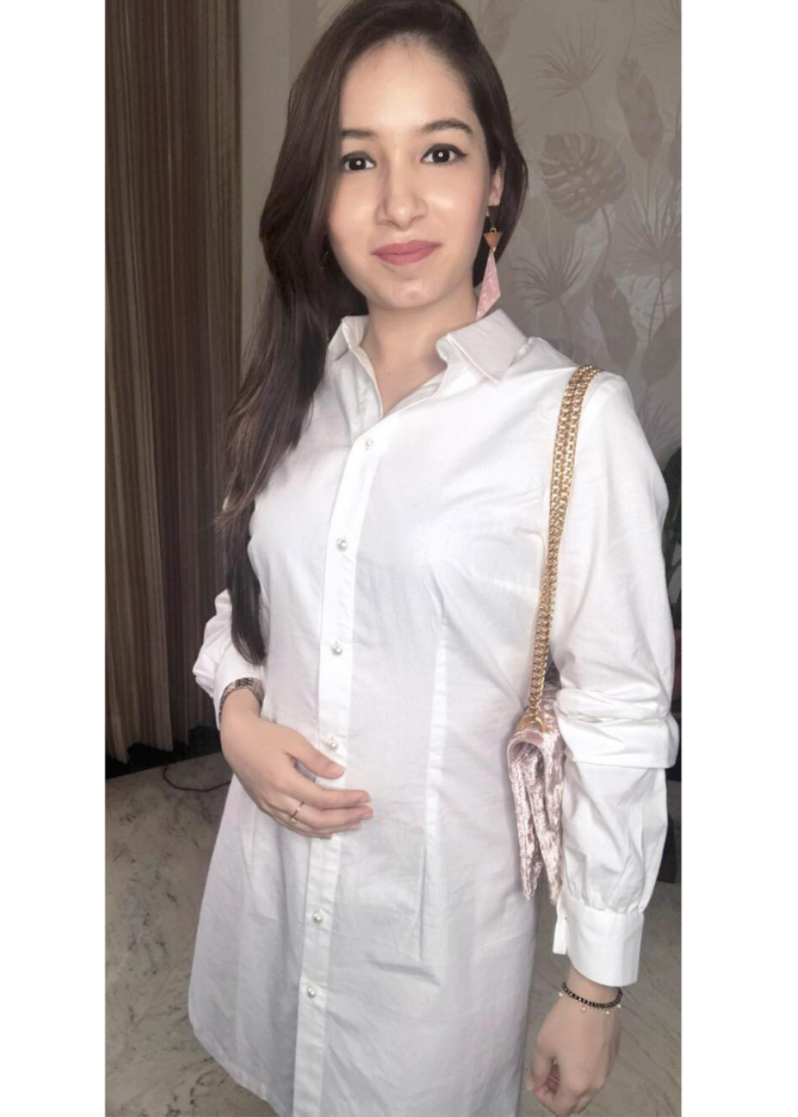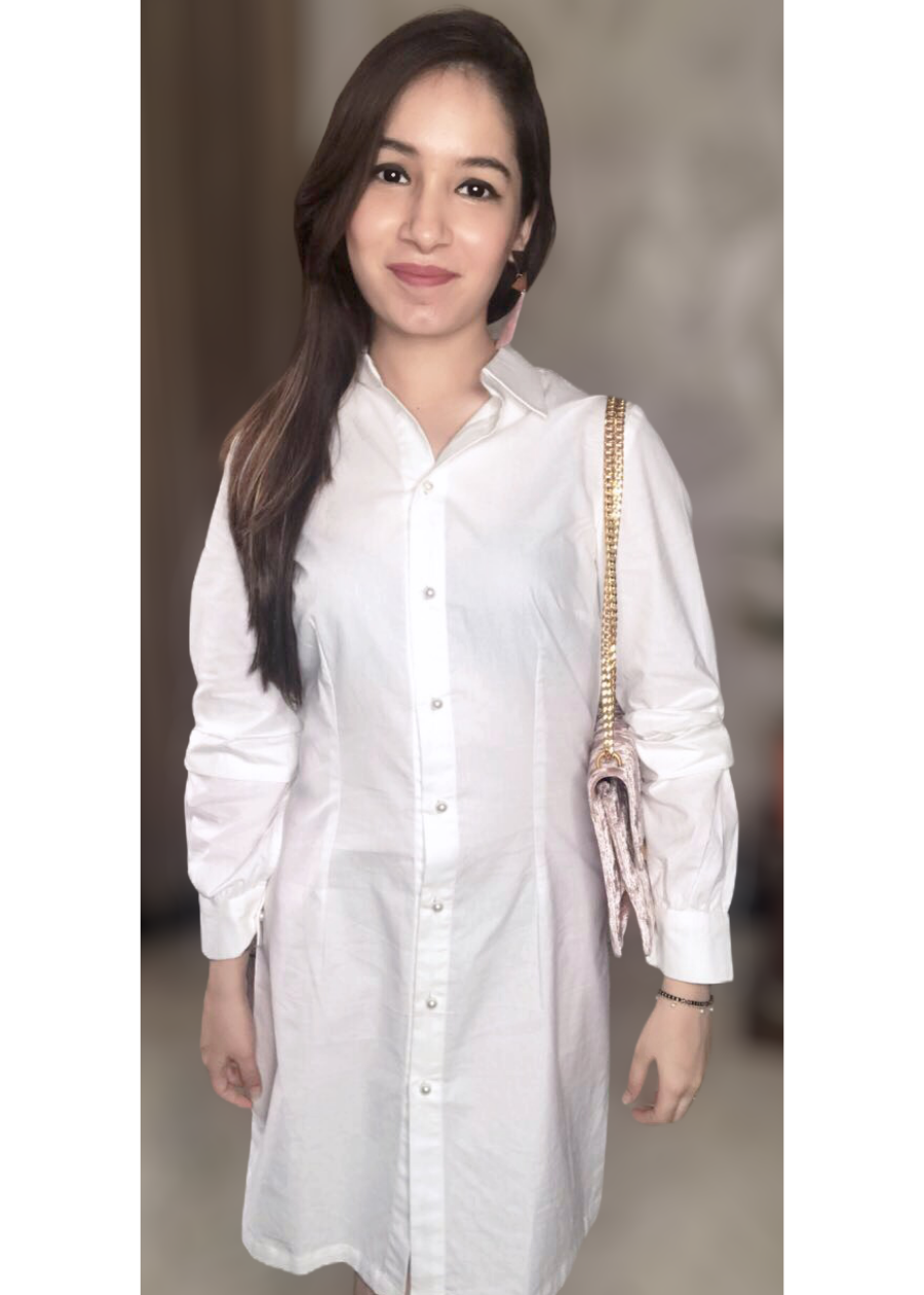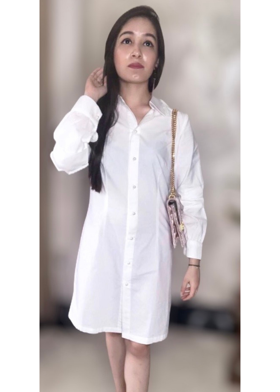 White classic front buttoned shirt dress with detailing on the sleeves.