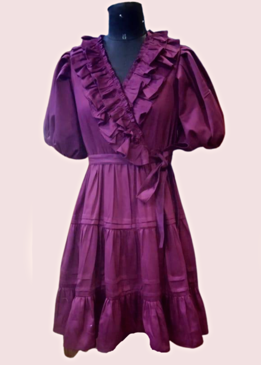 Wine ruffle dress, has all over ruffles from neck to bottom. It's a 3-tier dress with balloon sleeves.